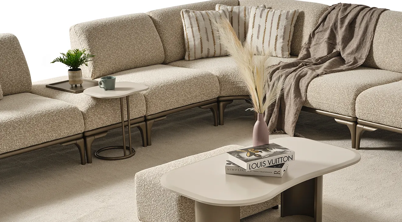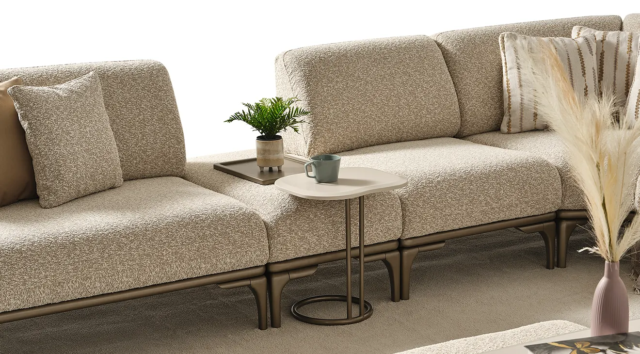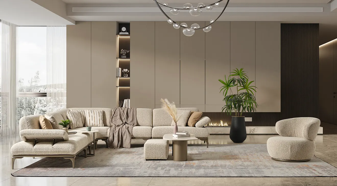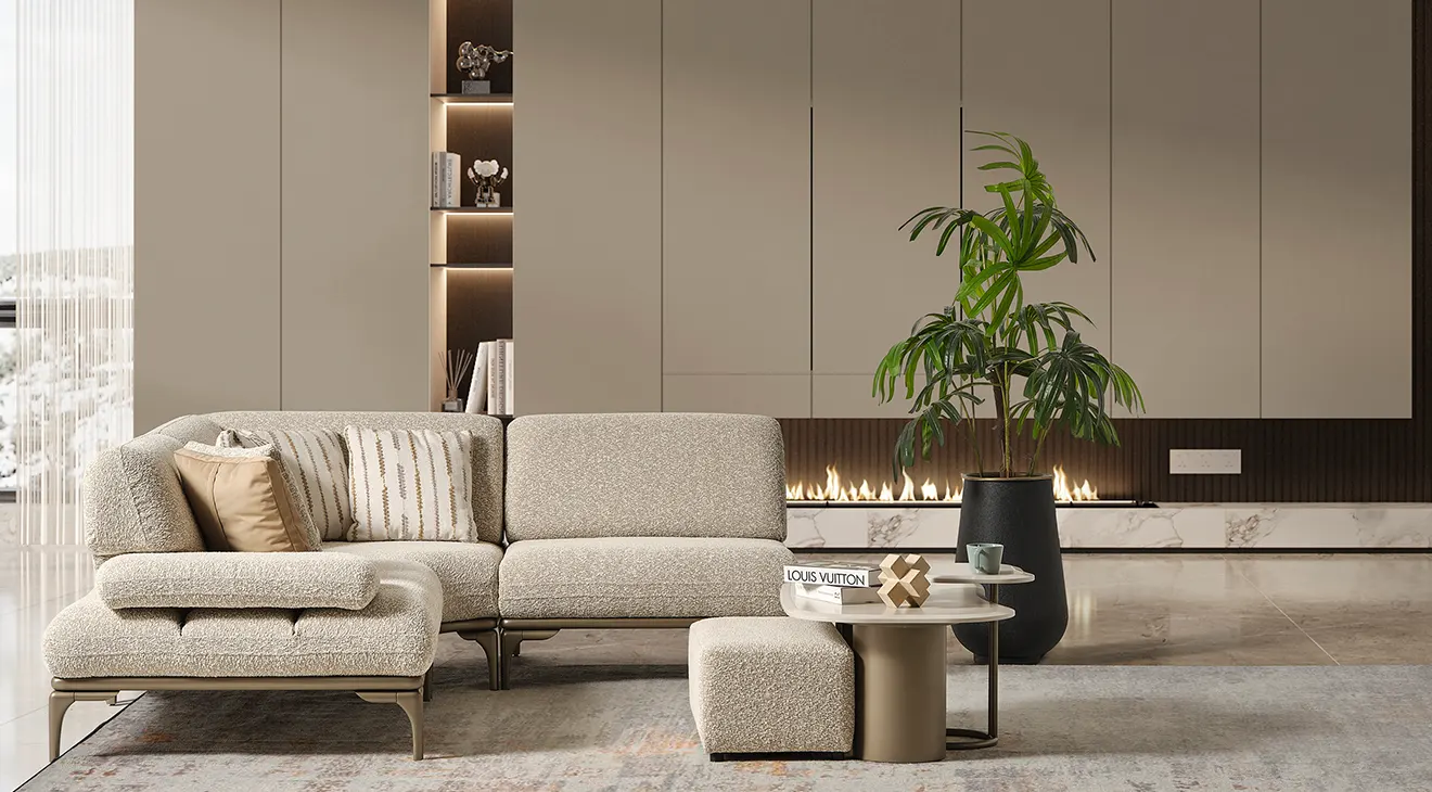 Frida Modern Köşe Koltuk Takımı, İnegöl mobilya kalitesiyle salonunuza zarafeti getiriyor. Yumuşak bouclé kumaş döşemesi ve ince metal ayaklarıyla modern bir dokunuş sunarken, ayarlanabilir mekanizmalı kolçakları ve modüler yapısı sayesinde konforu kişiselleştirmenize izin veriyor. Şık hatları ve geniş oturma alanıyla hem davetkar hem de fonksiyonel bir yaşam alanı yaratın.
