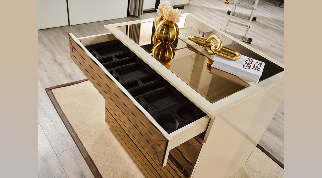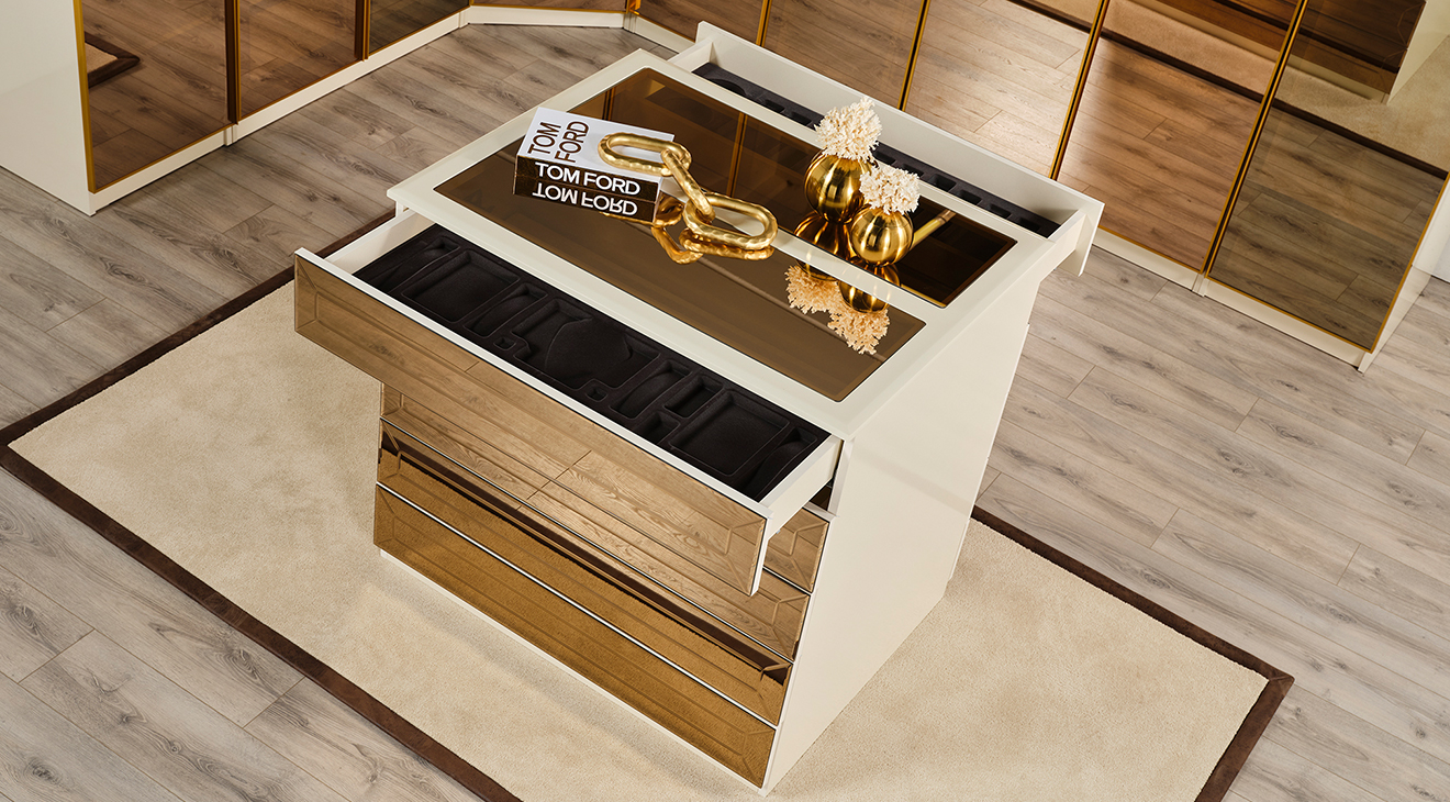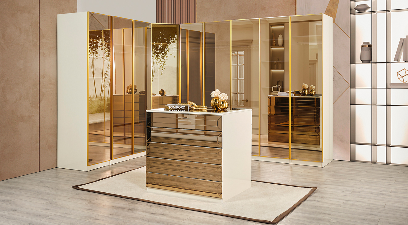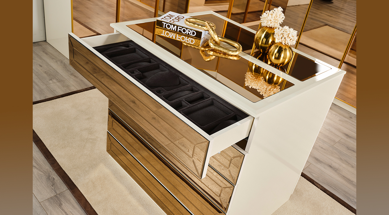 Mobilyamevime'deki özel İnegöl Mobilyası koleksiyonumuzdan ada şifonyerli Gold Giyinme Odası'nı keşfedin. Modern tasarımı, aytaşı detayları ve gold rengi ile dikkat çeken bu giyinme odası, evinize şıklık katacaktır.