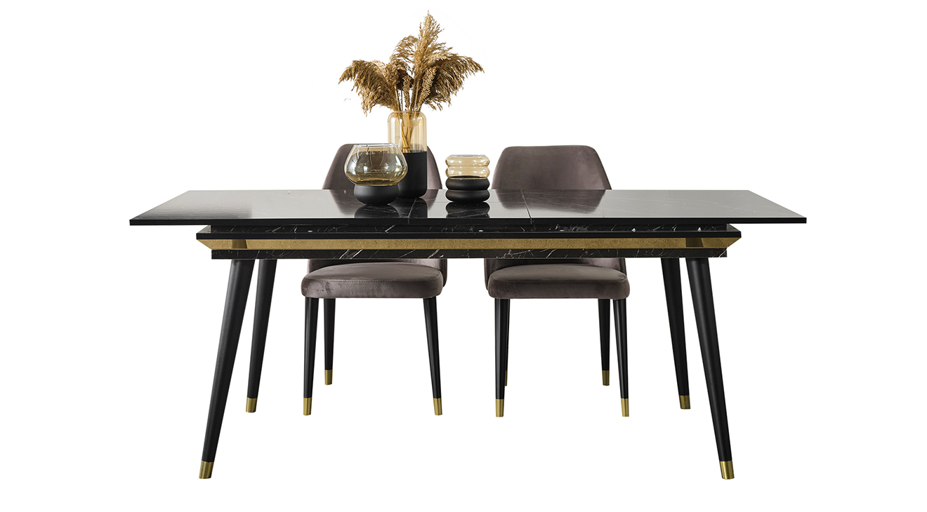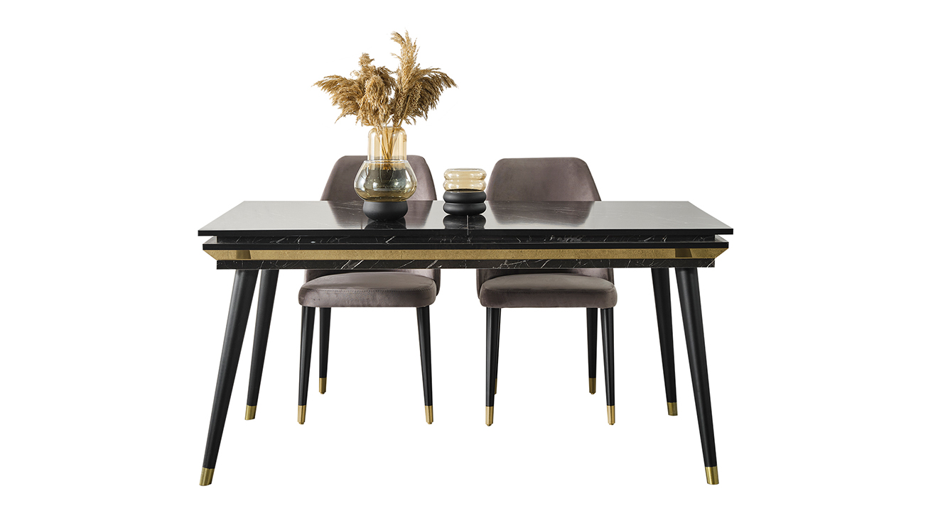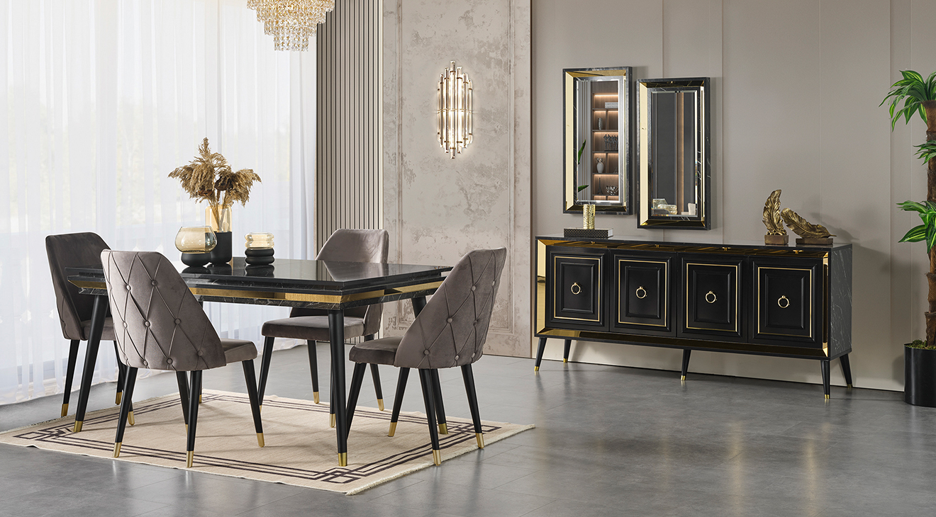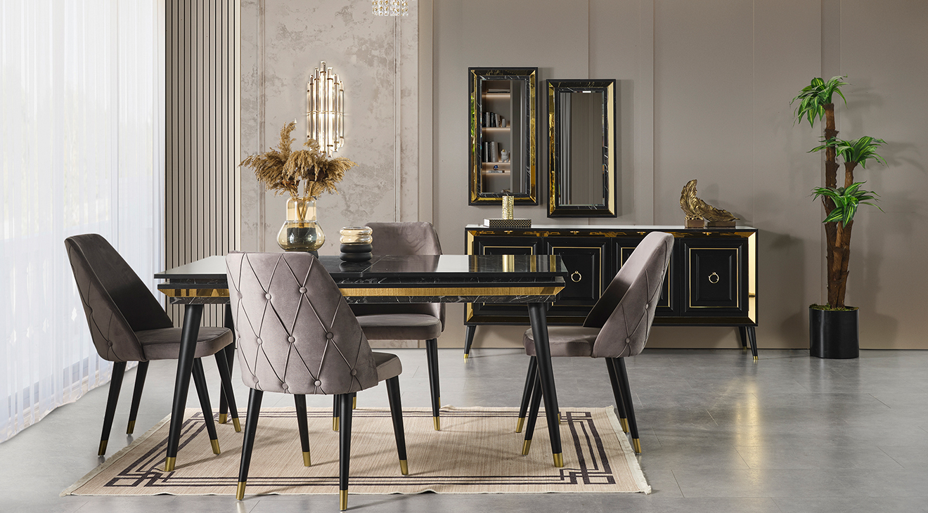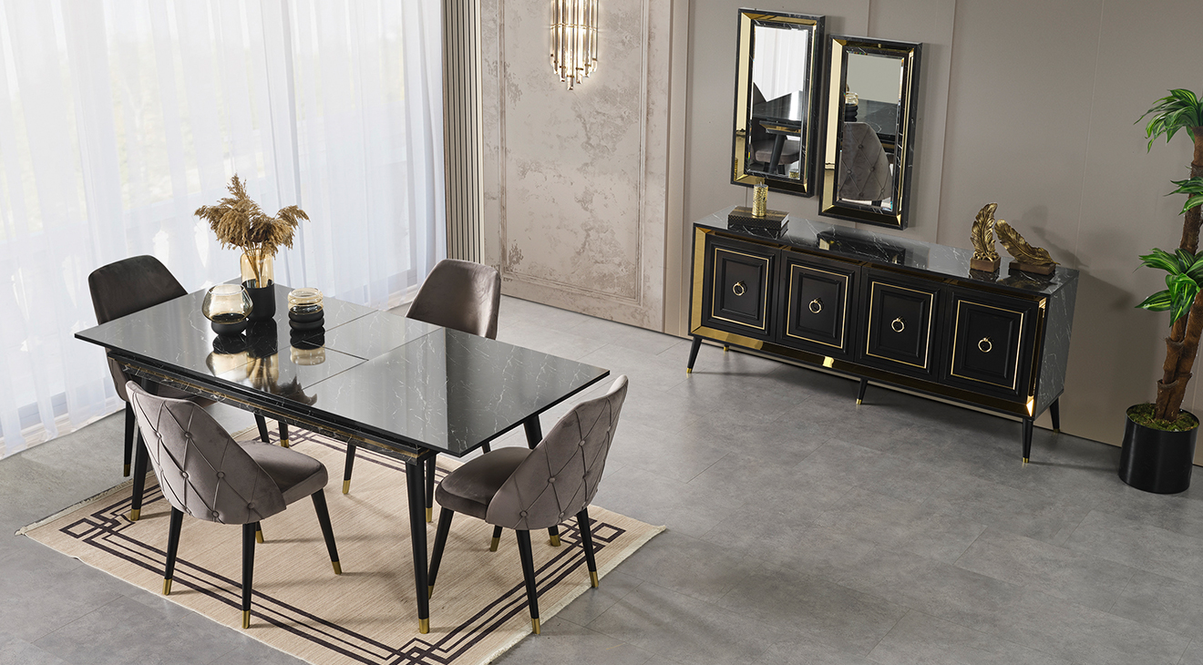 İnegöl'den özel üretim Granit Antrasit Yemek Odası Takımı; ahşap ayaklar, antrasit renk, gold detaylar ve mermer deseni ile modern bir tasarım sunar. Şimdi Mobilyamevime.com'da.