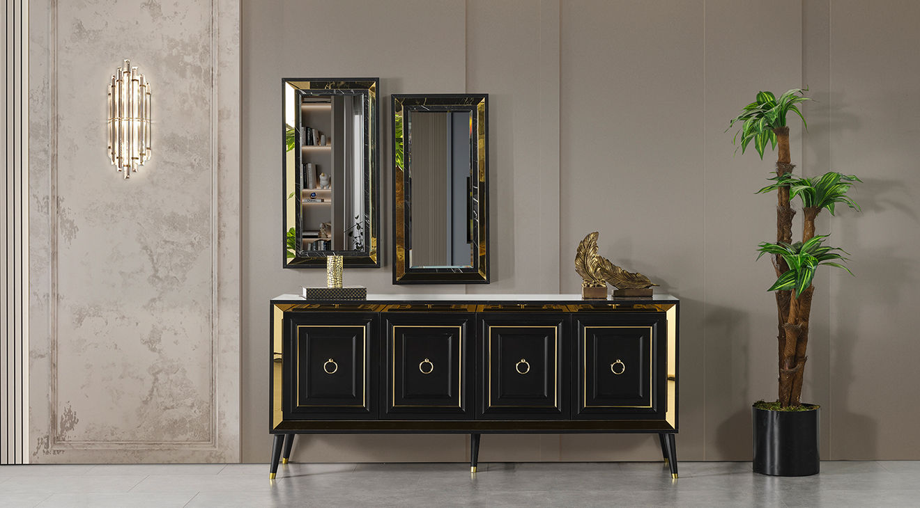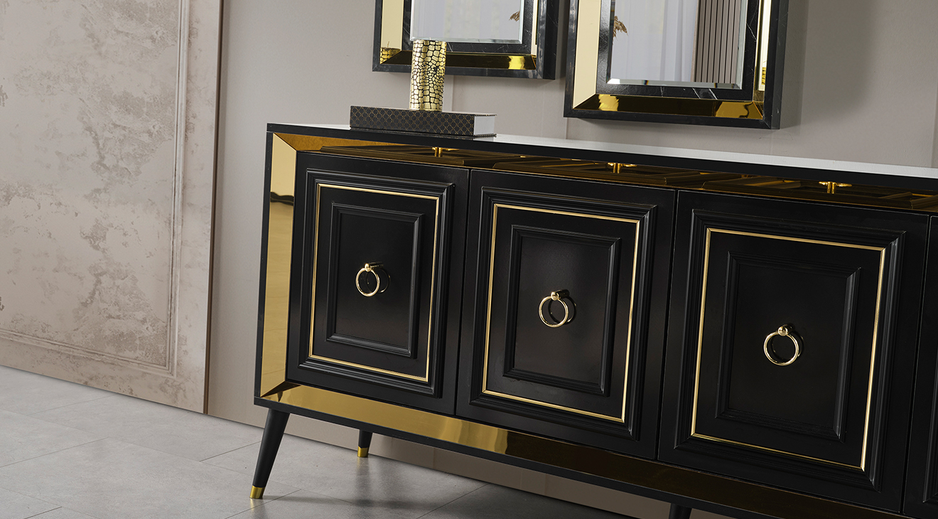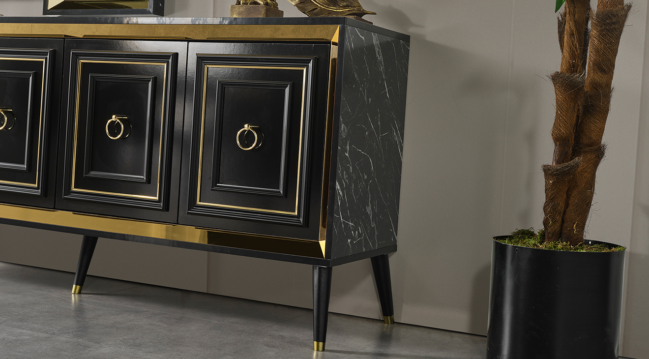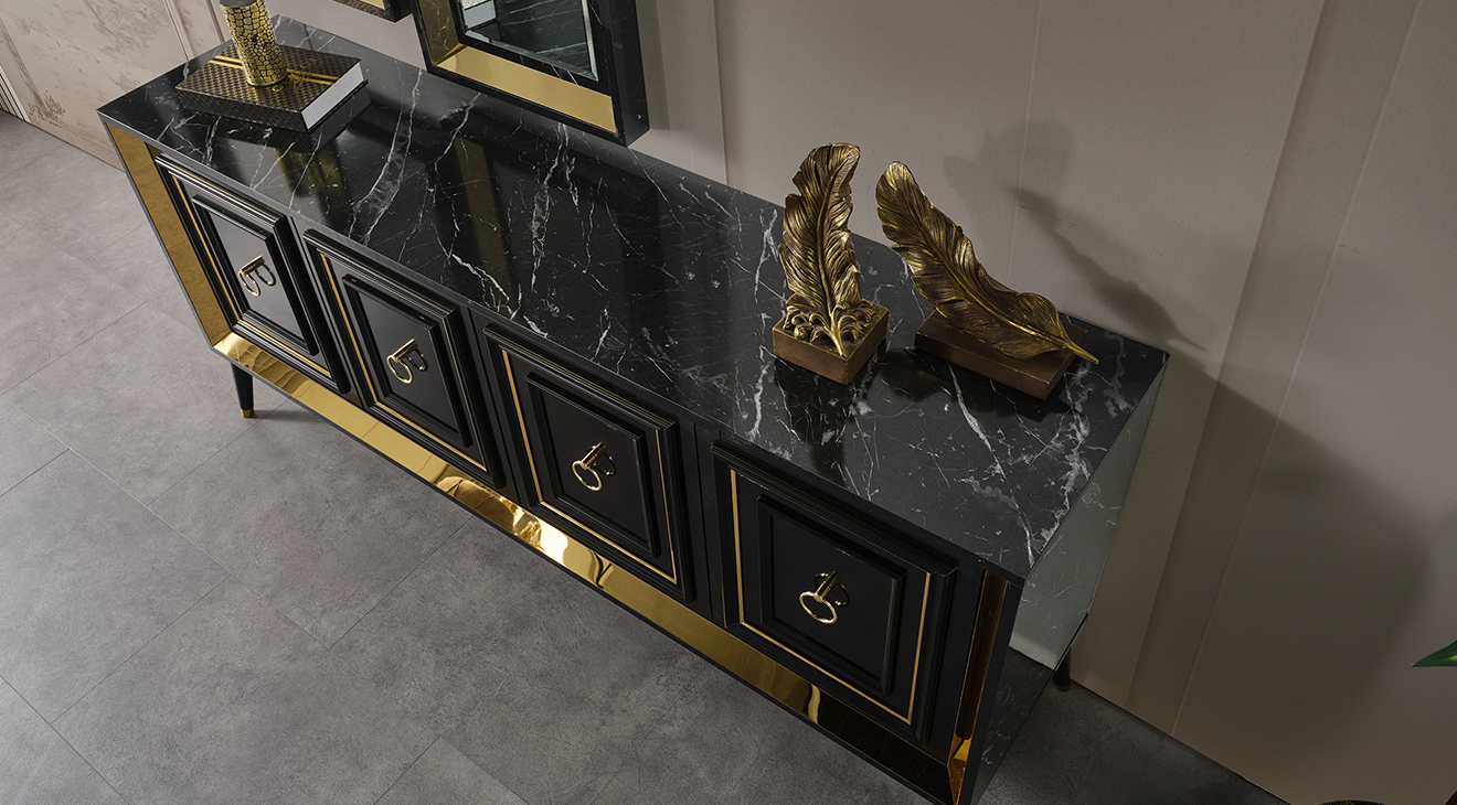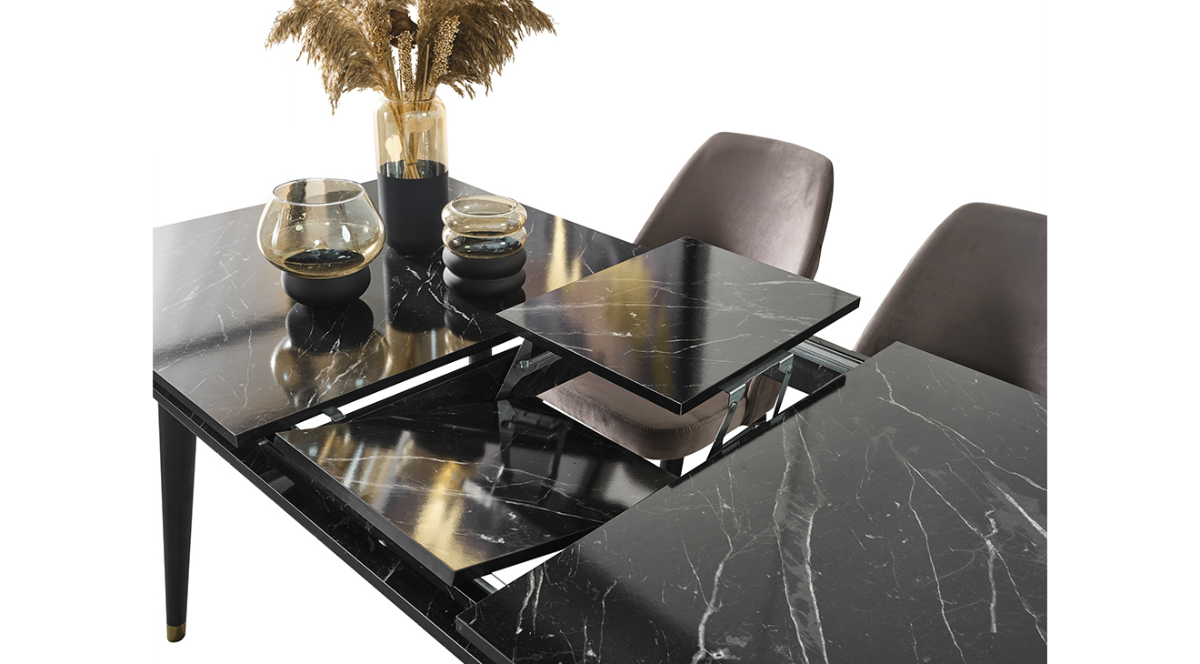 İnegöl'den özel üretim Granit Antrasit Yemek Odası Takımı; ahşap ayaklar, antrasit renk, gold detaylar ve mermer deseni ile modern bir tasarım sunar. Şimdi Mobilyamevime.com'da.