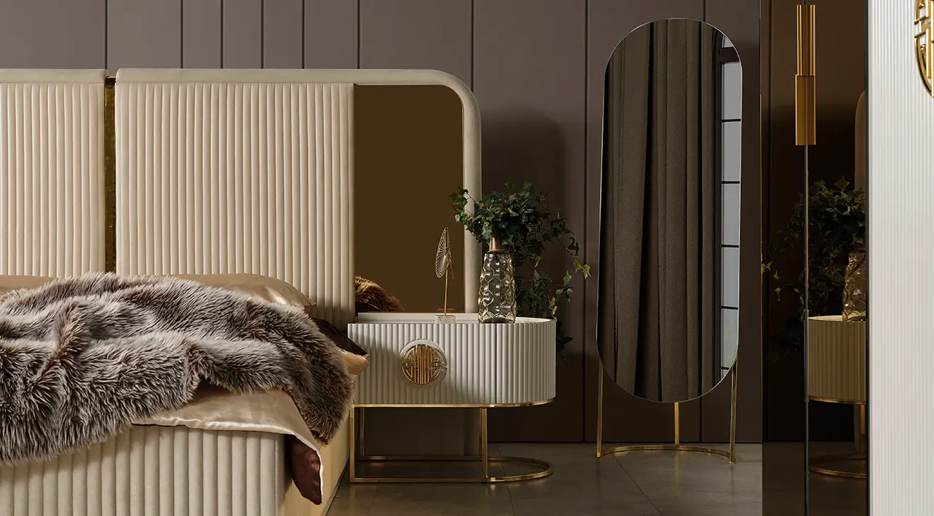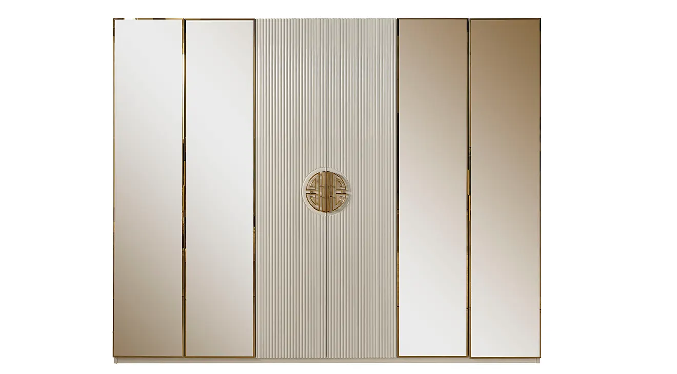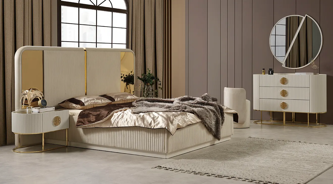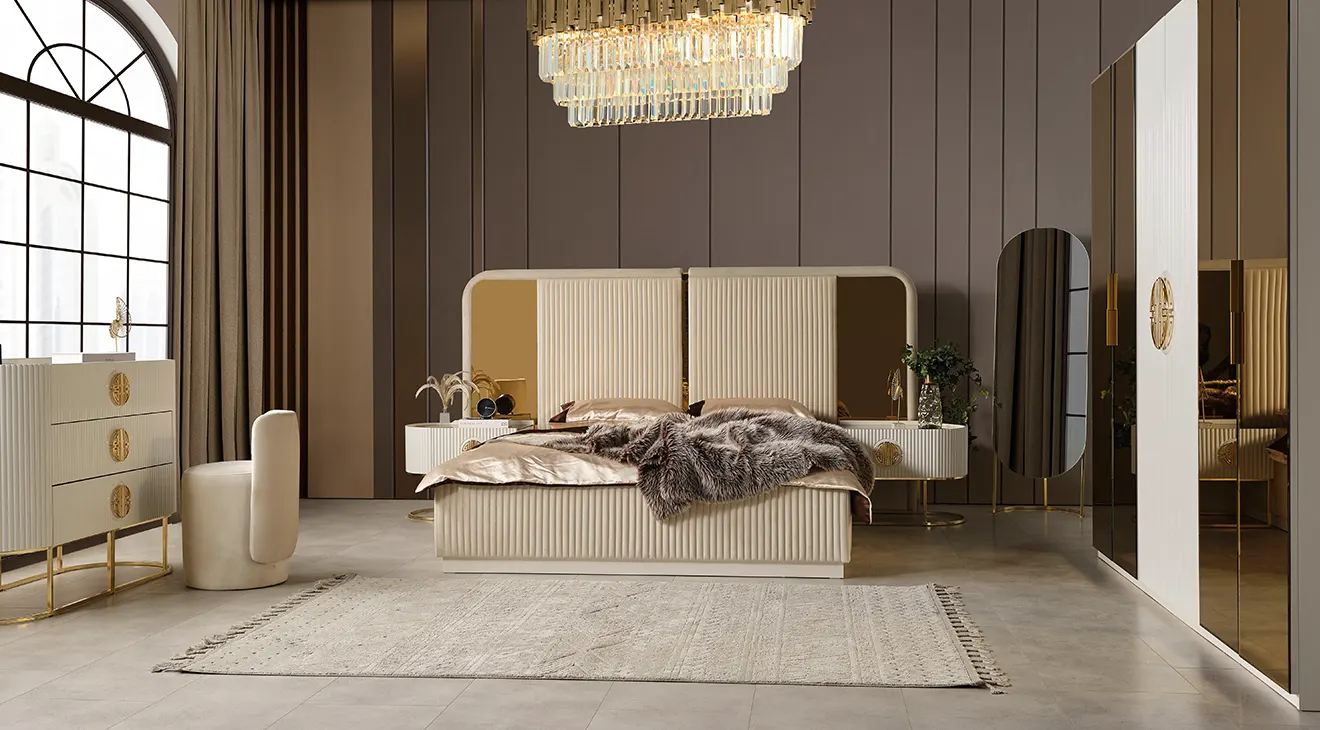 Gucci 6 Kapaklı Yatak Odası Takımı; aynalı 6 kapaklı gardırop, bazalı karyola, şifonyer ve komodinle modern-lüks stil sunar. İnegöl mobilya kalitesi ve dayanıklılığıyla yatak odası şıklığını tamamlar.