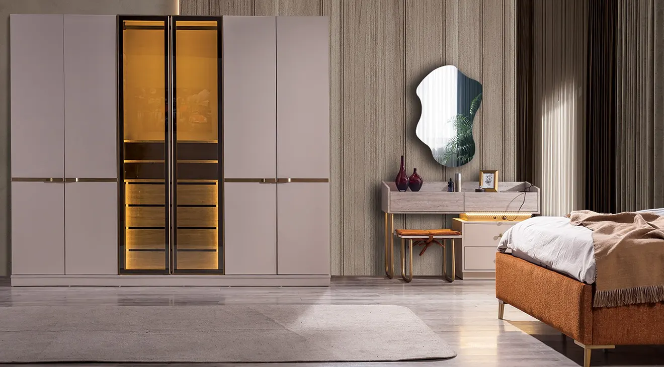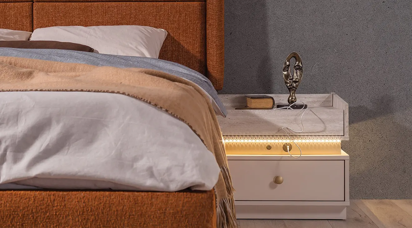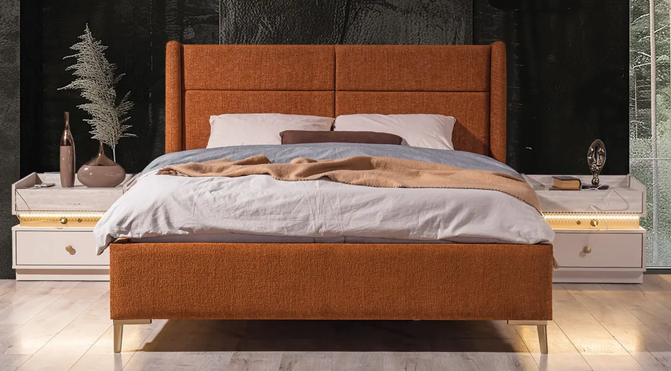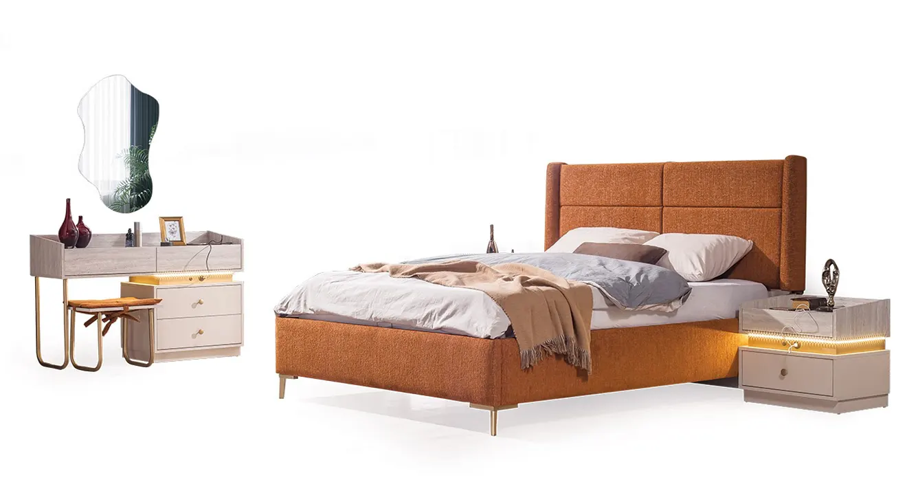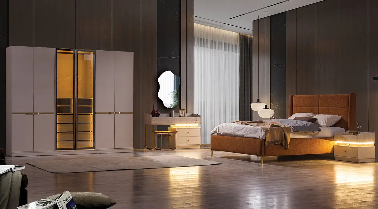 Hamra 6 Kapaklı Yatak Odası Takımı, sıcak turuncu döşemeli geniş başlığı ve alt LED aydınlatmalı baza detayıyla fark yaratıyor. Altın tonlu kulplar ve cam kapaklı gardırop iç aydınlatması, zarif bir dokunuş katarken; mermer görünümlü komodin ve modern şifonyerle eksiksiz bir uyum sağlıyor.