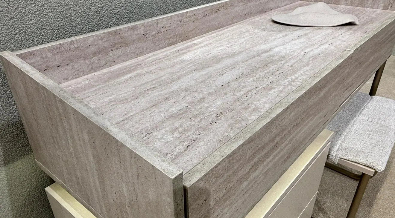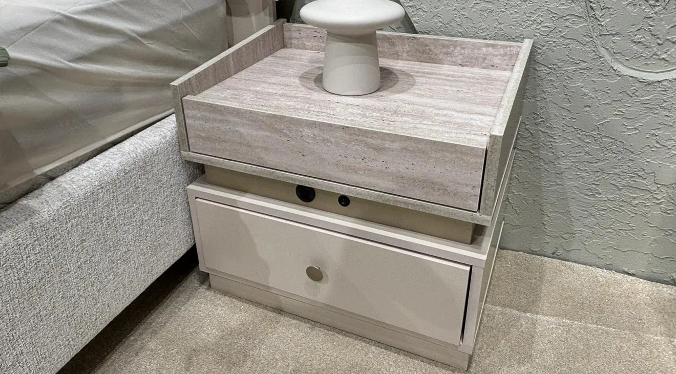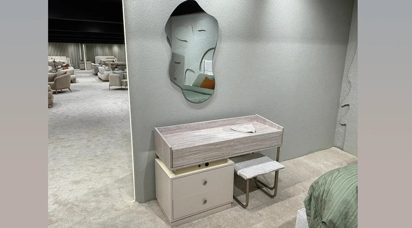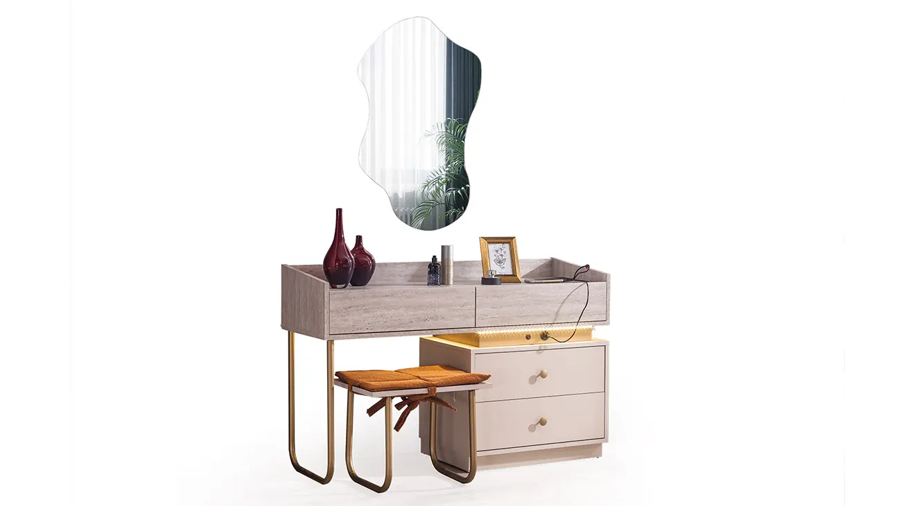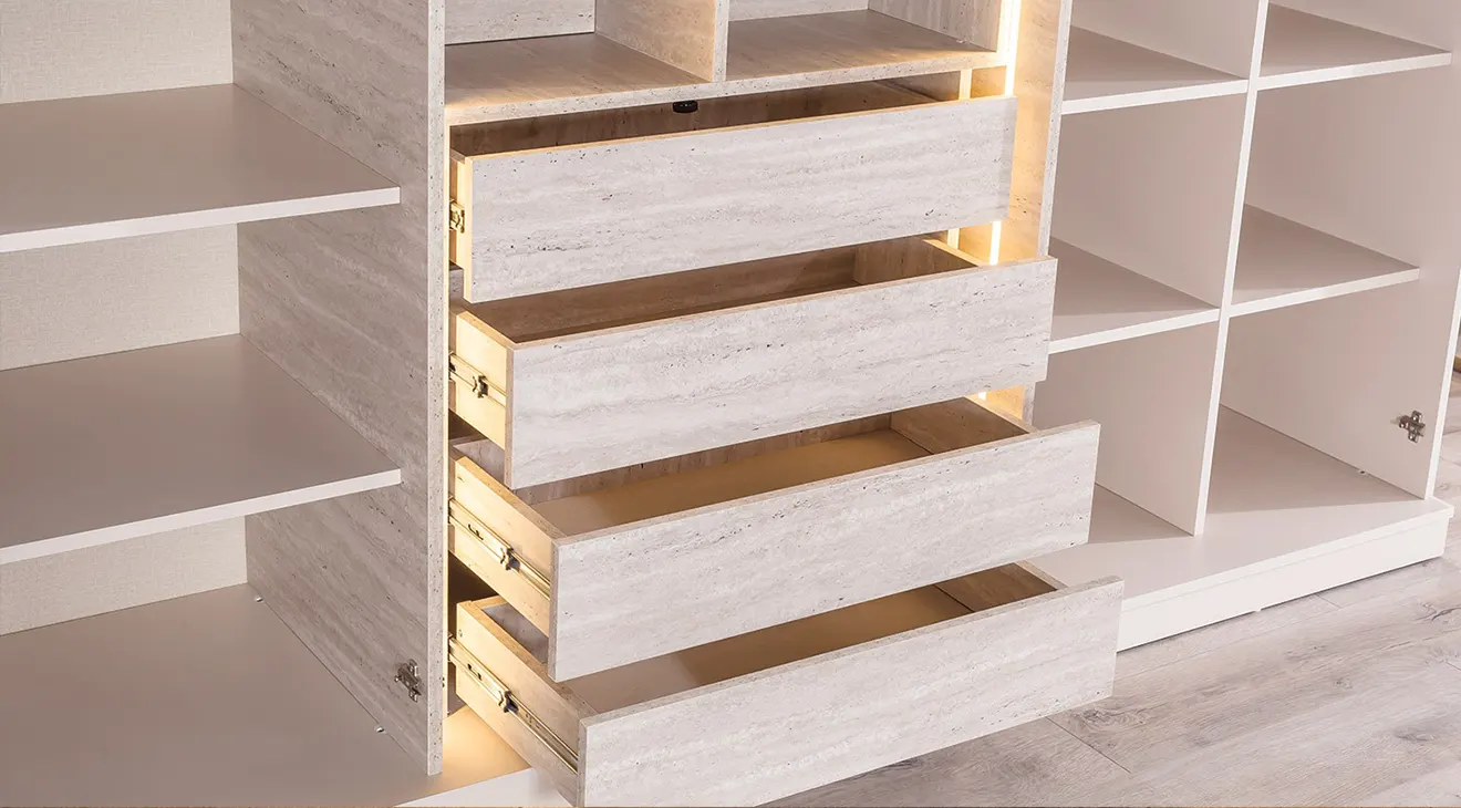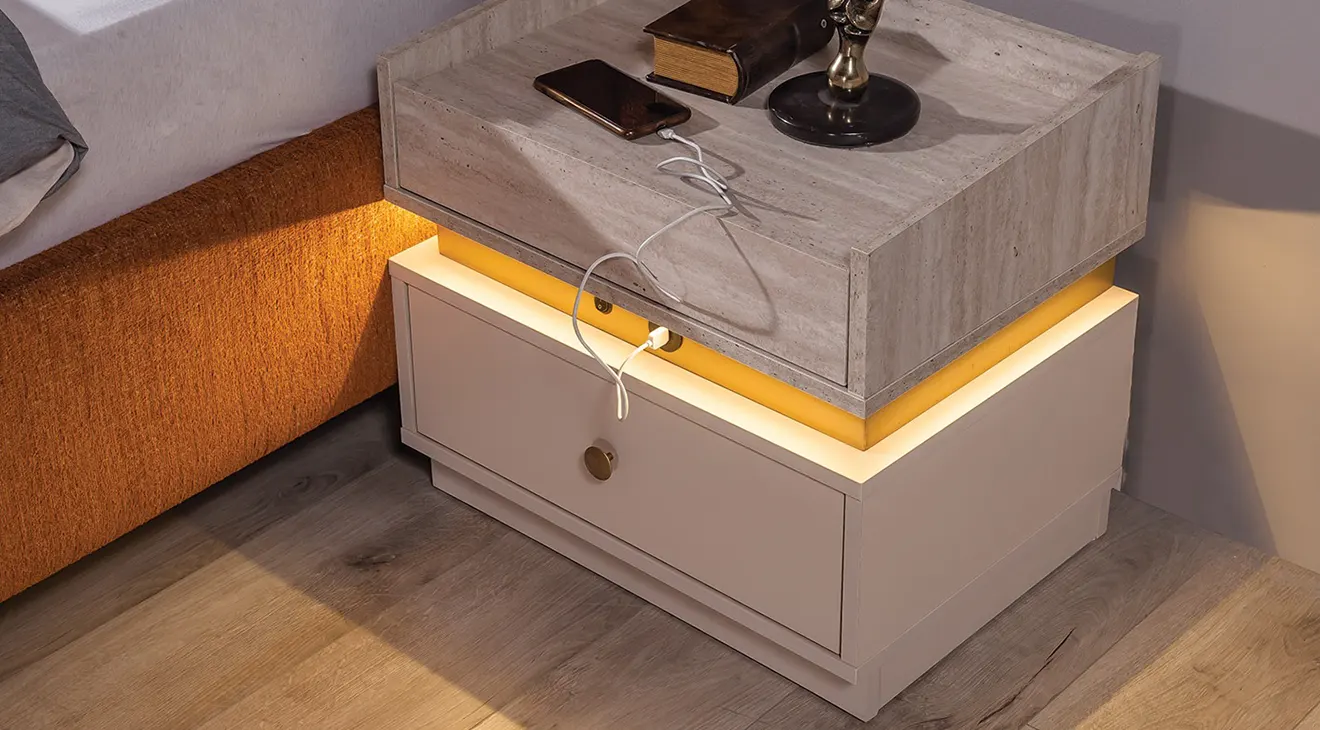 Hamra 6 Kapaklı Yatak Odası Takımı, sıcak turuncu döşemeli geniş başlığı ve alt LED aydınlatmalı baza detayıyla fark yaratıyor. Altın tonlu kulplar ve cam kapaklı gardırop iç aydınlatması, zarif bir dokunuş katarken; mermer görünümlü komodin ve modern şifonyerle eksiksiz bir uyum sağlıyor.