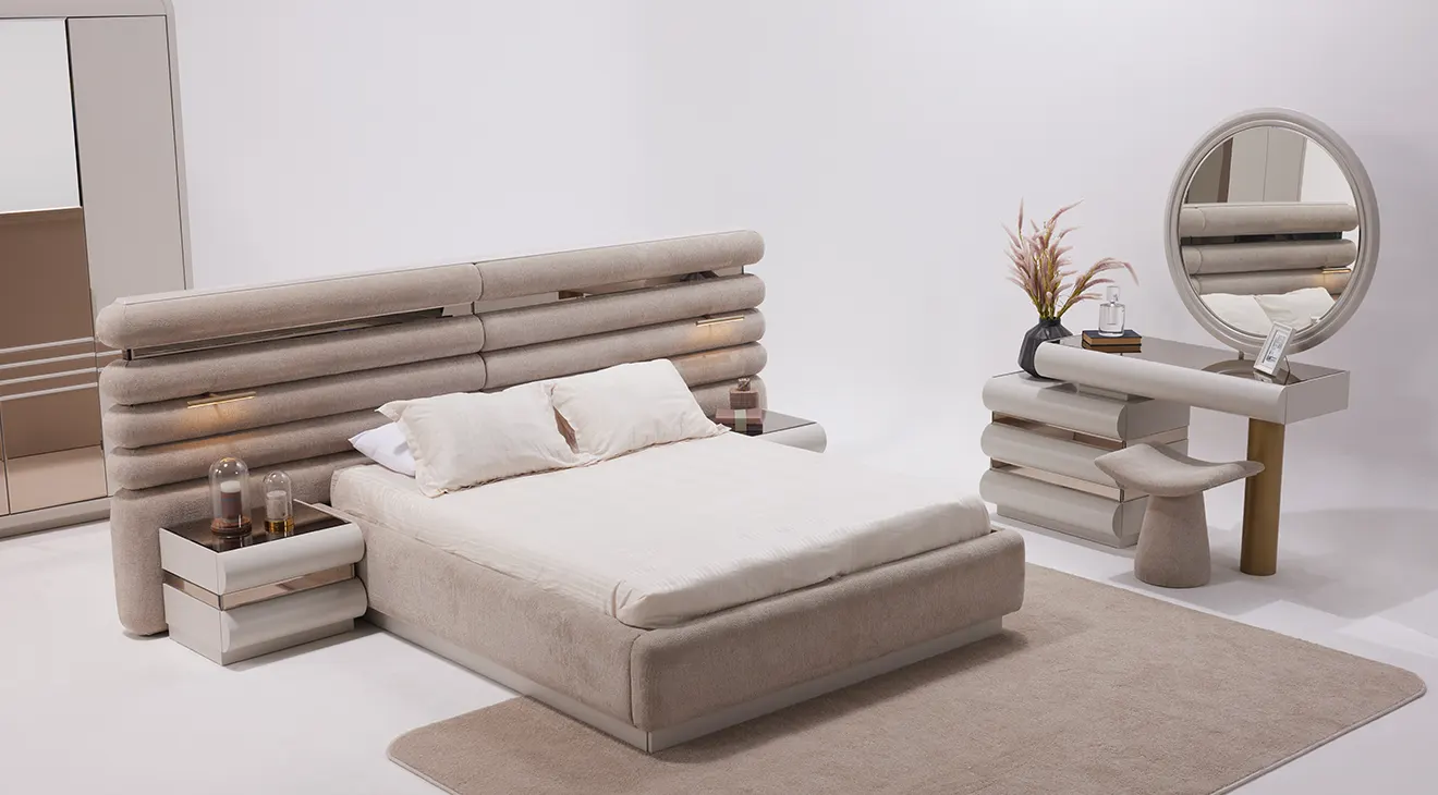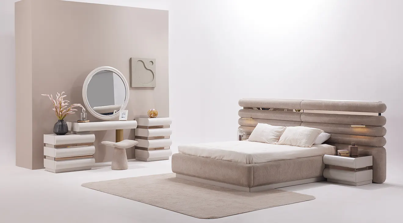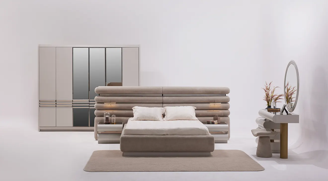Hermosa 6 Kapaklı Yatak Odası Takımı, bej tonlu kumaşla kaplı geniş platform karyolası ve yatay çizgili, LED aydınlatmalı başlığıyla modern bir konfor alanı yaratır. Altı kapılı gardırop; aynalı ortalama kapakları, soft‑close menteşeleri ve şık metal şerit detaylarıyla fonksiyonel depolama sunar. Silindir ayaklı şifonyer ve yuvarlak makyaj aynası, zarif hatlarıyla yatak odanıza sofistike bir dokunuş katar.