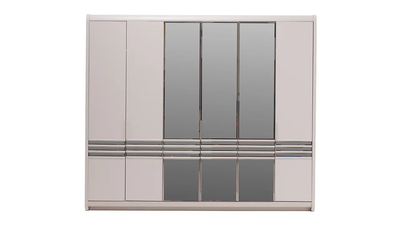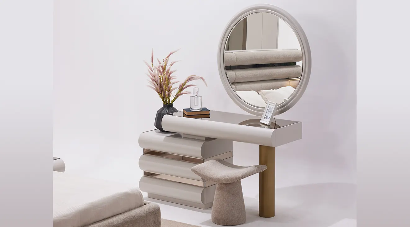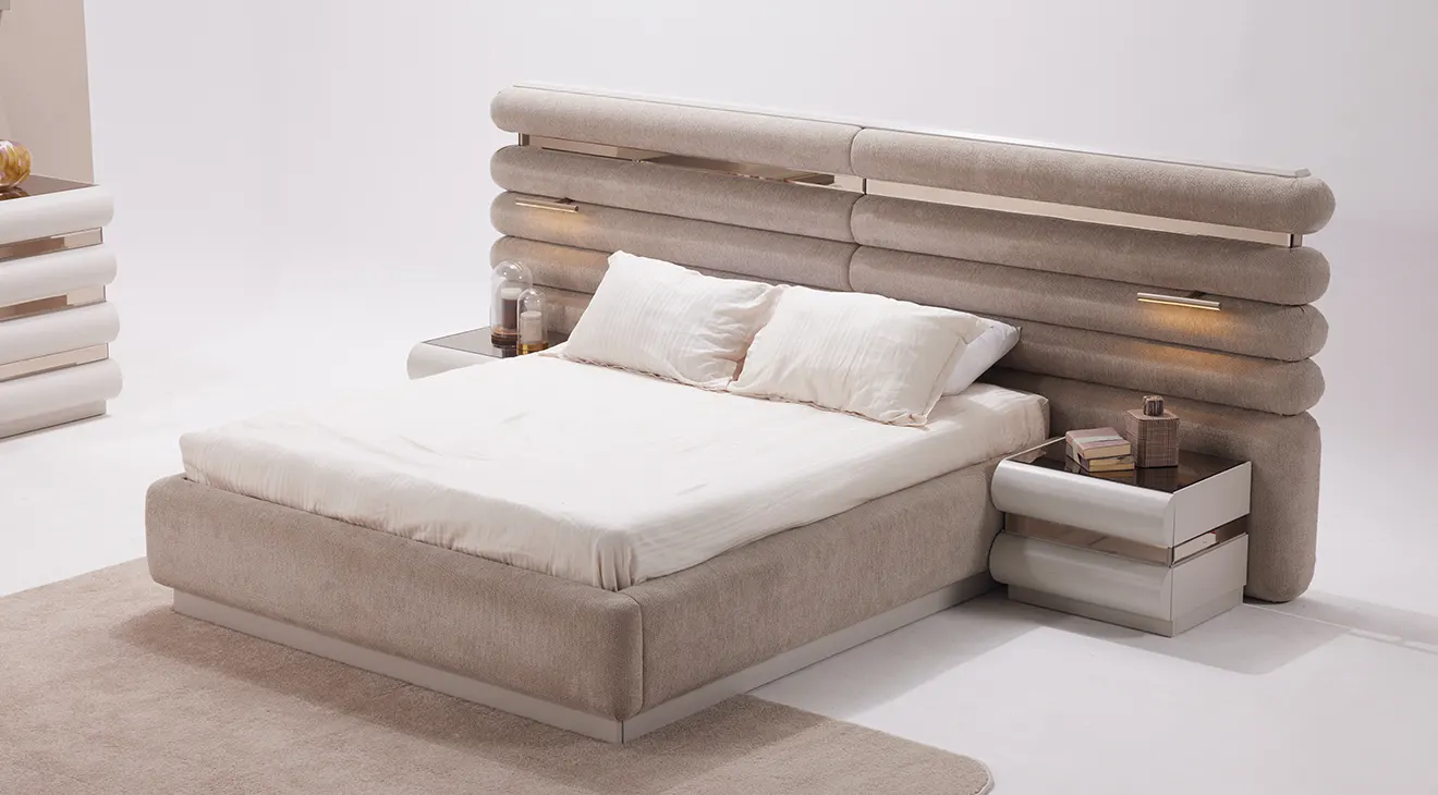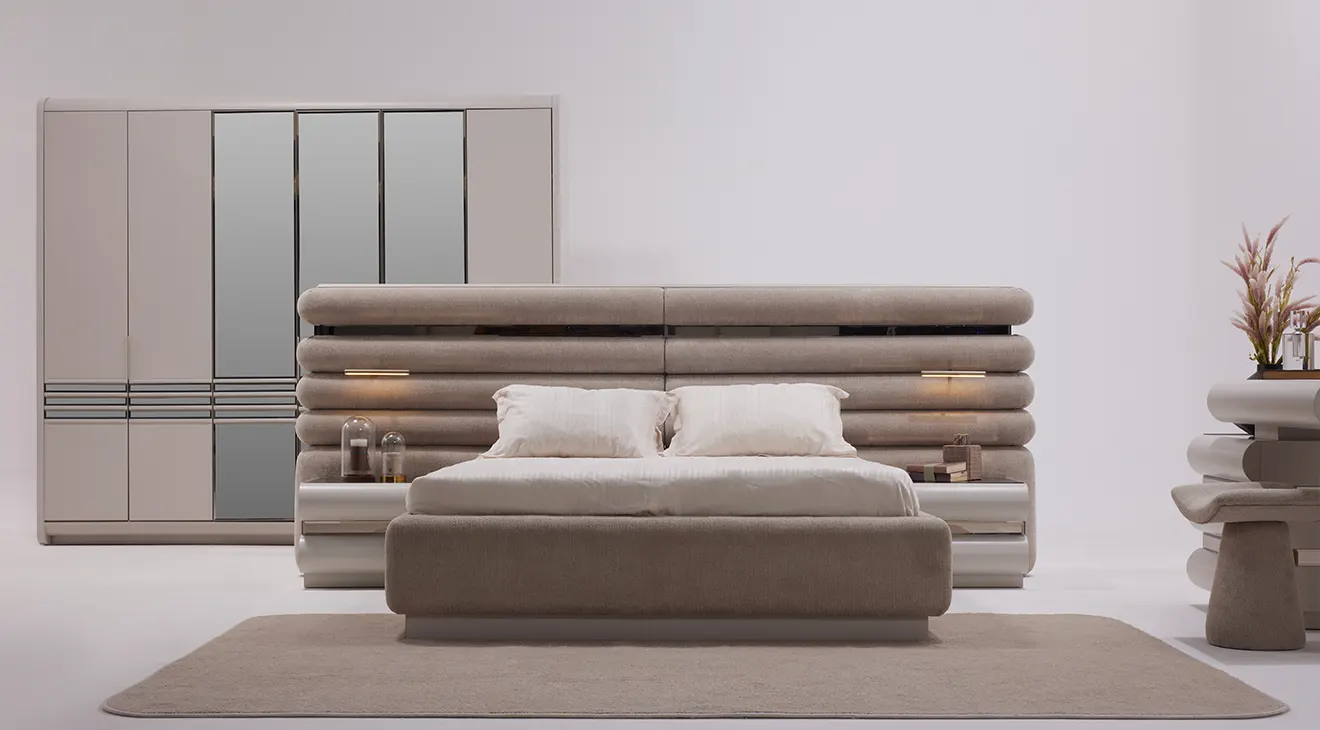 Hermosa 6 Kapaklı Yatak Odası Takımı, bej tonlu kumaşla kaplı geniş platform karyolası ve yatay çizgili, LED aydınlatmalı başlığıyla modern bir konfor alanı yaratır. Altı kapılı gardırop; aynalı ortalama kapakları, soft‑close menteşeleri ve şık metal şerit detaylarıyla fonksiyonel depolama sunar. Silindir ayaklı şifonyer ve yuvarlak makyaj aynası, zarif hatlarıyla yatak odanıza sofistike bir dokunuş katar.