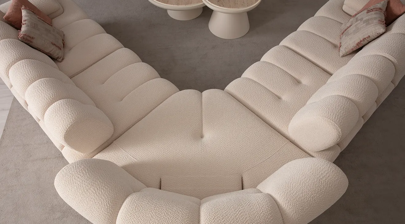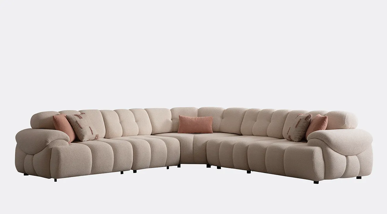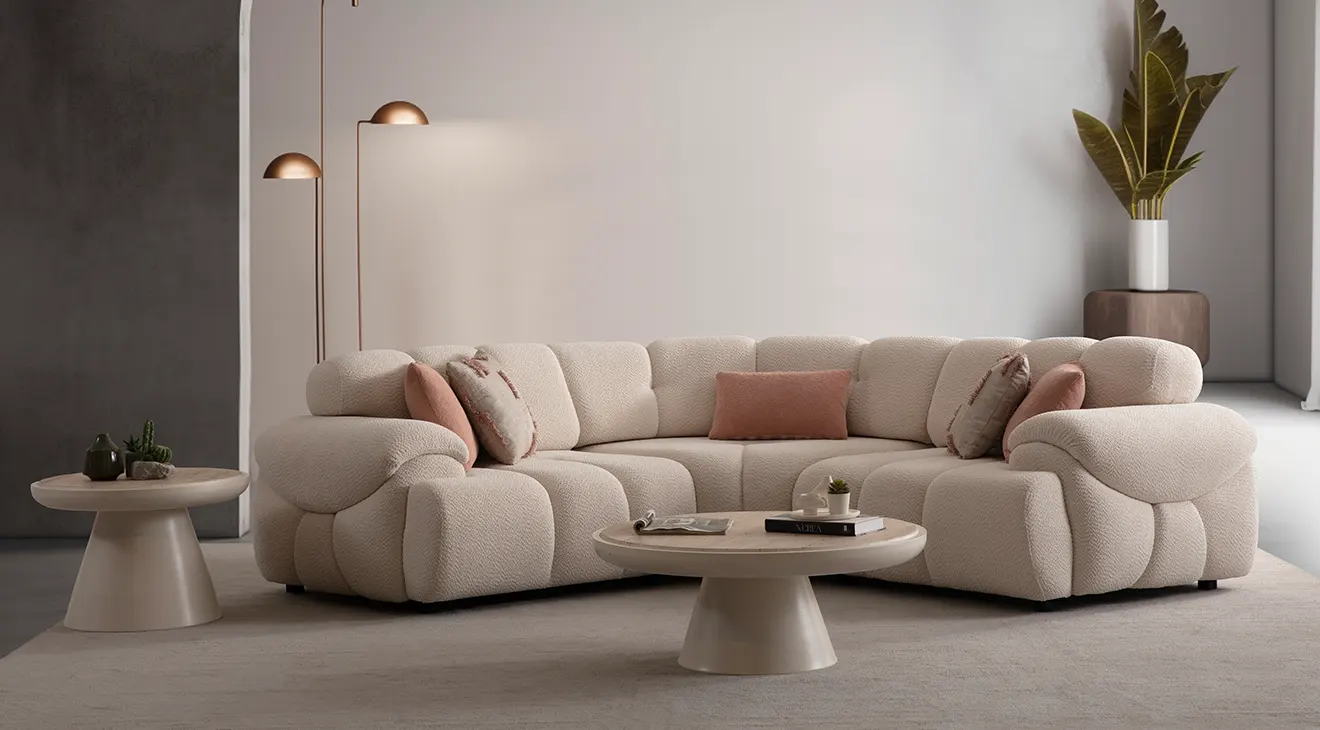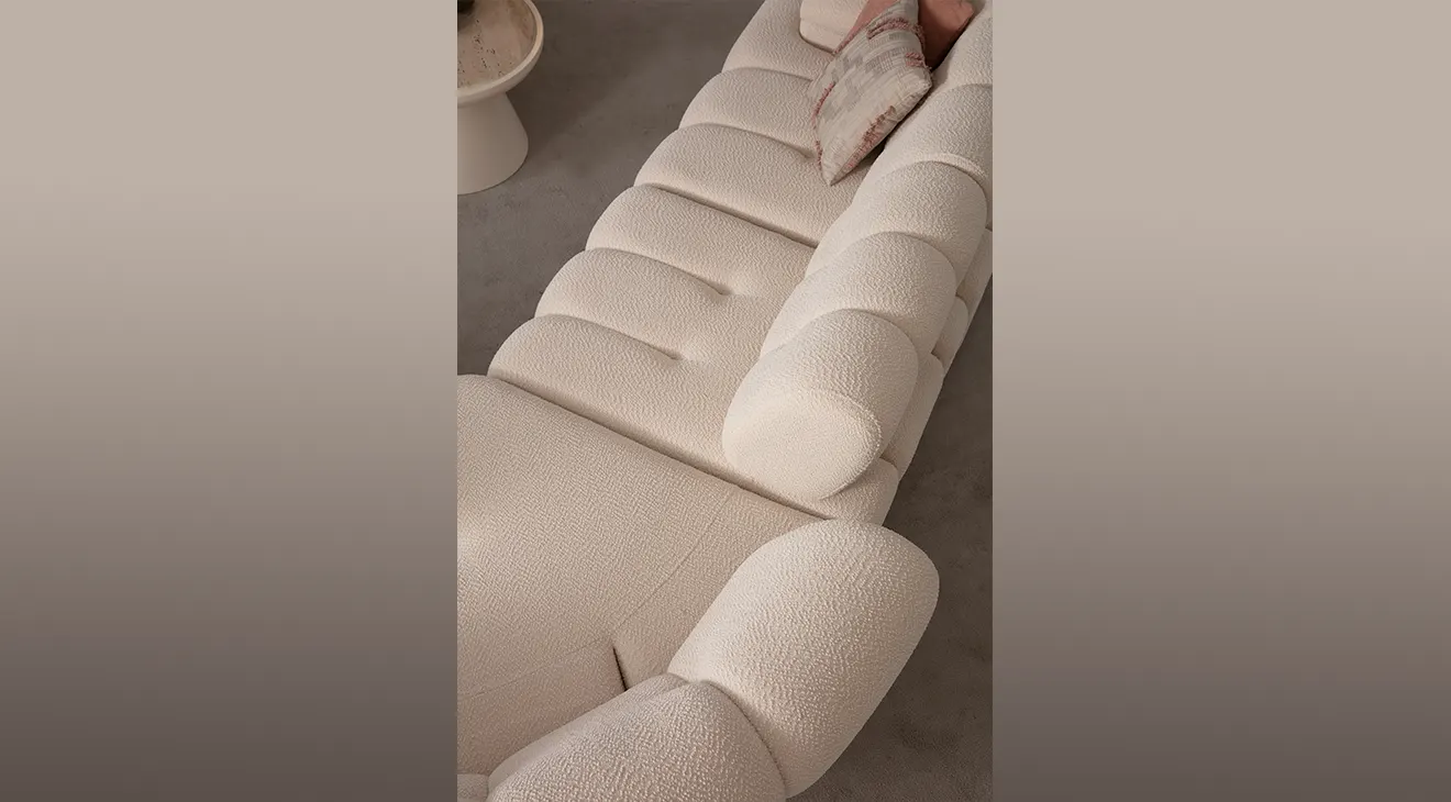 Hestia Premium köşe koltuk takımı; bouclé krem kumaşı, derin-yumuşak oturumu ve modüler L/U yerleşimiyle modern salonlara sıcak, şık ve geniş konfor sunar.