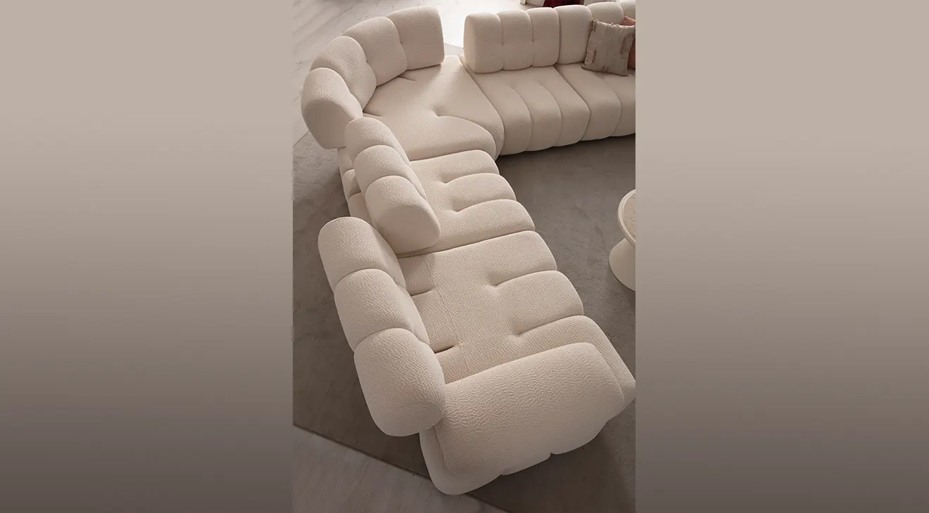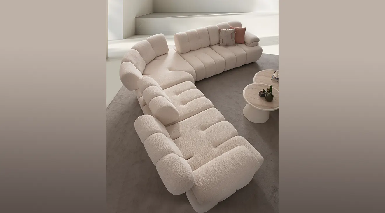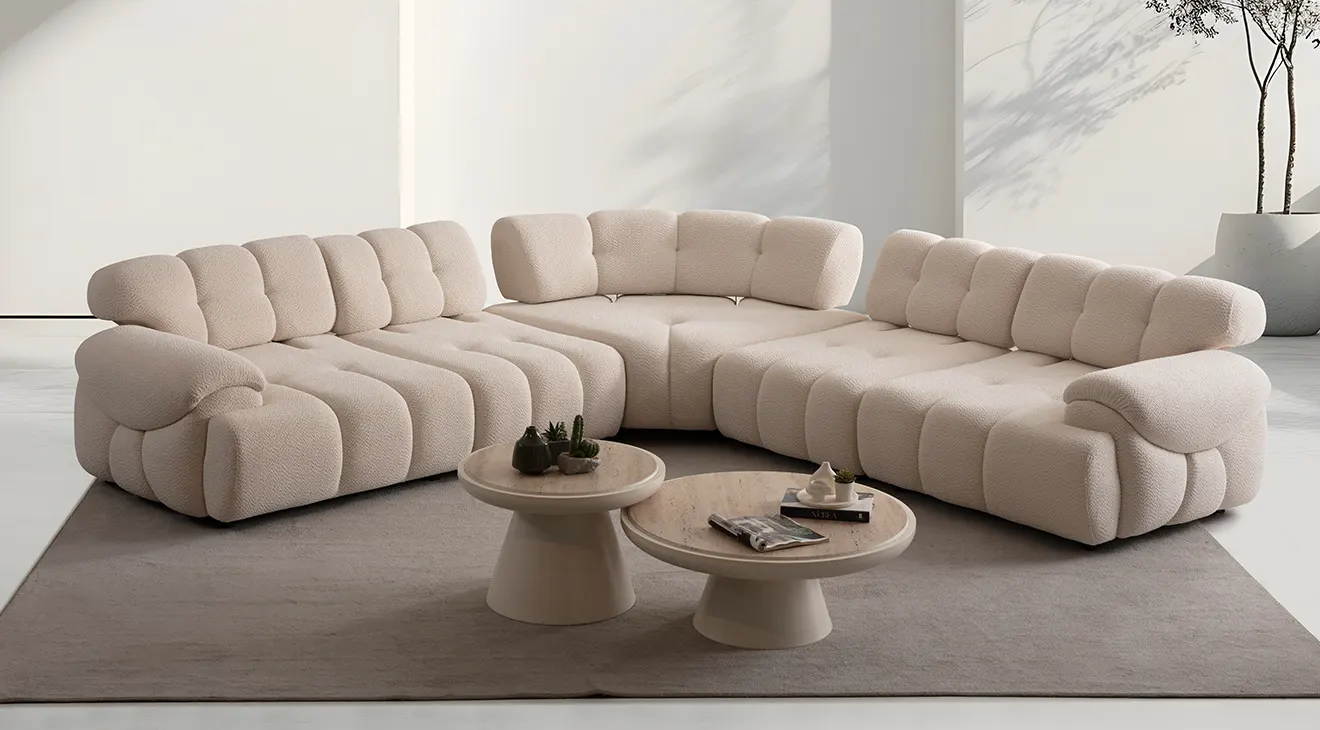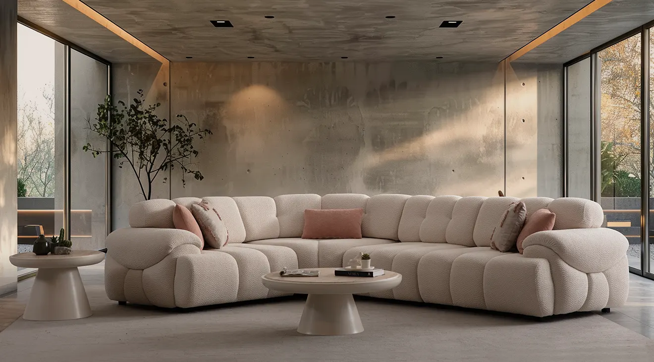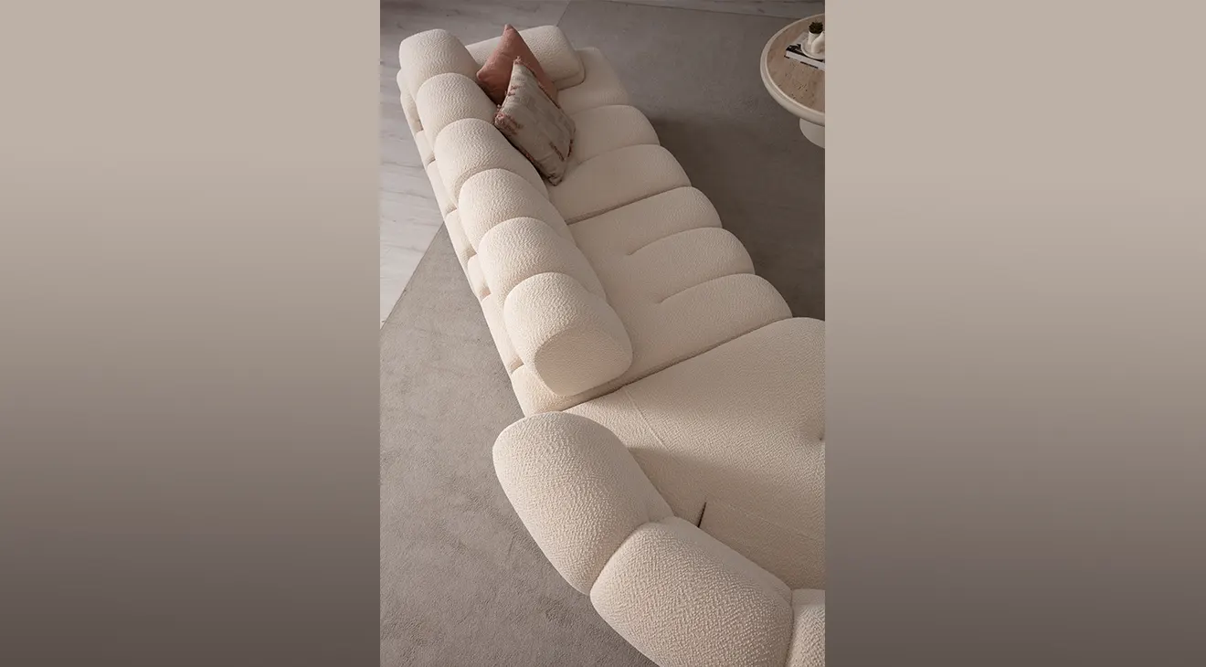 Hestia Premium köşe koltuk takımı; bouclé krem kumaşı, derin-yumuşak oturumu ve modüler L/U yerleşimiyle modern salonlara sıcak, şık ve geniş konfor sunar.
