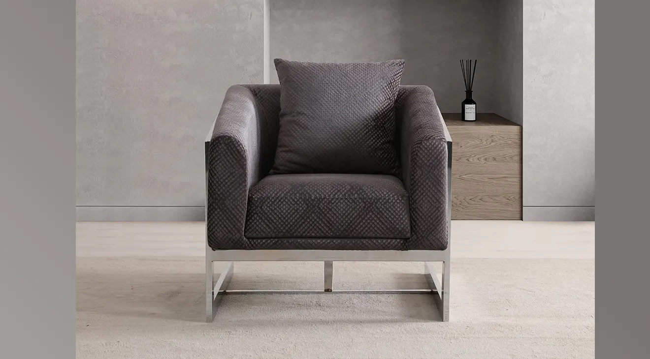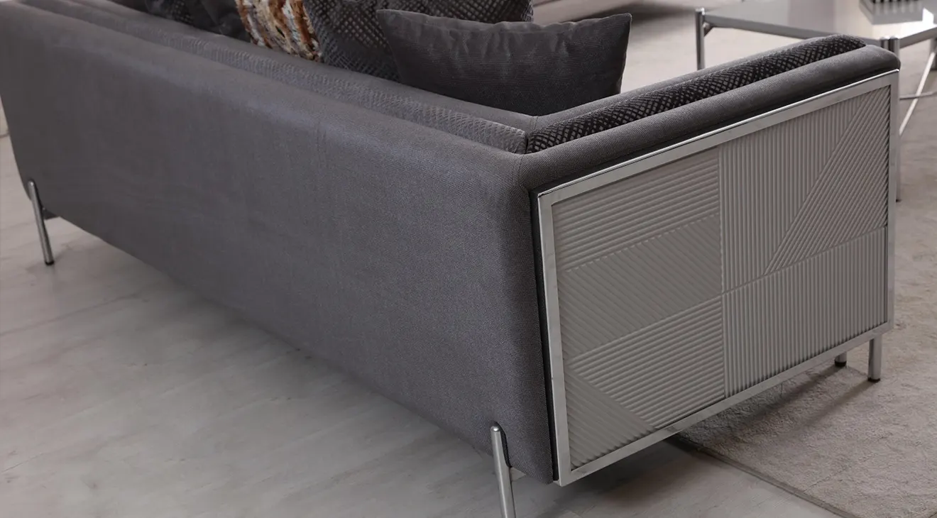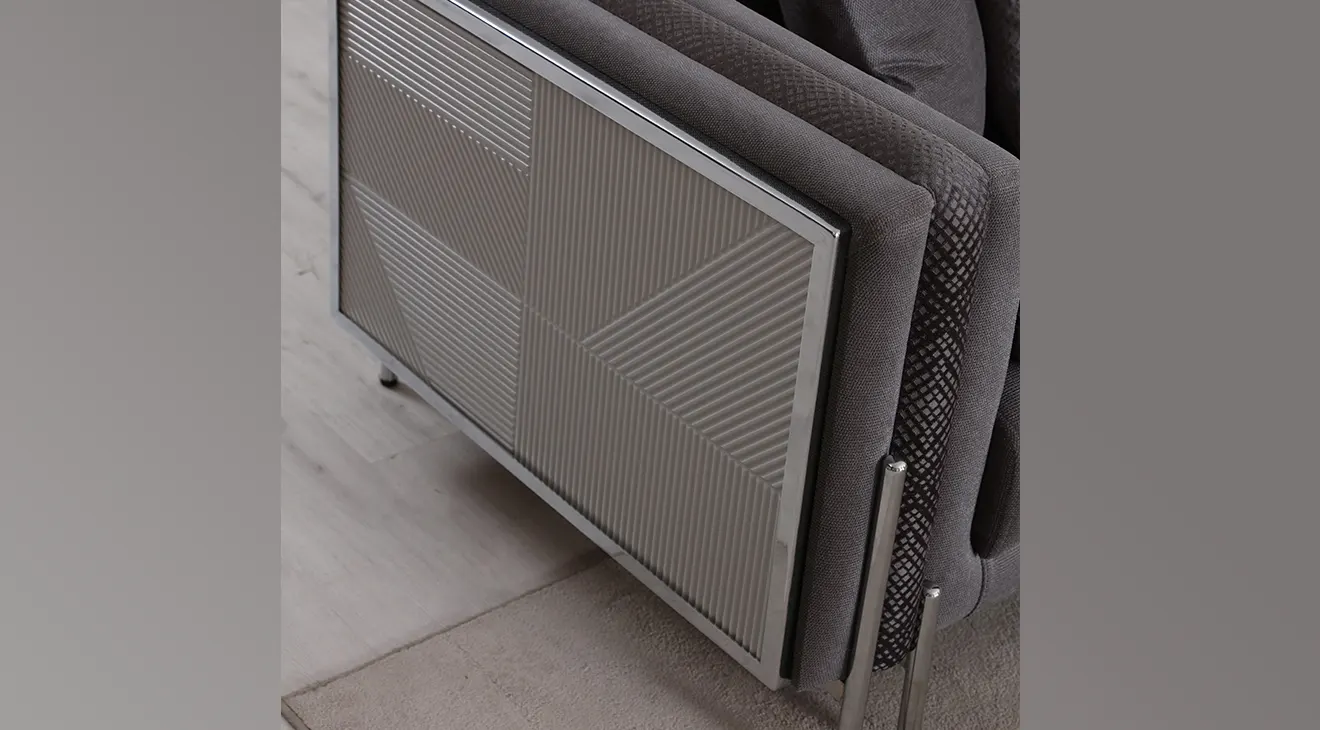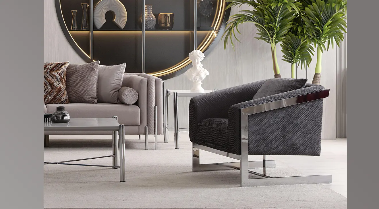 Hürrem Metal Ayaklı Koltuk Takımı; modern gri ton, krom detaylı kollar ve ince metal ayaklarla ferah duruş sunar, konforu artırır.
