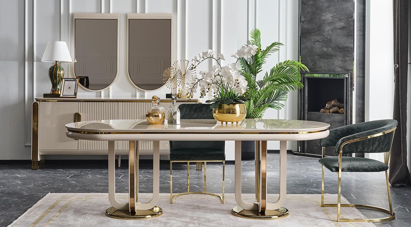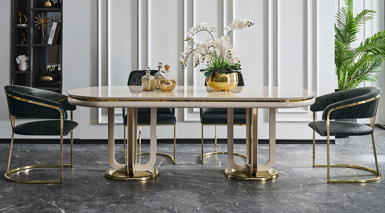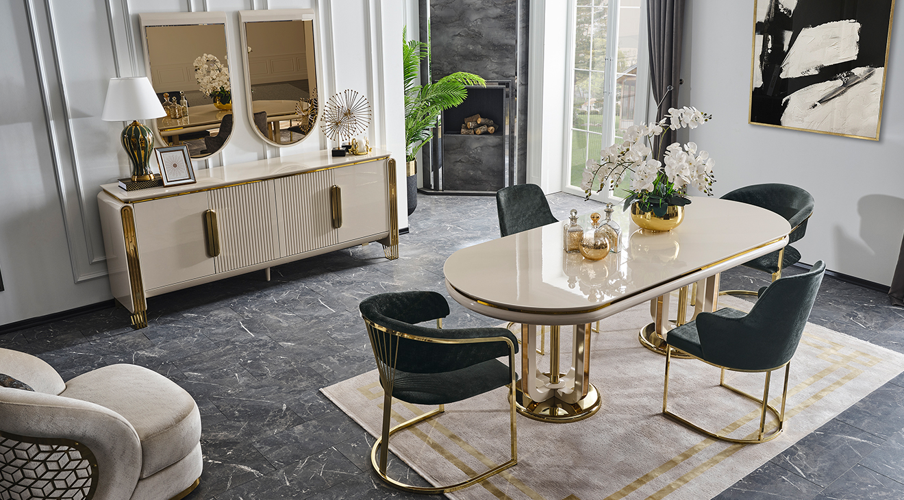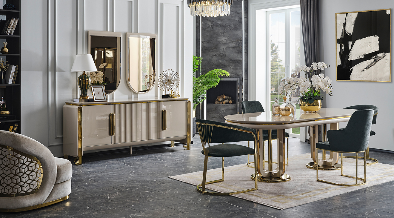 İnegöl mobilyasının özel üretimi Jaguar Luxury Yemek Odası Takımı, metal ayaklı ve luxury tasarımı ile şimdi Mobilyamevime'de!