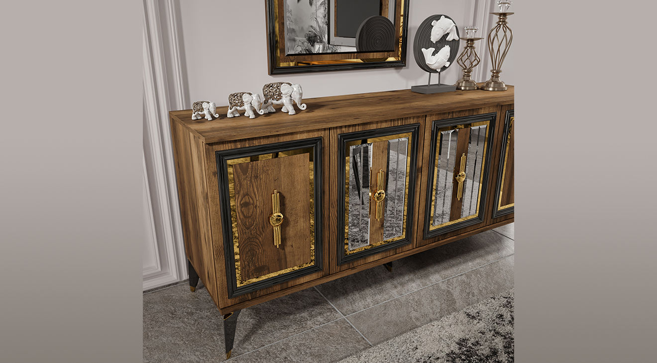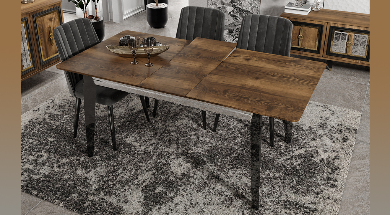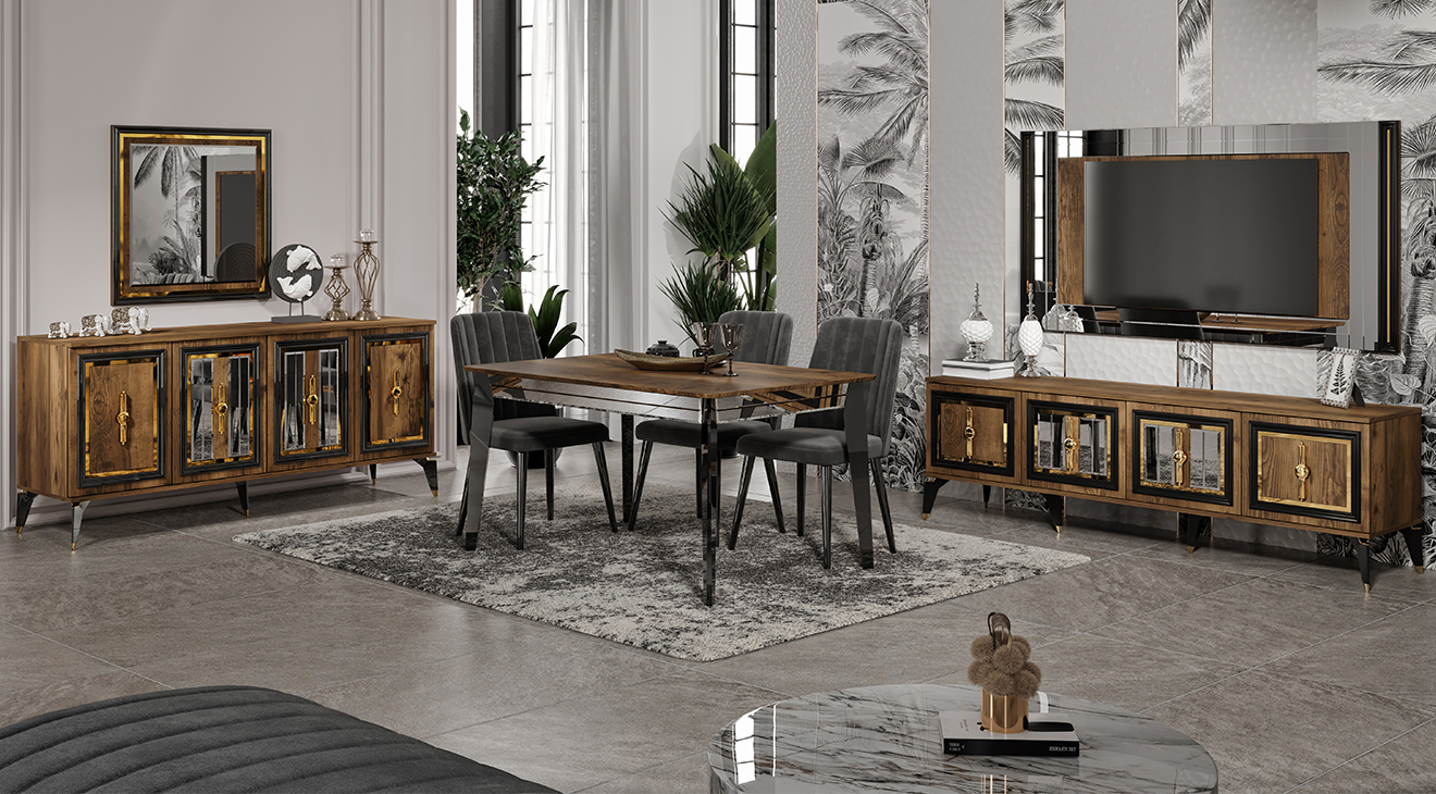 Kadıköy Ceviz Yemek Odası Takımı, modern tasarımı, ceviz rengi ve özel tasarım konsolu ile İnegöl Mobilya markalı özel üretim ürünlerinden.