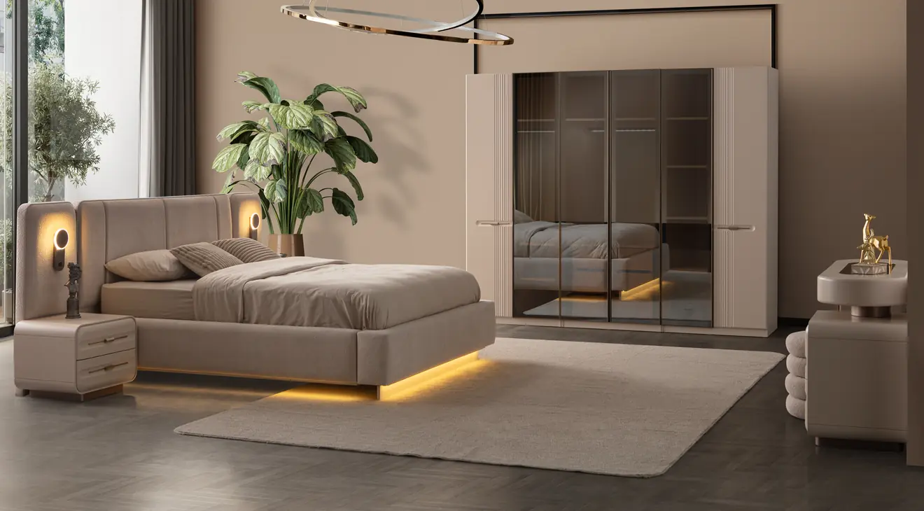 Modern tasarımı ve vizyon bej-gold rengiyle Karya Yatak Odası Takımı'nın 6 kapaklı dolabı ve bazalı yatağı ile kaliteli bir uyku deneyimi yaşayabilirsiniz. MobilyaMevimde.com'da İnegöl Mobilyası'nın özel üretimi olan bu takımı keşfedin!