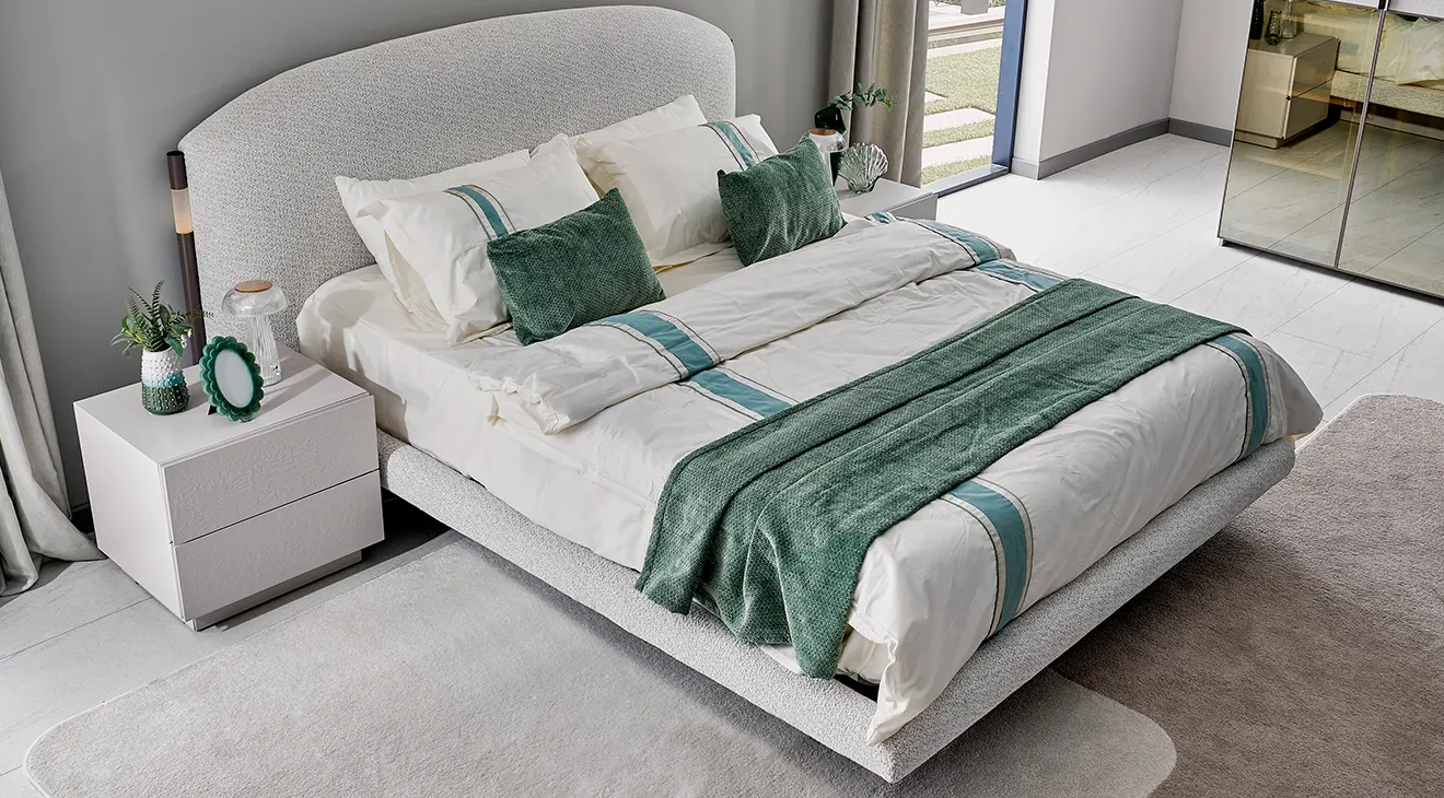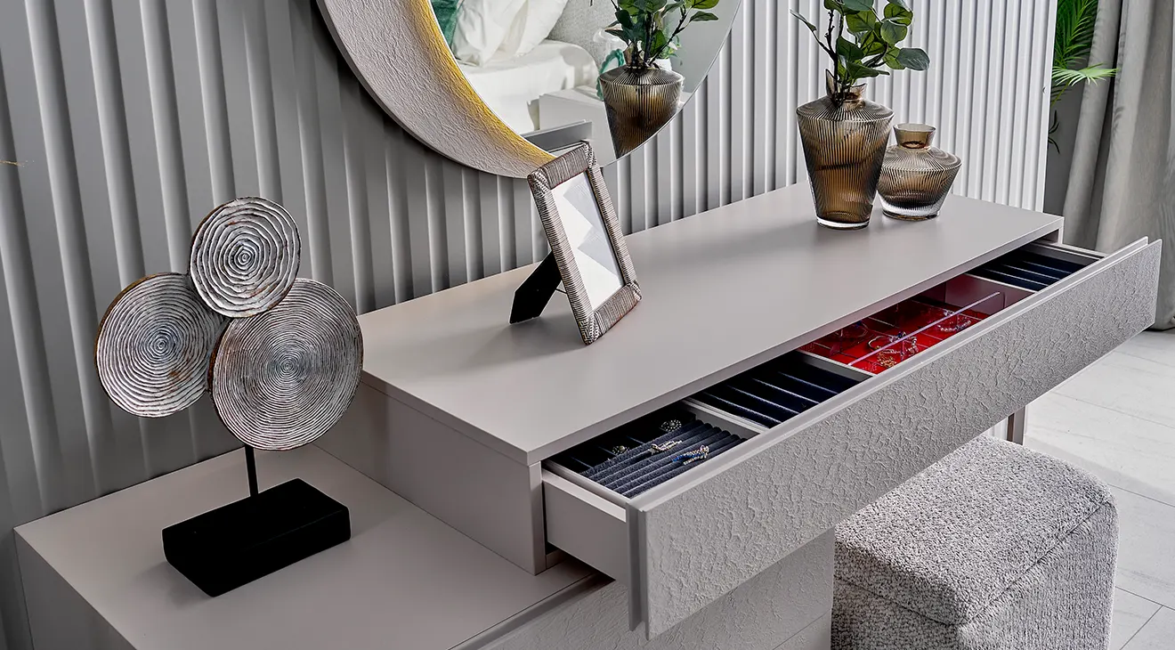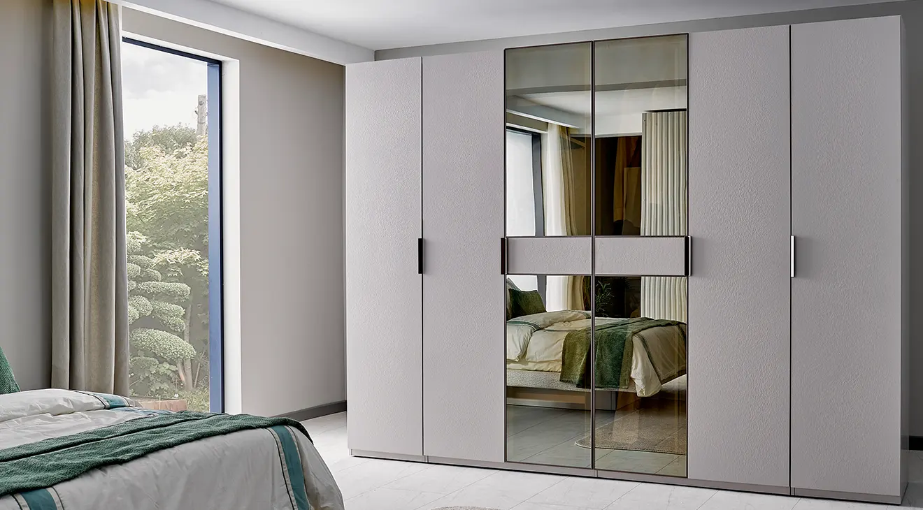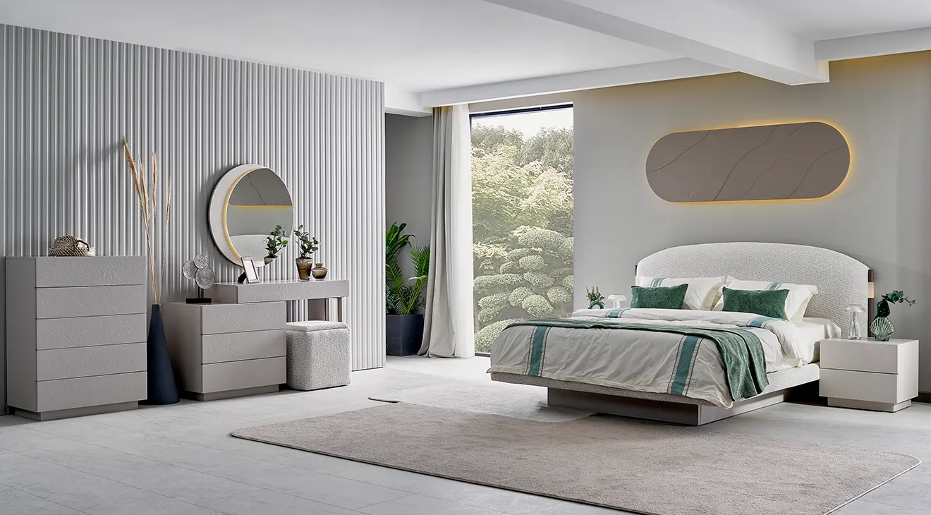 Temperli reflekte cam kapaklı 6 kapaklı dolap, sensörlü LED iç aydınlatma ve çok raflı düzeniyle her şeyi elinizin altında tutar. Bazalı yatak ekstra depolama sağlar; dokunmatik LED ayna ise hazırlık rutininizi kolaylaştırır. Yumuşak gri-bej tonları ve modern çizgilerle ferah, düzenli ve şık bir yatak odası isteyenler için ideal.