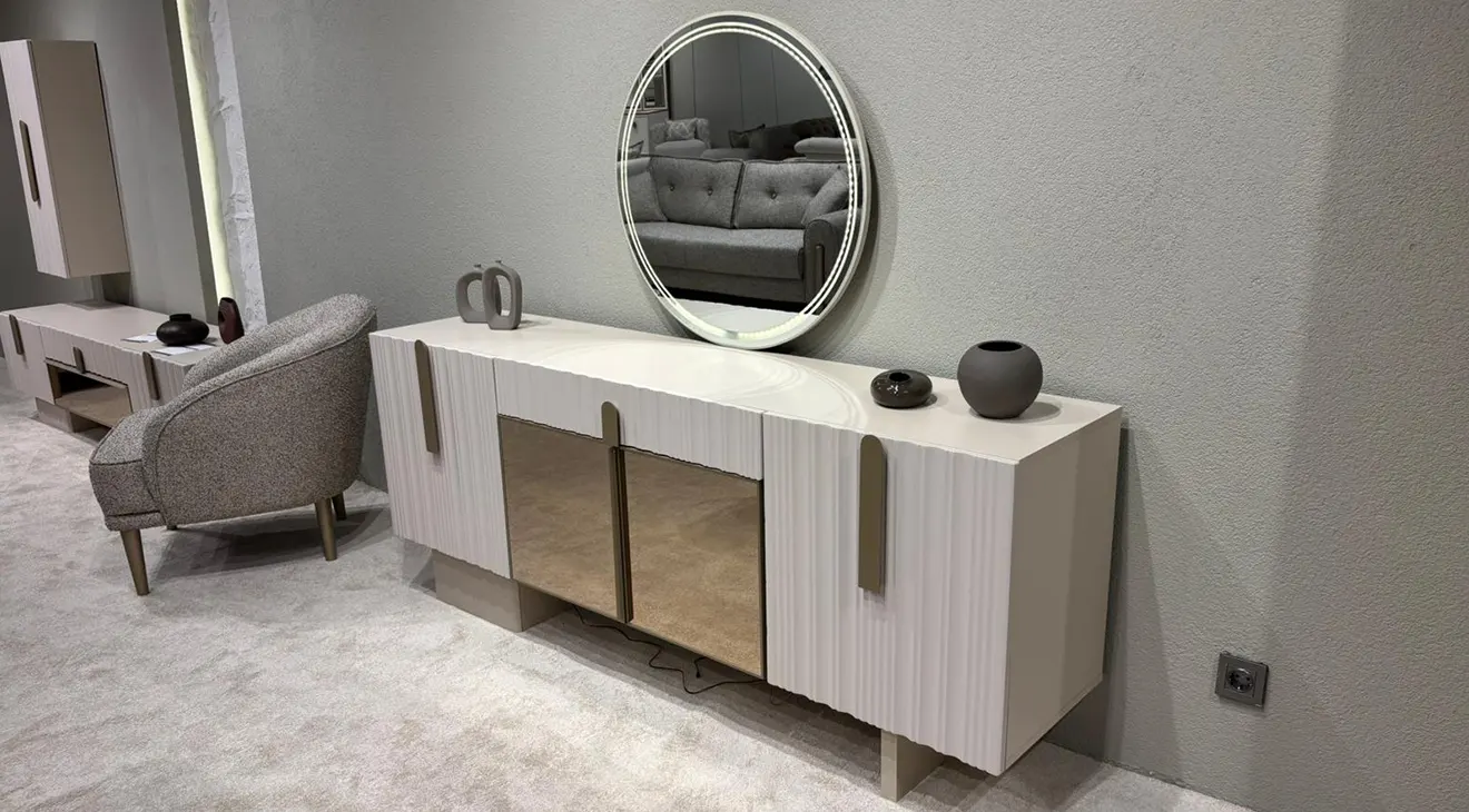 Kosova Yemek Odası Takımı, krem–bej tonlarının sakinliğini modern çizgiler ve oluklu (fluted) yüzeylerle birleştirir. Yuvarlatılmış köşelere sahip açılır mekanizmalı masa, ortadaki anıt kaide formu ve gizli yaprak sistemiyle kalabalık sofralara rahatça büyür. Dokulu döşemesi ve kavisli sırt tasarımıyla 6 adet sandalye, uzun oturumlarda konfor sunar. Takımı tamamlayan konsol; bronz ayna kapaklı orta bölümü, ritmik oluk dokulu yan kapakları ve geniş raf düzeniyle şık ve işlevsel depolama sağlar. İnce düşünülmüş hatları, kaliteli malzeme yapısı ve zamansız rengi sayesinde Kosova, yemek alanınıza ferah ve sofistike bir kimlik kazandırır; İnegöl mobilya kalitesiyle yıllarca ilk günkü görünümünü korur.