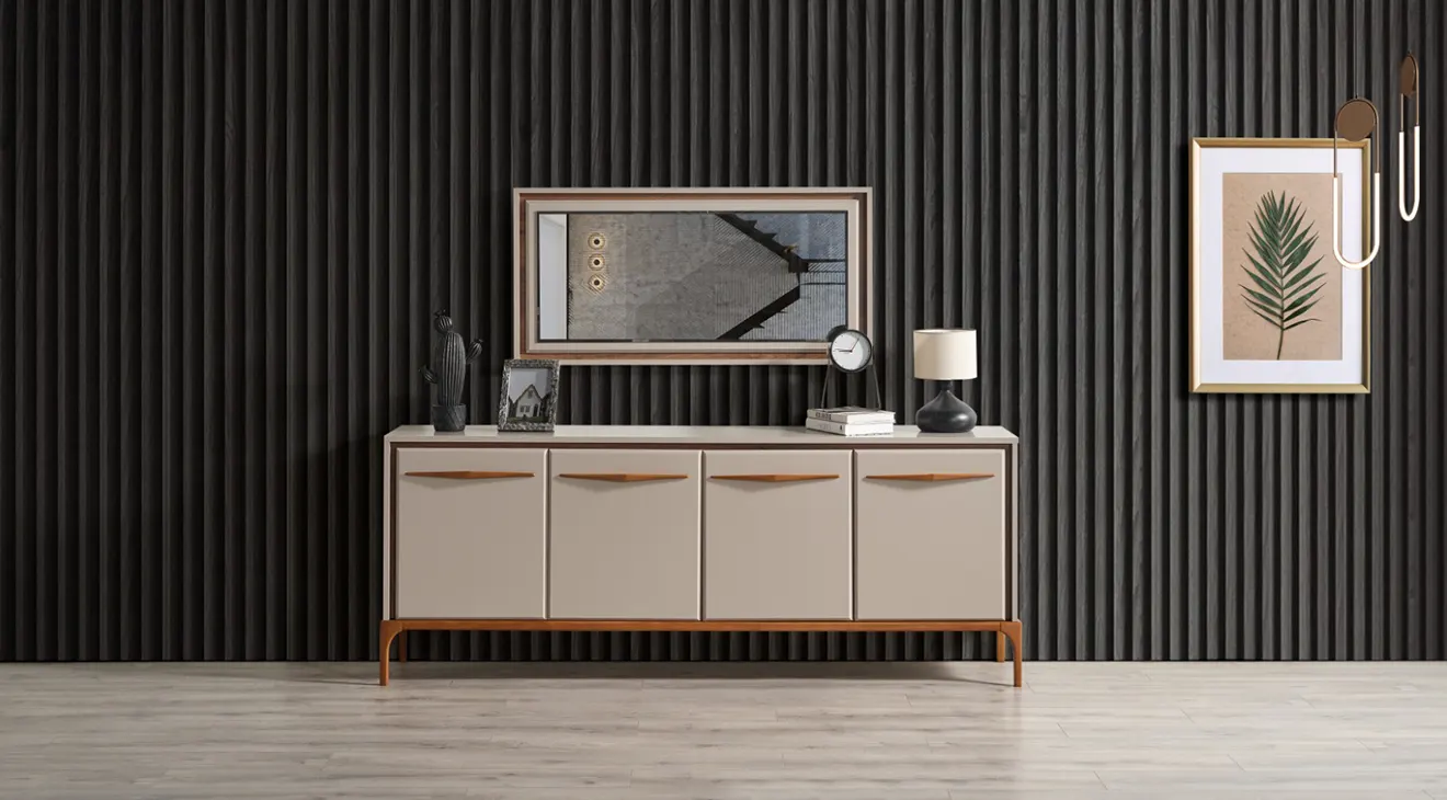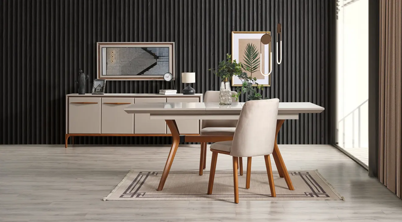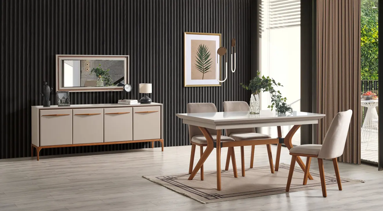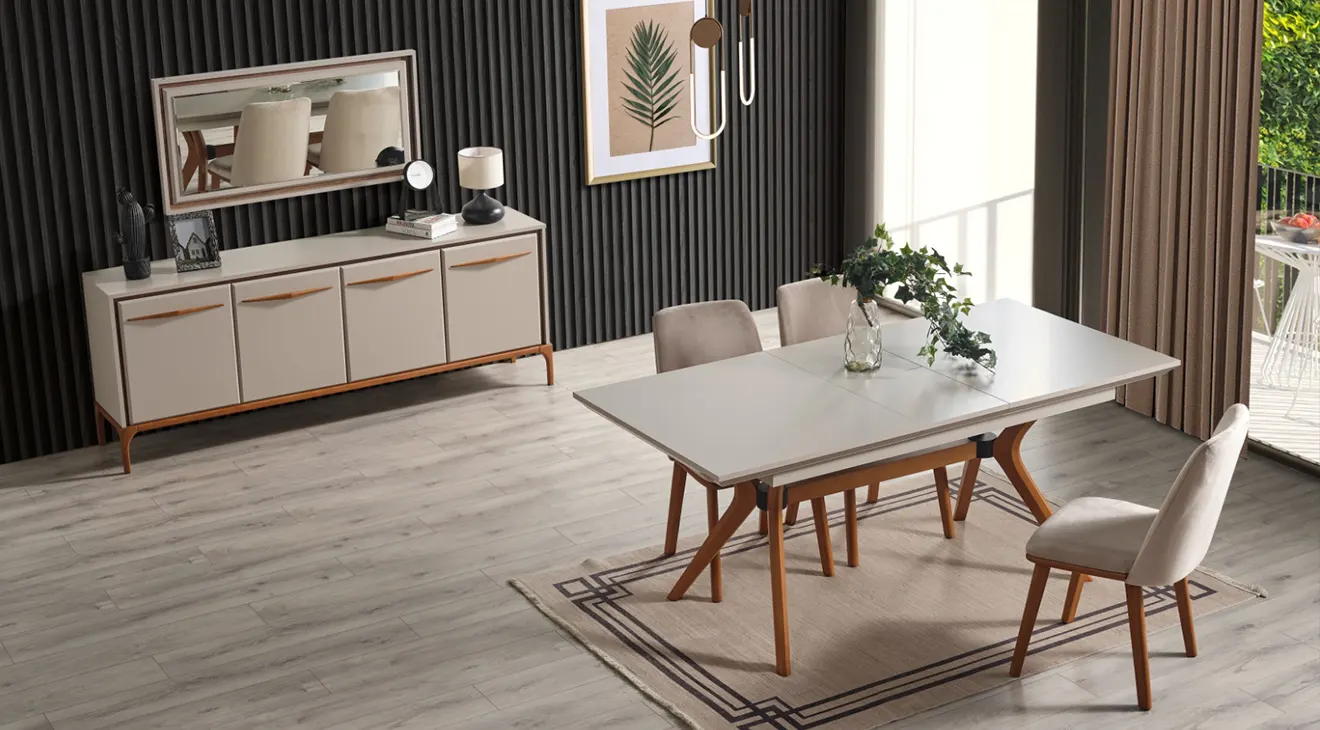 Kumsal Ahşap Ayaklı Yemek Odası Takımı, sıcak meşe tonlu ayakları, kum beji kapakları ve zarif kulp çizgileriyle modern ve sade bir duruş sergiler. Açılır mekanizmalı masa 6’dan 8 kişiye rahatça genişler; kolay temizlenen üst tabla günlük kullanıma dayanır. Yumuşak dokulu sandalyeler konfor sunarken, 4 kapaklı konsol ve geniş ayna depolamayı artırıp mekâna ferahlık katar. Orta-büyük yemek alanlarına hafif ve şık bir atmosfer kazandırır.