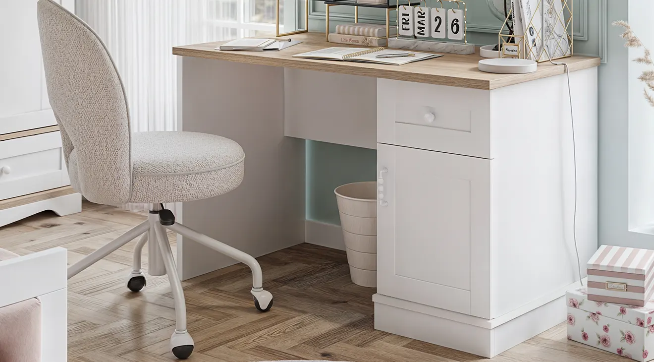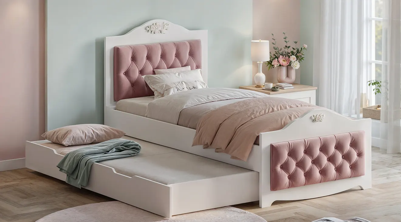 Laura Genç Odası Takımı, zarif çiçek rölyefleri ve pudra pembe kapitoneli başlığıyla romantik bir dokunuş sunar. Çekmeceli karyola altı ek yatak, geniş gardırop, fonksiyonel çalışma masası ve şık şifonyeriyle hem şık hem kullanışlı bir genç odası oluşturur.
