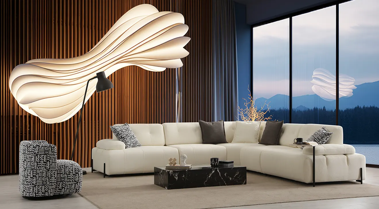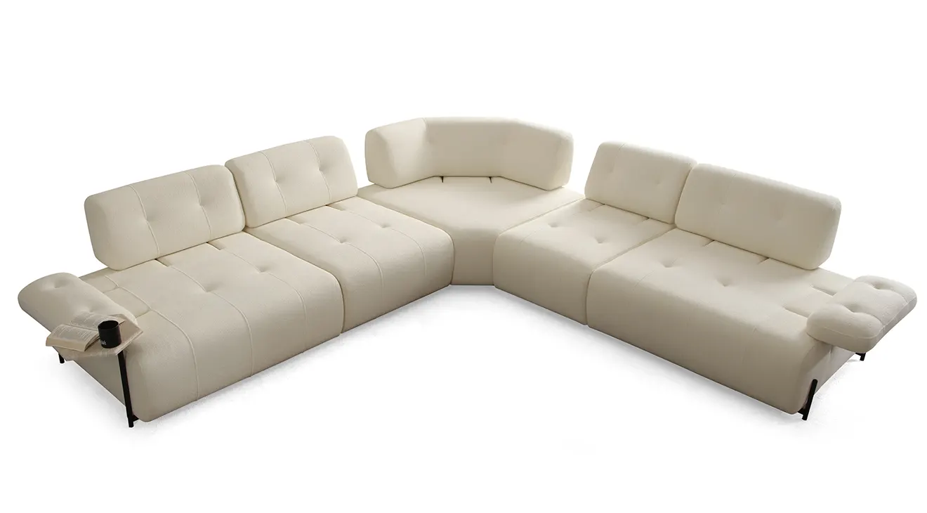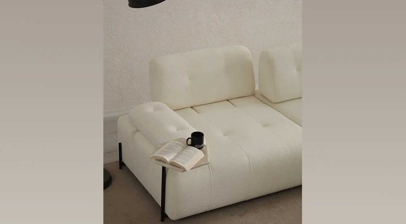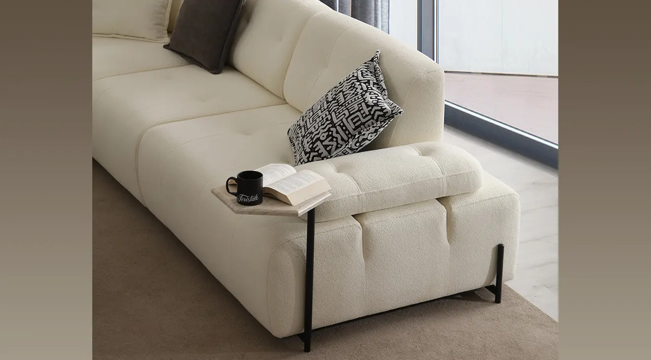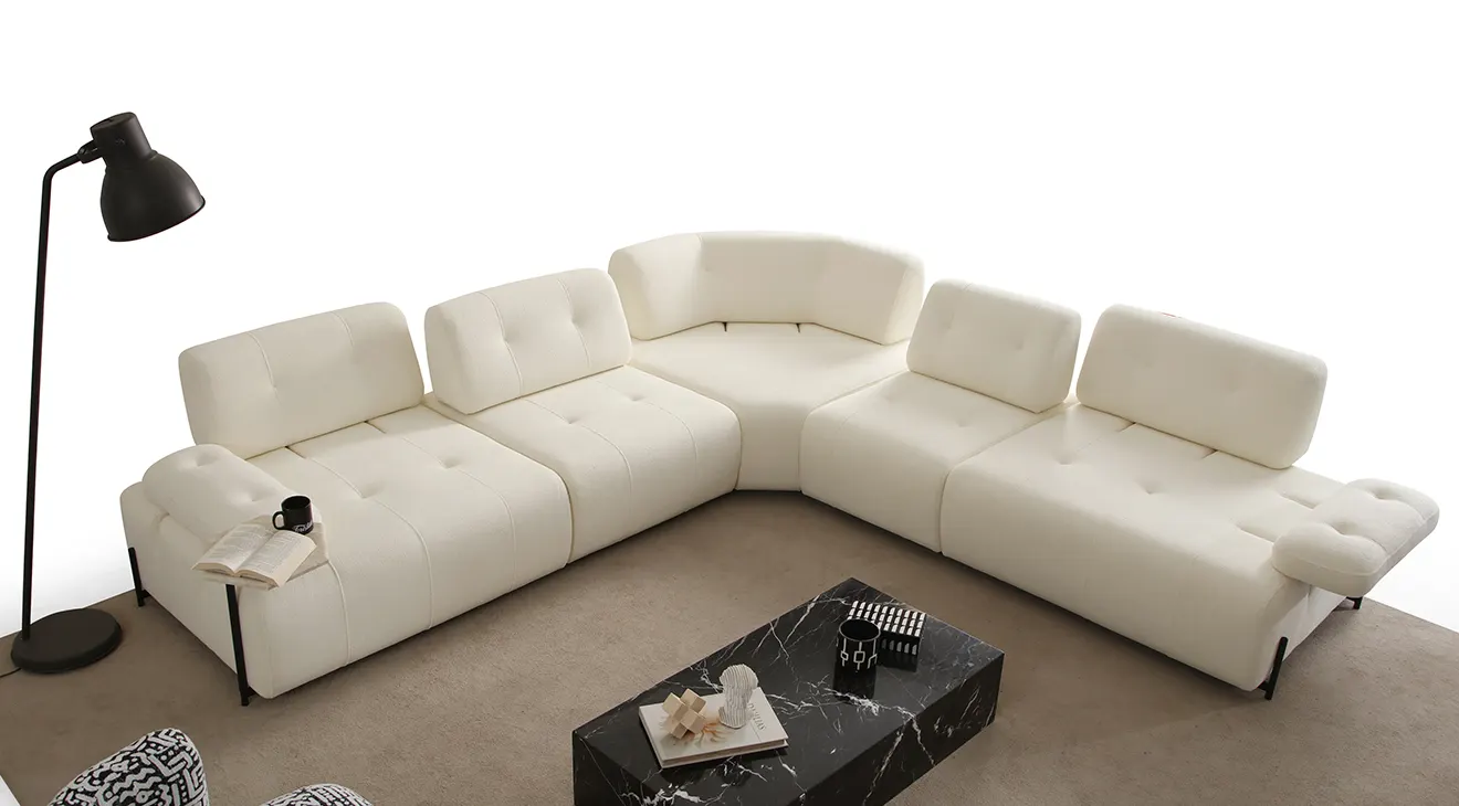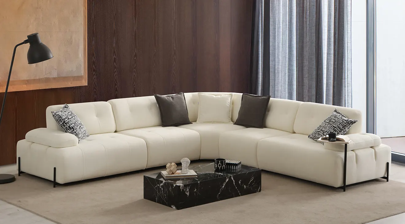 Lima Metal Ayaklı Köşe Koltuk Takımı; krem dokulu döşeme, siyah metal ayaklar ve modüler parçalarla L/U yerleşim. Geniş oturum, yumuşak konfor, modern salonlara şık dokunuş.