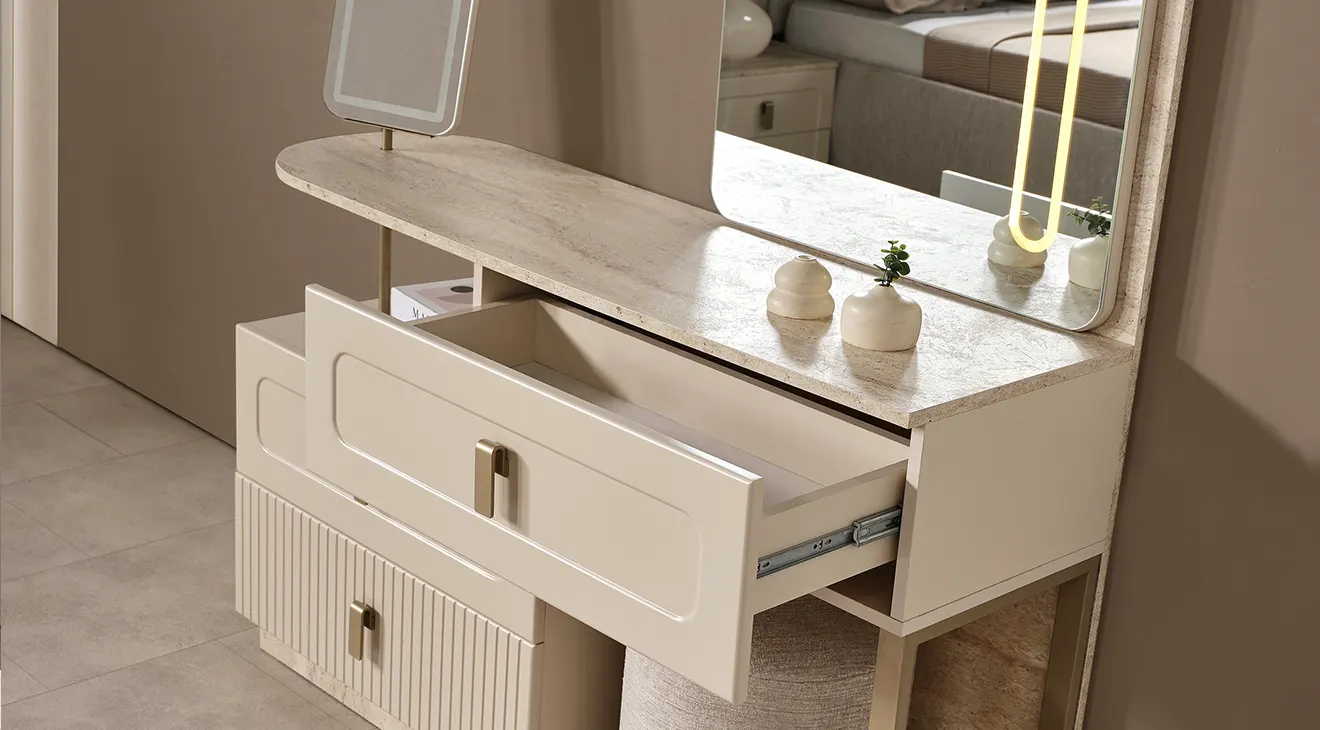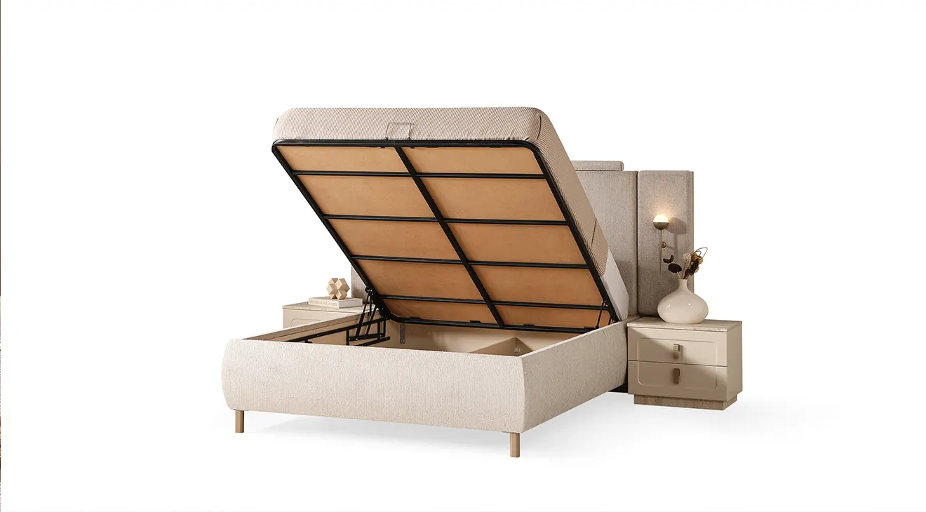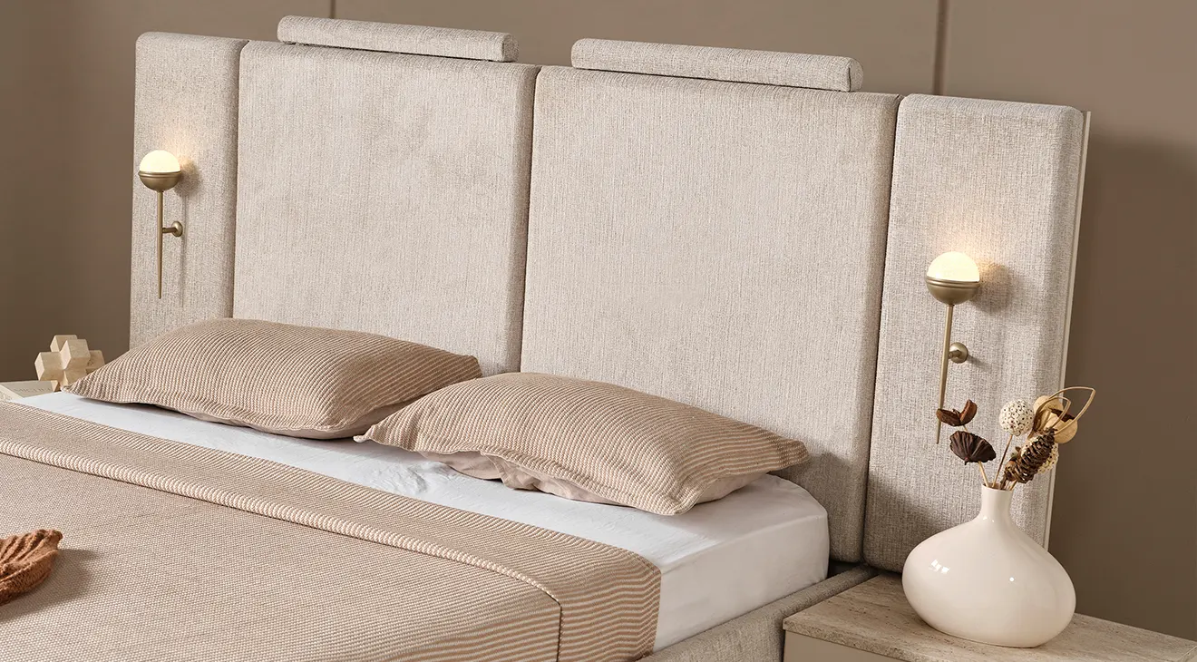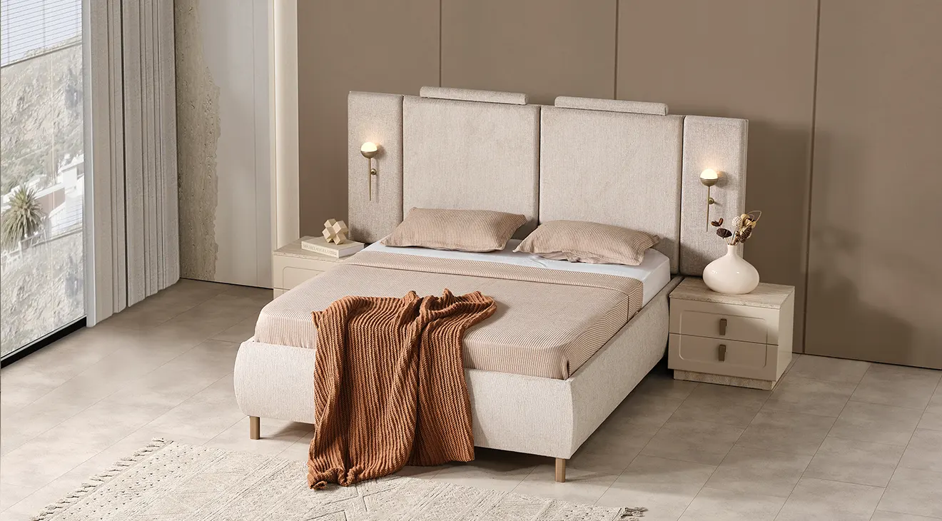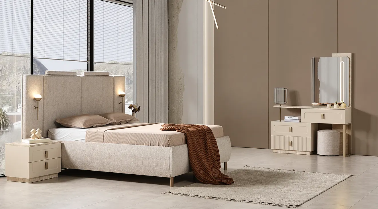 Lina, sıcak krem tonları ve yalın hatlarıyla modern bir sakinlik sunar. Başlığı yumuşak döşemeli yapıdadır ve iki tarafında zarif aplikler bulunur. 6 kapaklı gardırop, ortada tam boy aynalar ve altta dikey kanallı yüzeylerle geniş depolama sağlar. Takımı tamamlayan şifonyer (aydınlatmalı ayna) ve çift çekmeceli komodinler, taş dokulu kaide ve sade metal kulplarla koleksiyonun bütün dilini taşır.