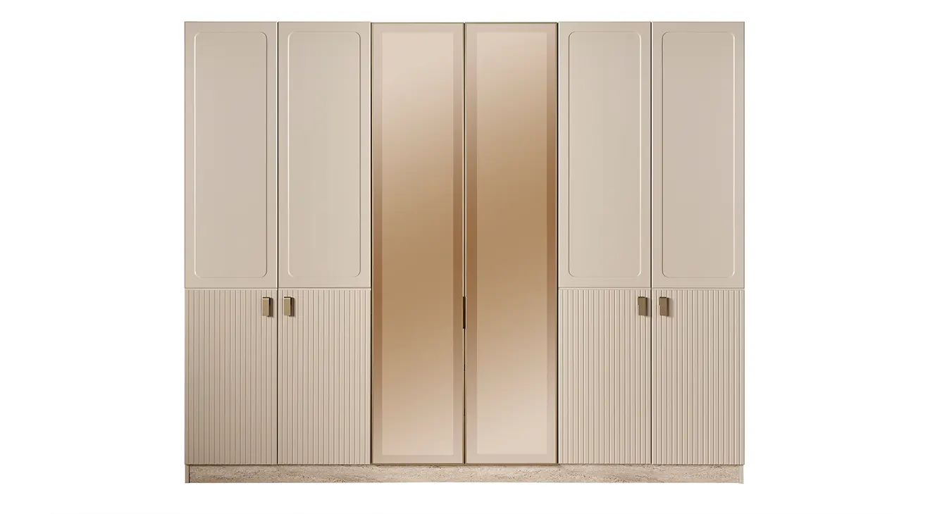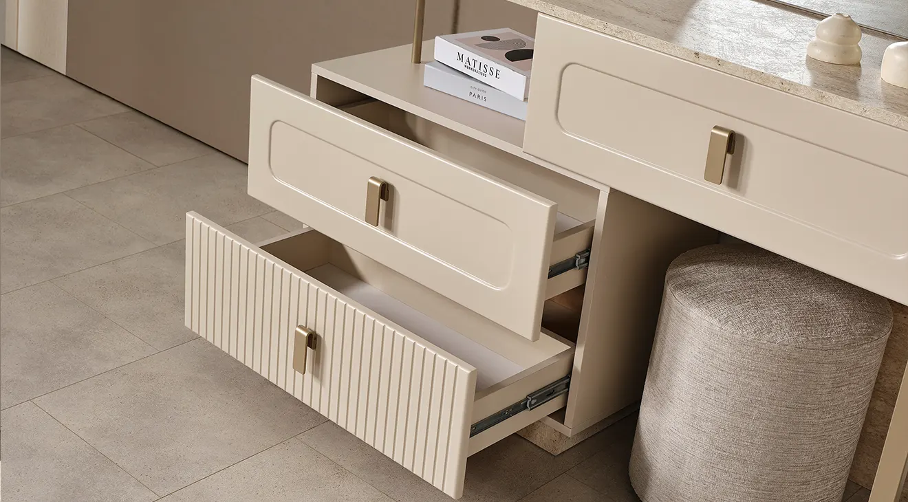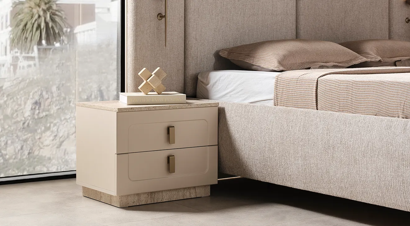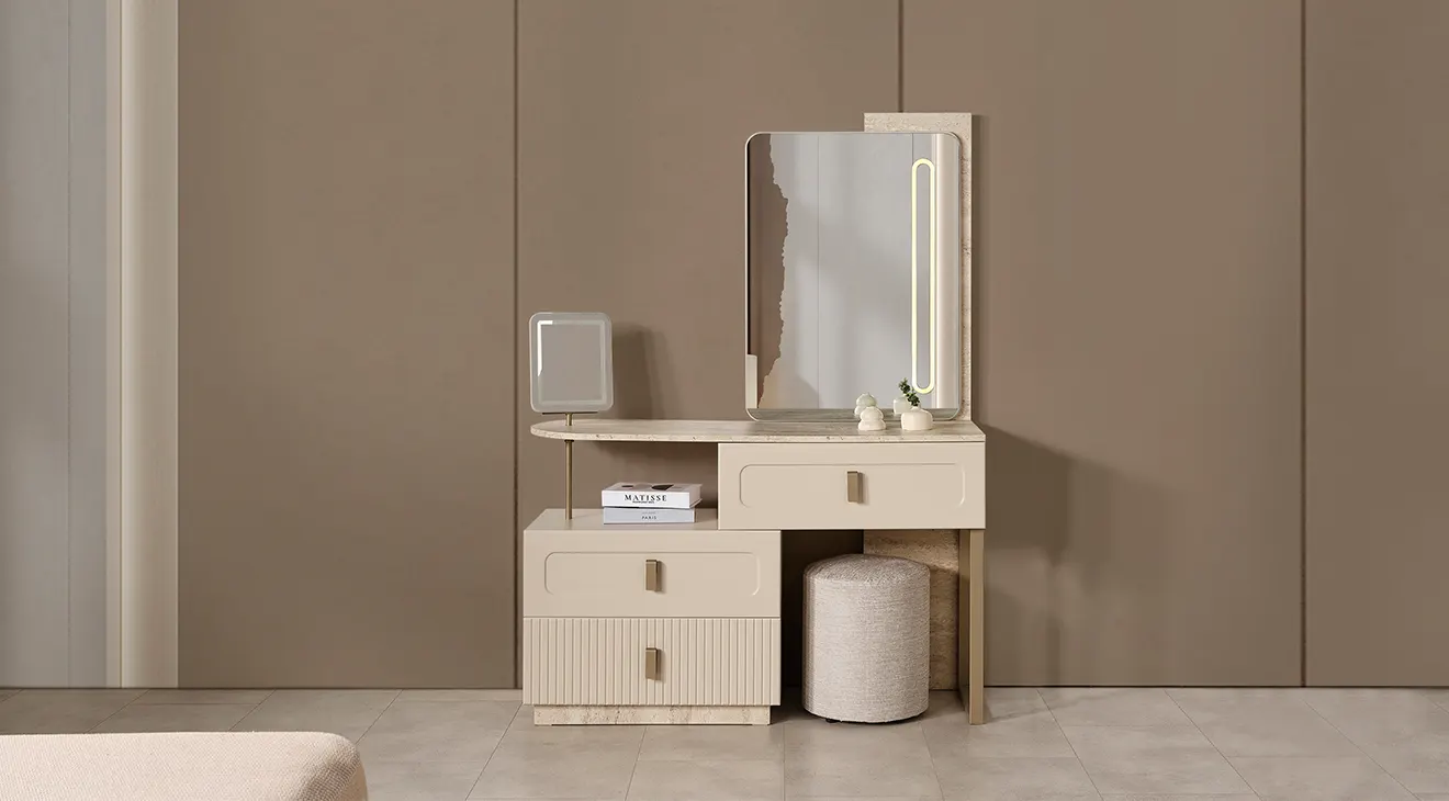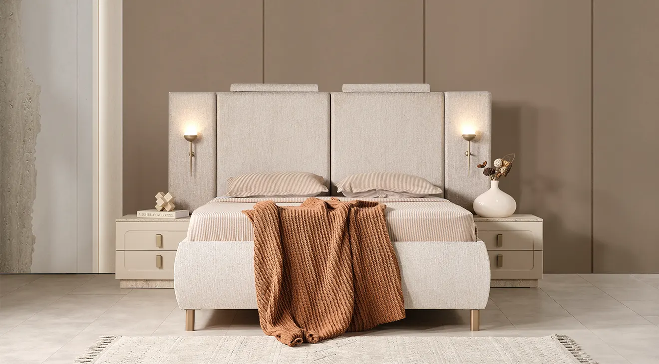 Lina, sıcak krem tonları ve yalın hatlarıyla modern bir sakinlik sunar. Başlığı yumuşak döşemeli yapıdadır ve iki tarafında zarif aplikler bulunur. 6 kapaklı gardırop, ortada tam boy aynalar ve altta dikey kanallı yüzeylerle geniş depolama sağlar. Takımı tamamlayan şifonyer (aydınlatmalı ayna) ve çift çekmeceli komodinler, taş dokulu kaide ve sade metal kulplarla koleksiyonun bütün dilini taşır.