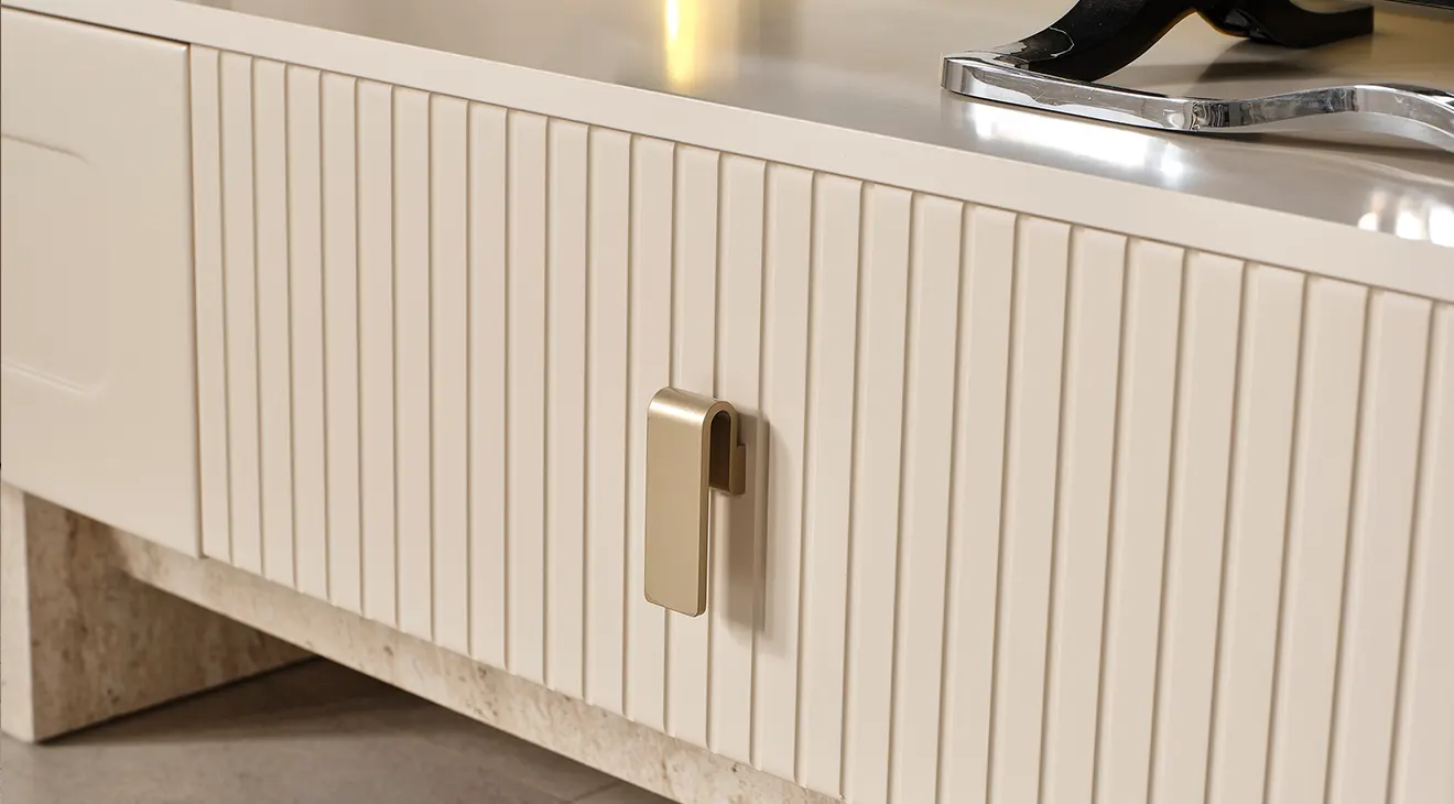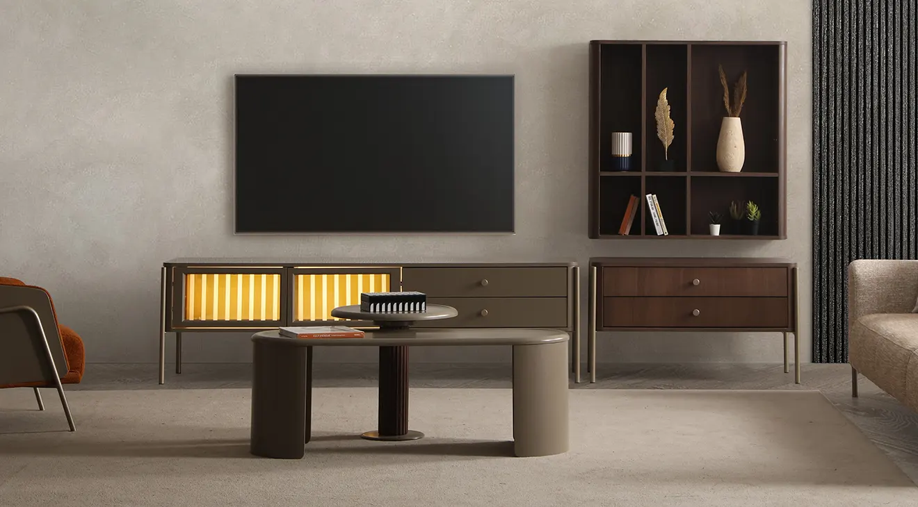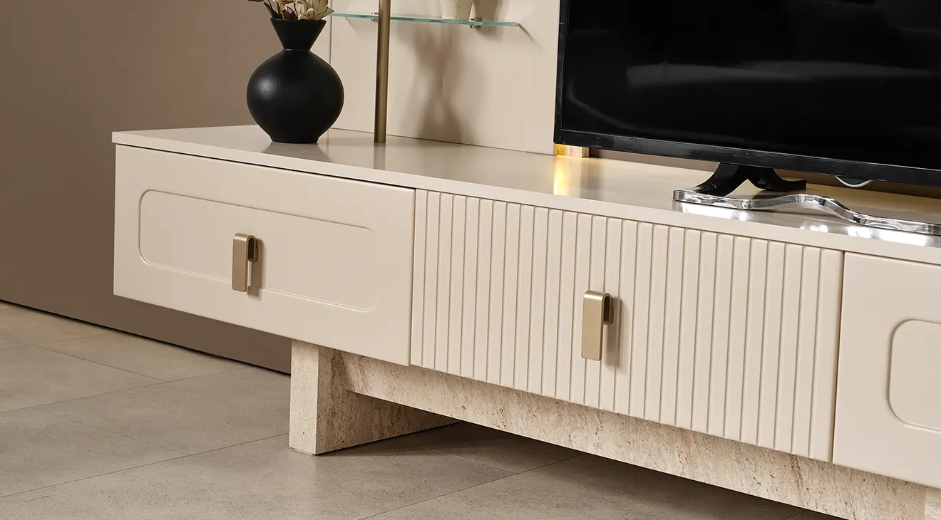 Salonunuza sade ama iddialı bir dokunuş: krem ton, flüt kapaklar ve traverten görünümlü kaideyle modern çizgi. Geniş üst tabla, kapaklı depolama ve LED’li cam rafla hem düzen hem sergileme; büyük ekran TV’lerle uyumlu, dayanıklı ve kolay temizlenir. Modern TV ünitesi/TV sehpası arayanlar için ideal.