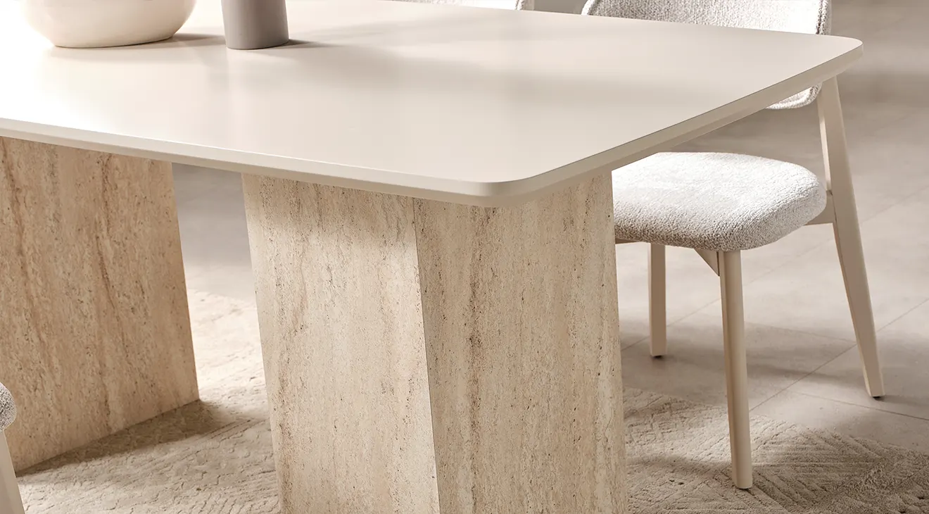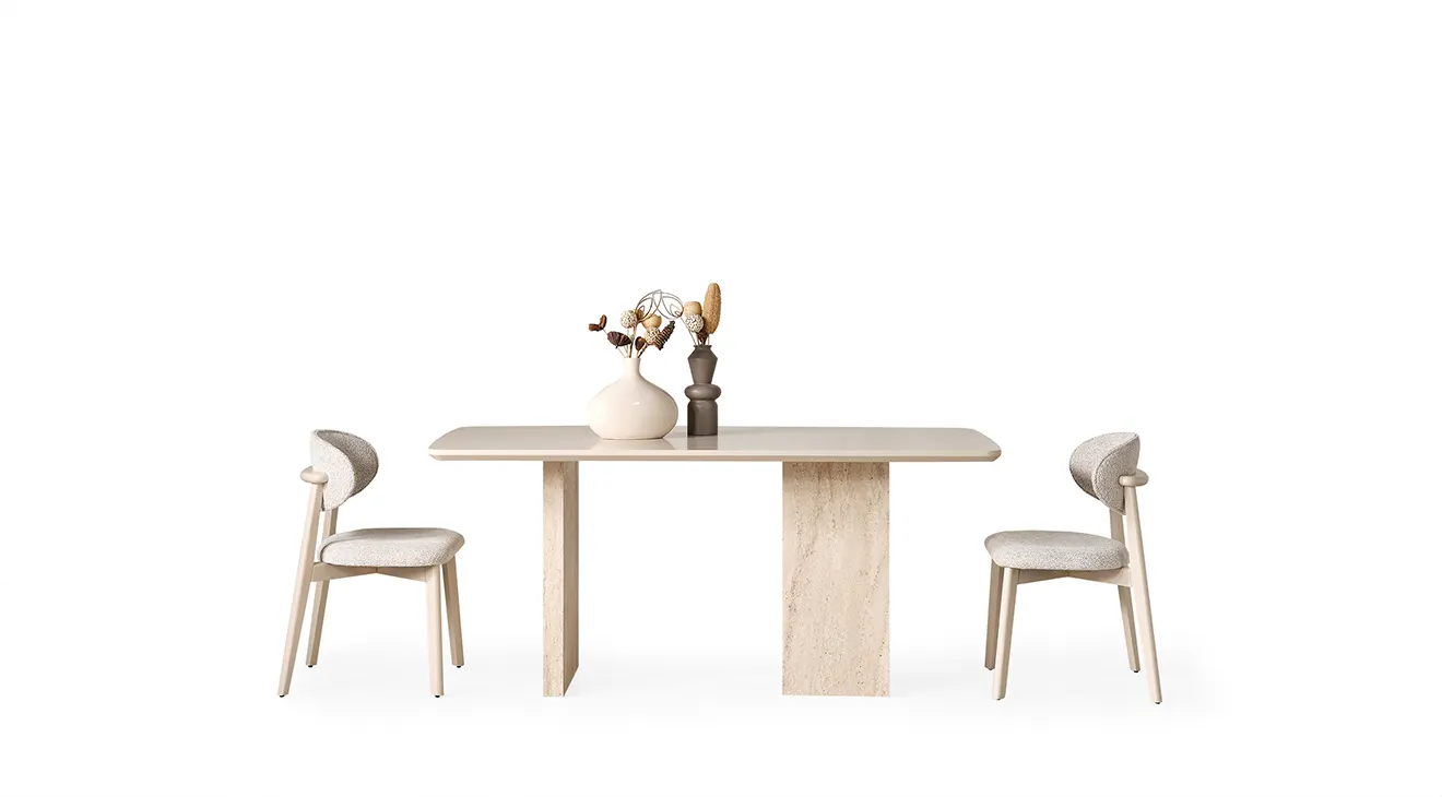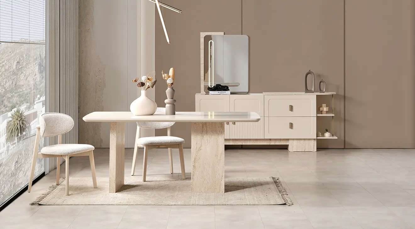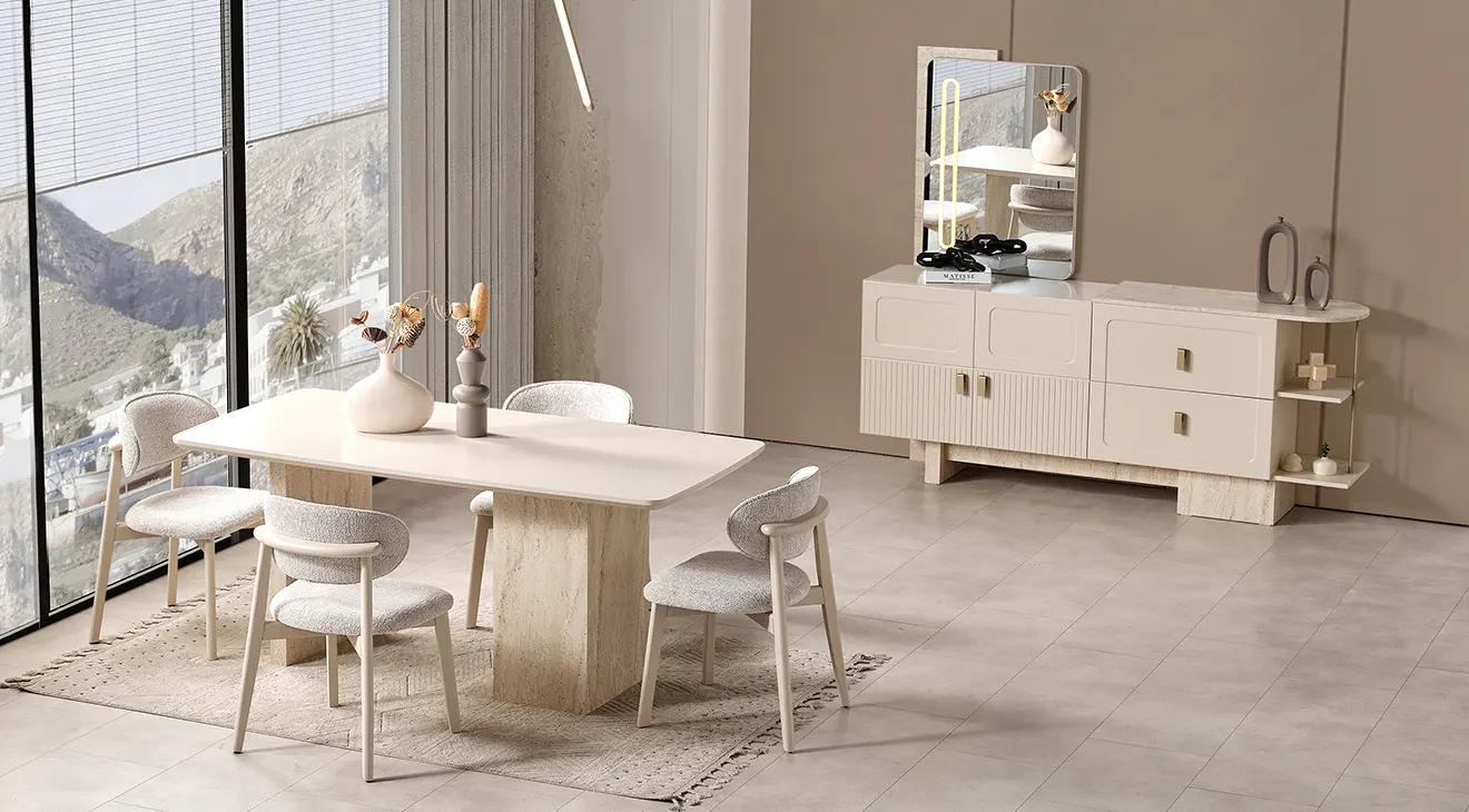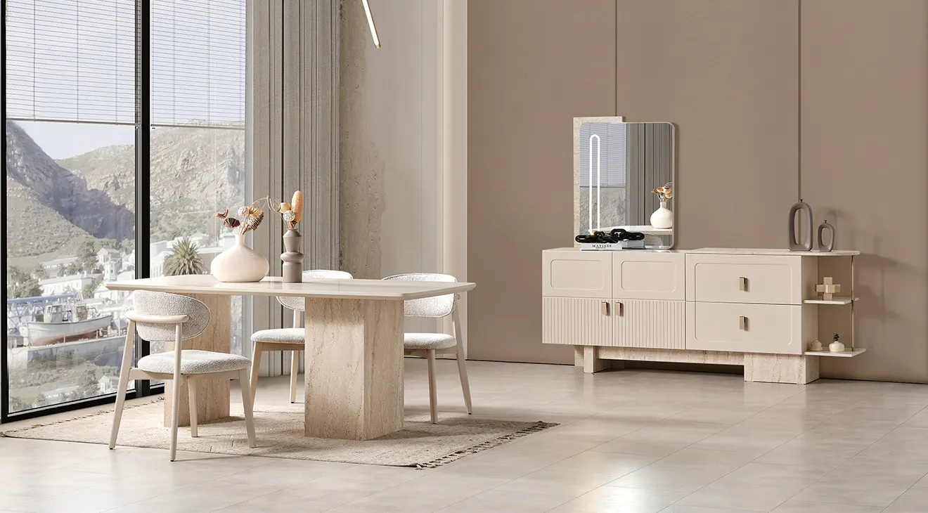 Lina, yumuşak krem tonları ve traverten görünümlü blok ayaklı masasıyla sıcak, minimalist bir atmosfer yaratır. Yuvarlatılmış hatlara sahip masa, konforlu bukle döşemeli sandalyeler ve kapak–çekmece kombinasyonlu geniş konsol ile hem estetik hem fonksiyoneldir. UV lak kaplama kolay temizlenir, açık raf ve modern ayna detayları mekâna derinlik katar. Modern, ferah ve sade bir yemek alanı arayanlar için ideal.