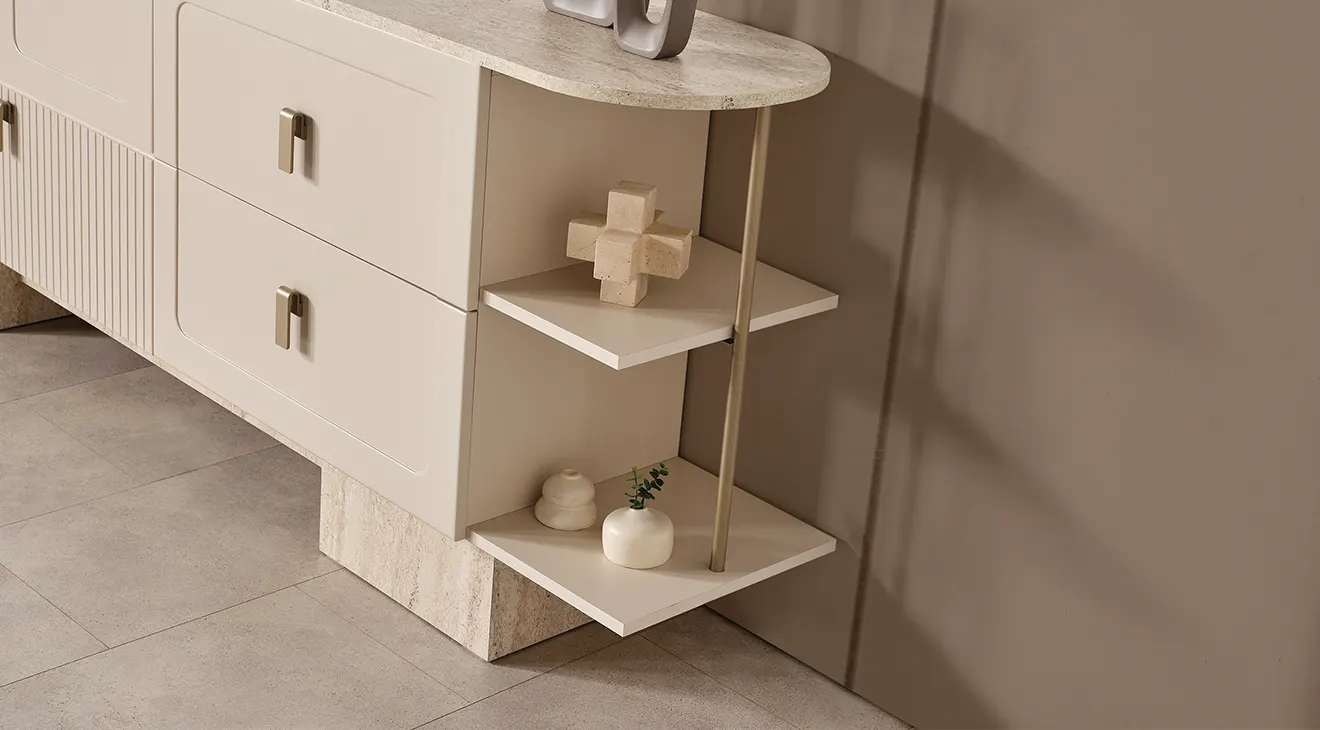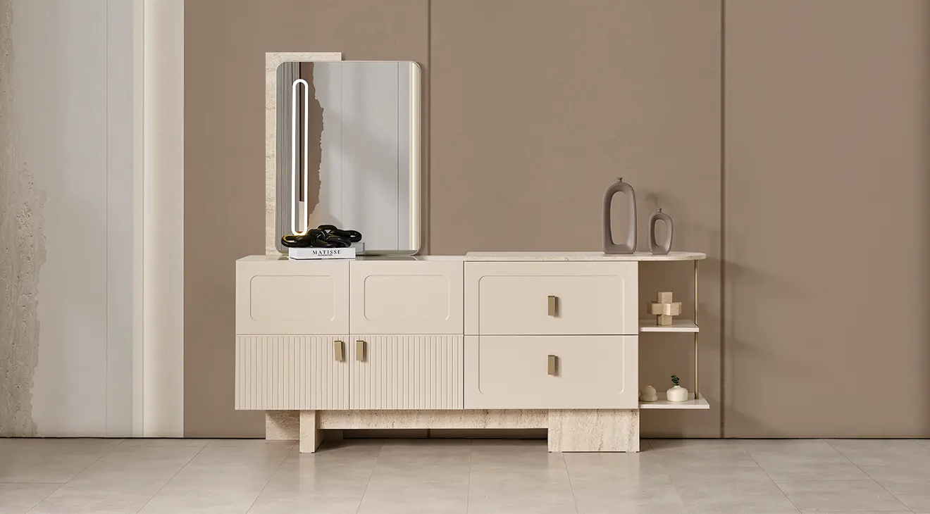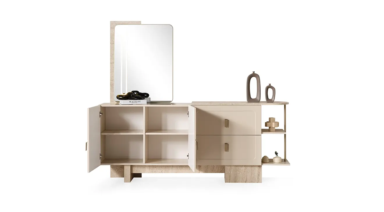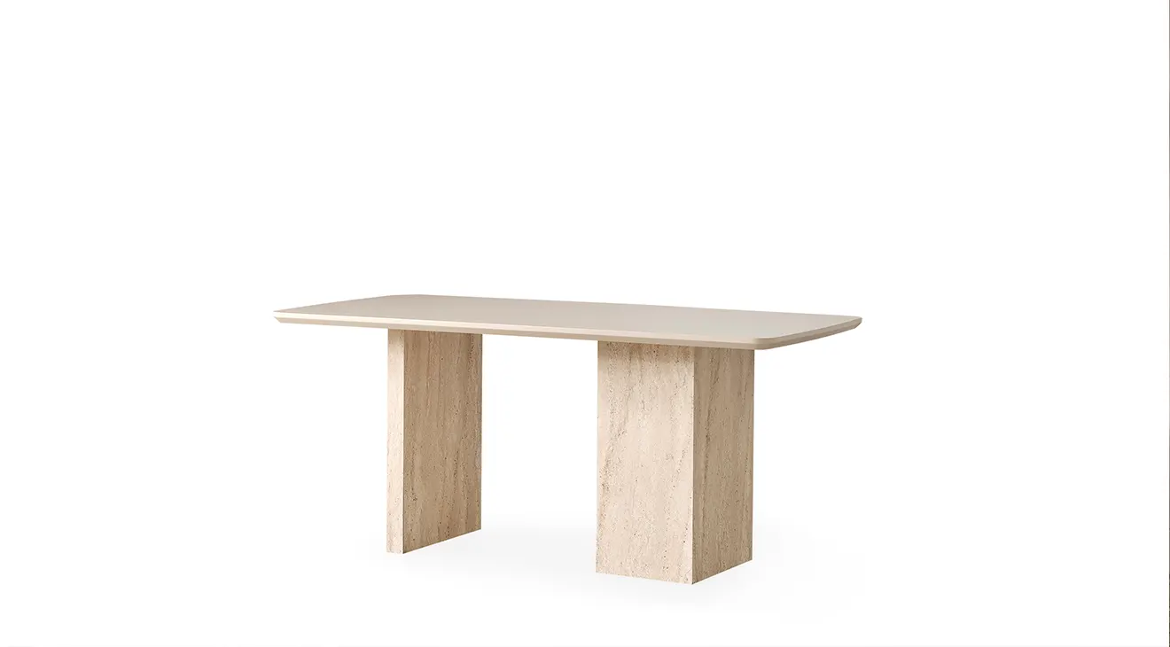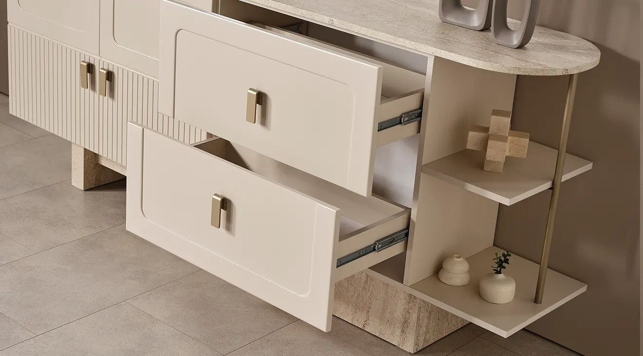 Lina, yumuşak krem tonları ve traverten görünümlü blok ayaklı masasıyla sıcak, minimalist bir atmosfer yaratır. Yuvarlatılmış hatlara sahip masa, konforlu bukle döşemeli sandalyeler ve kapak–çekmece kombinasyonlu geniş konsol ile hem estetik hem fonksiyoneldir. UV lak kaplama kolay temizlenir, açık raf ve modern ayna detayları mekâna derinlik katar. Modern, ferah ve sade bir yemek alanı arayanlar için ideal.