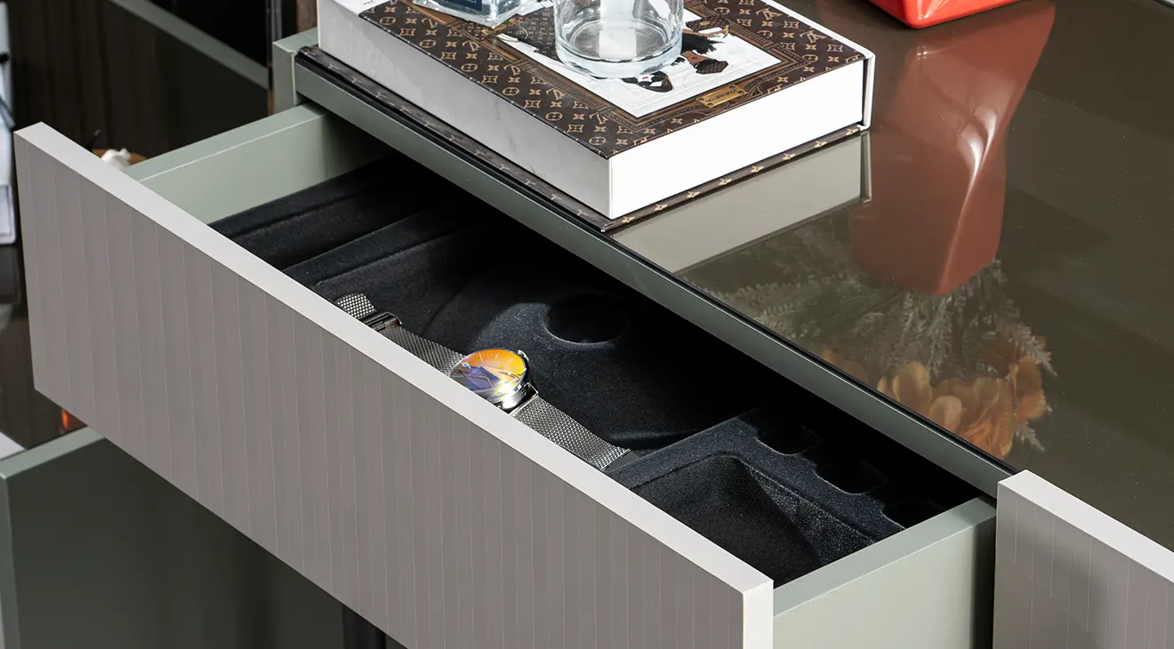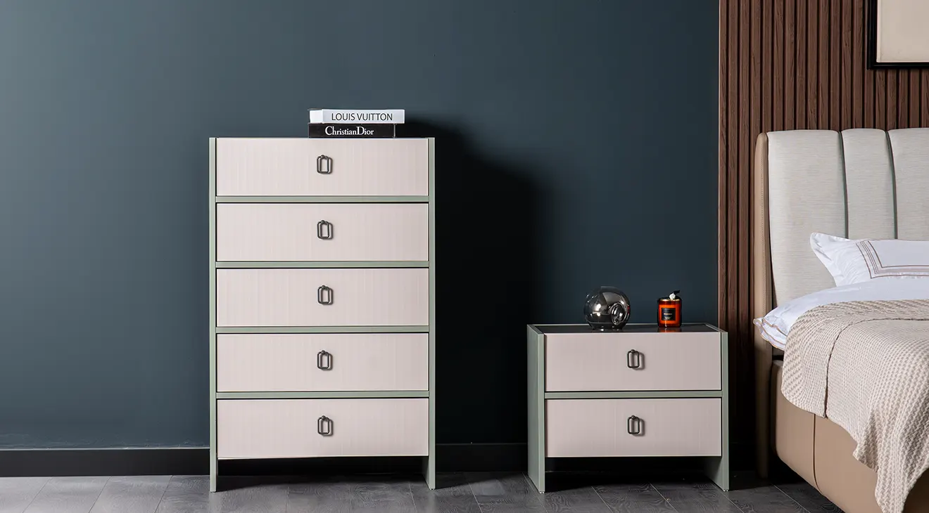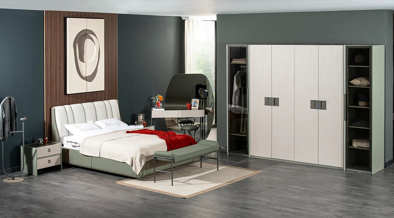 Los Angeles 6 Kapaklı Yatak Odası Takımı, yumuşak krem ve adaçayı yeşili tonlarıyla huzurlu bir atmosfer yaratır. Yüksek başlıklı kumaş döşemeli karyolası, iç düzenli altı kapaklı gardırobu, zarif çekmeceli komodini ve şifonyeriyle hem şık hem de fonksiyonel depolama çözümleri sunar.