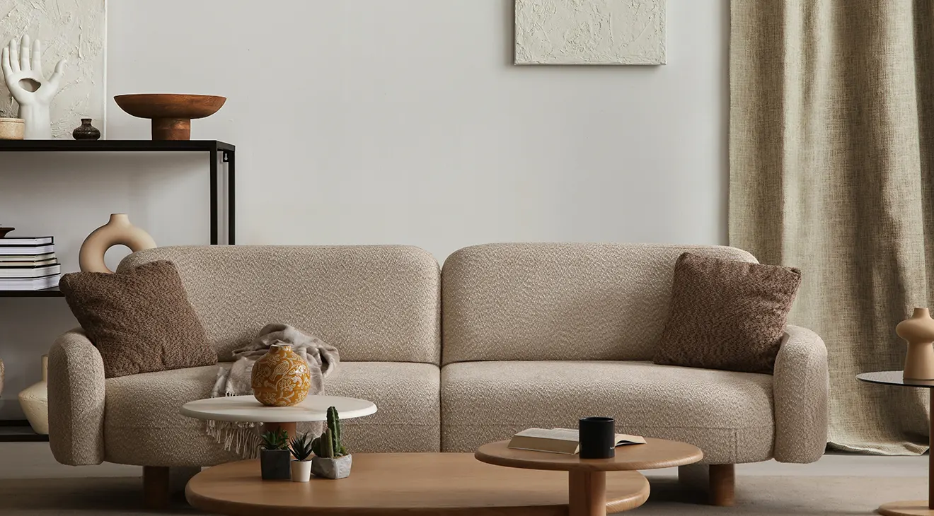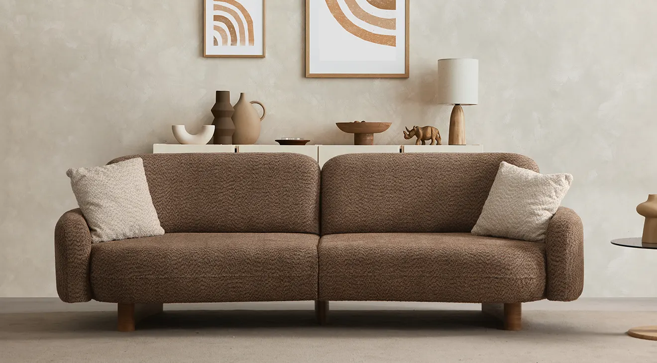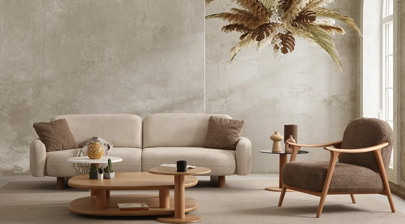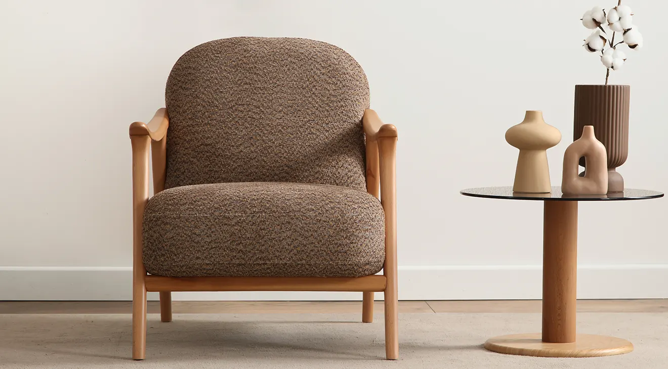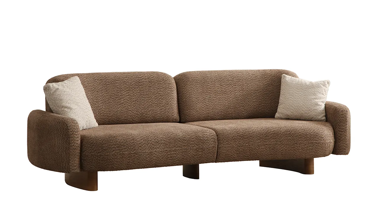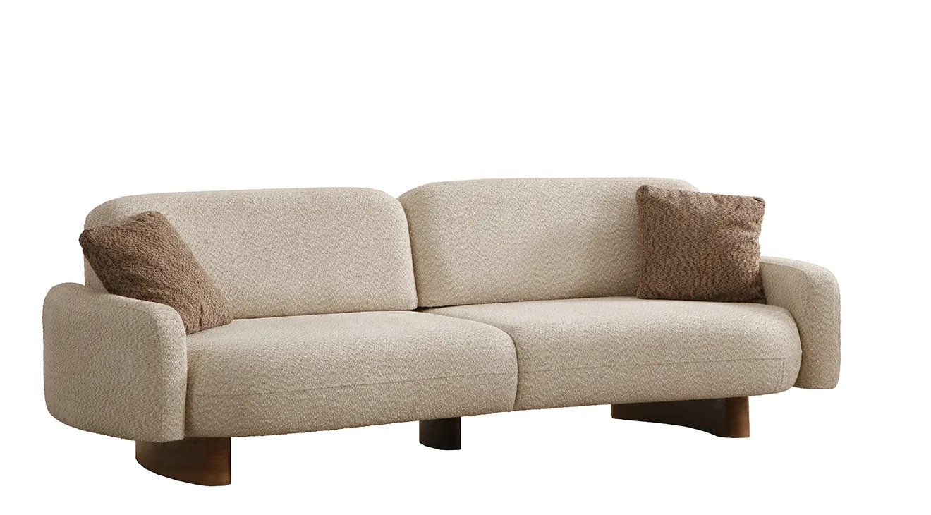 Lucca Ahşap Ayaklı Koltuk Takımı, doğal ahşap ayaklar ve yumuşak bouclé kumaşıyla oturma odanıza sıcak bir dokunuş getirir. Bej ve kahve tonlarında sunulan modern, kavisli hatlarıyla hem şık hem de davetkâr bir ambiyans yaratır. Ahşap detaylı orta sehpa ve yan sehpa ise fonksiyonelliği zarafetle buluşturur.