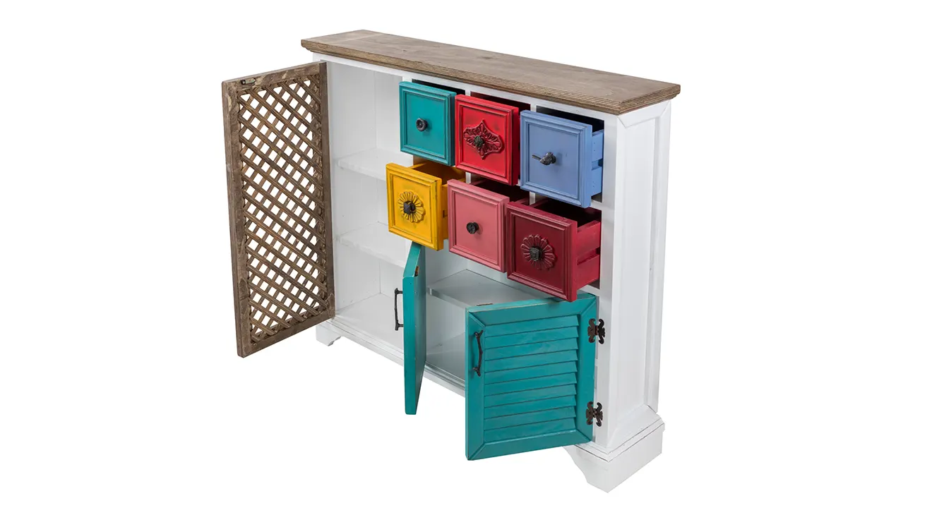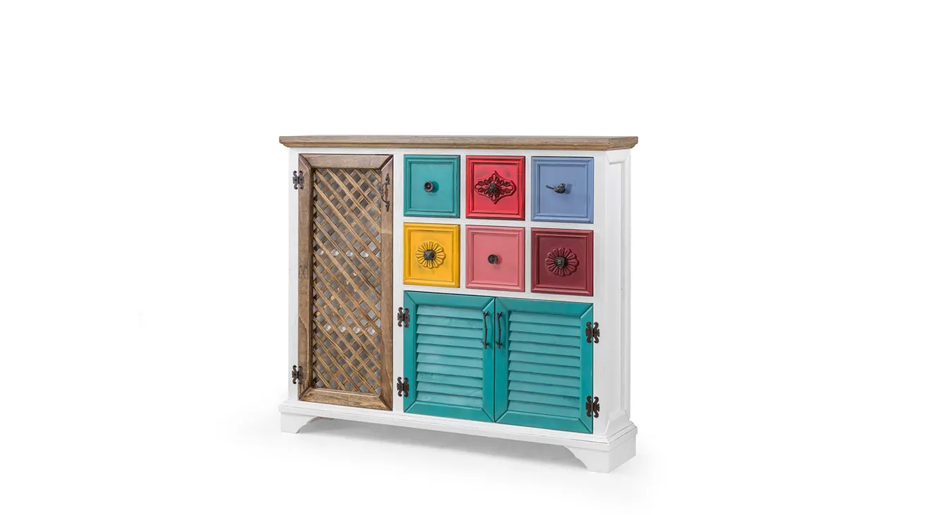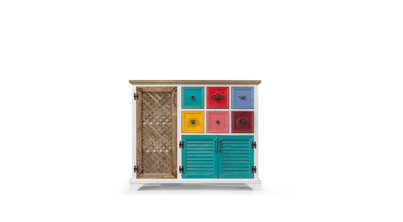 Lula Dresuar; beyaz gövde, ahşap üst ve renkli kabartmalı çekmeceleriyle girişe enerji katar. Kapaklı bölmeleriyle anahtar, evrak ve küçük eşyaları düzenler.