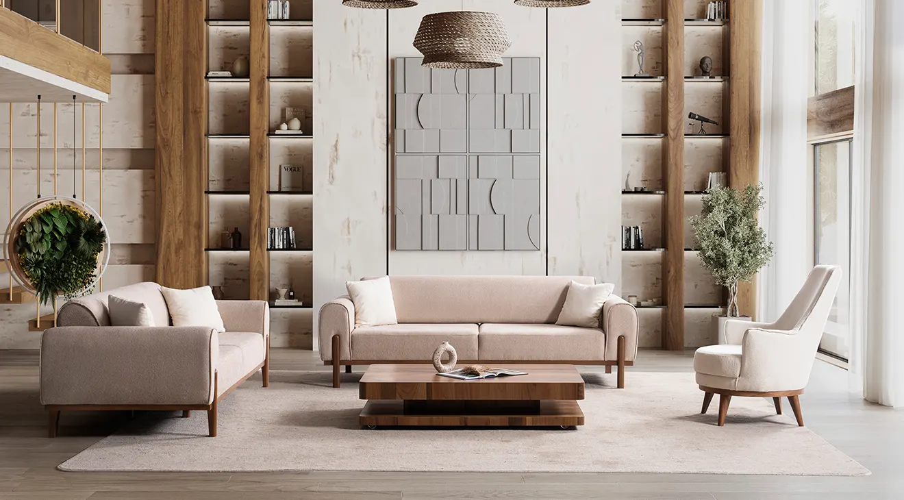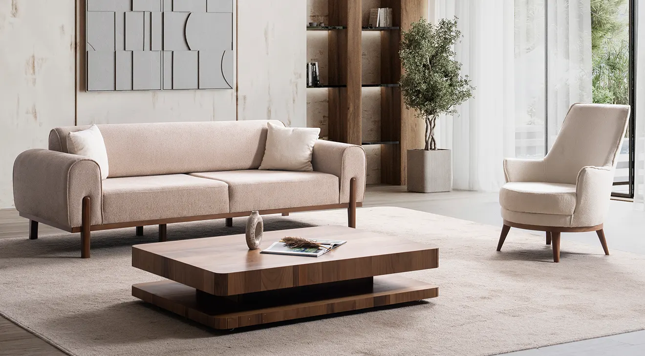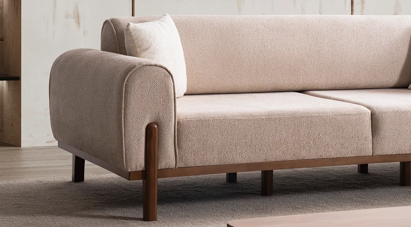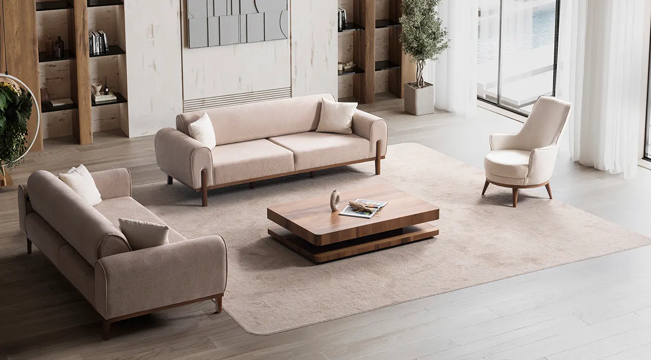 Luna ahşap ayaklı koltuk takımı; modern çizgi, yumuşak döşeme ve sağlam ahşapla salonunuza sıcak, ferah bir hava katar. 3+3+1 düzen ve İnegöl işçiliği.