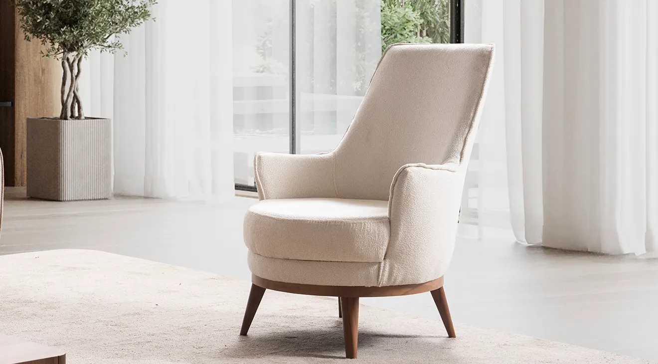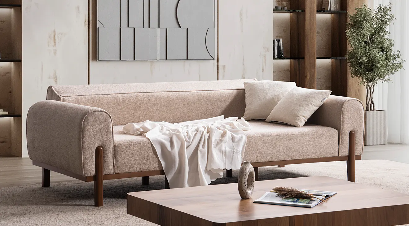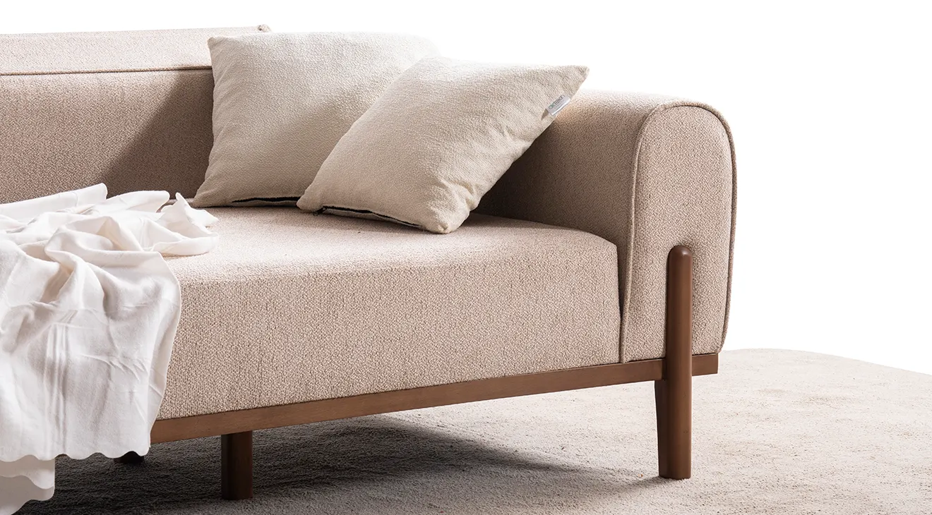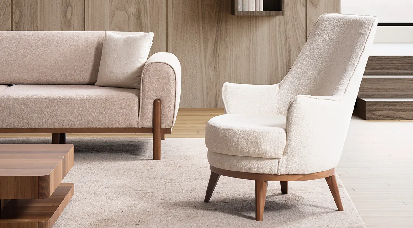 Luna ahşap ayaklı koltuk takımı; modern çizgi, yumuşak döşeme ve sağlam ahşapla salonunuza sıcak, ferah bir hava katar. 3+3+1 düzen ve İnegöl işçiliği.