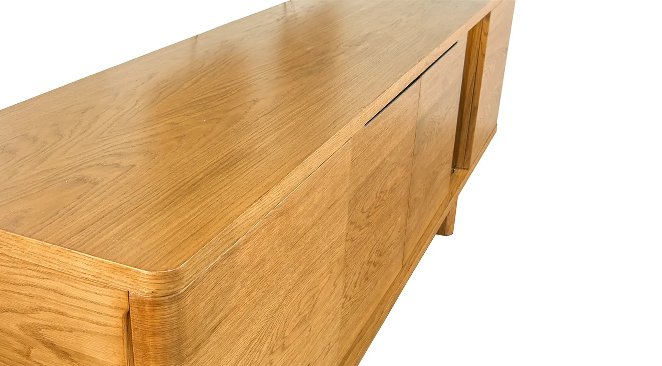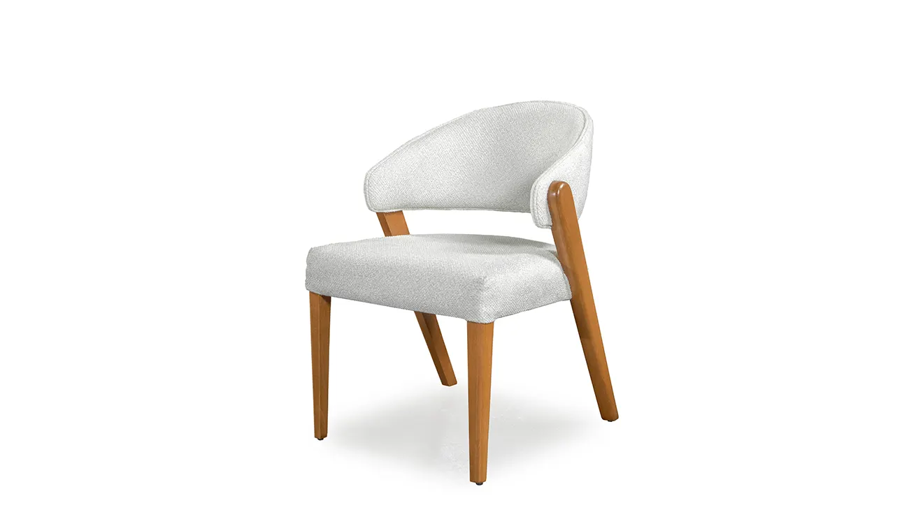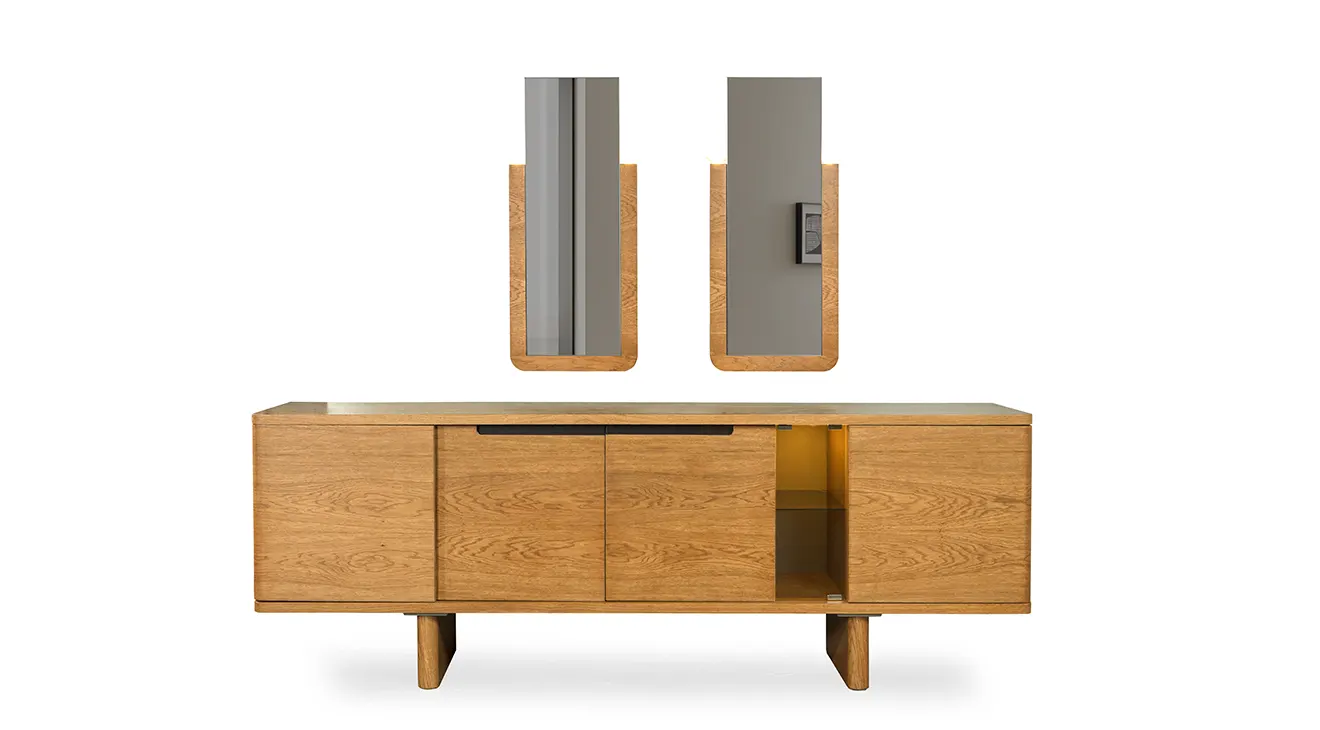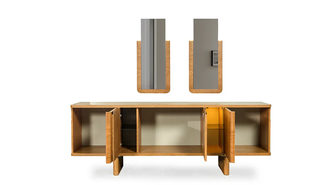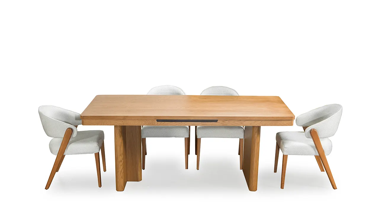 Maldiv Ahşap Ayaklı Yemek Odası Takımı, zarif kavisli detaylara ve doğal meşe dokusuna sahip. Şık konsol vitrin bölmesiyle hem misafirlerinize hem de günlük kullanıma sıcak bir atmosfer sunar.