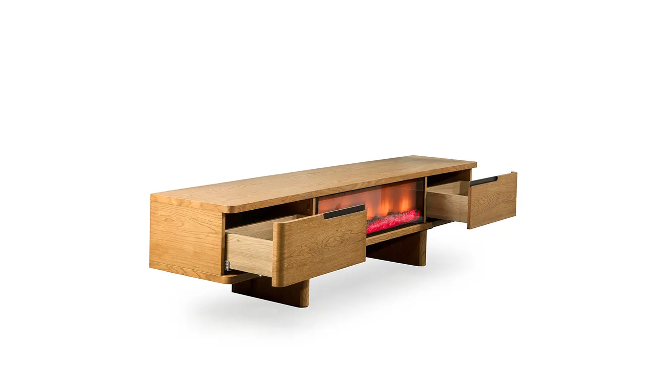 Maldiv Şömineli TV Ünitesi, doğal meşe ayakları ve cam şömine bölmesiyle salonunuza sıcaklık katıyor. Modern çizgileri ve cömert depolama alanıyla hem şık hem fonksiyonel.