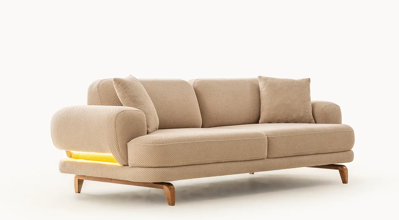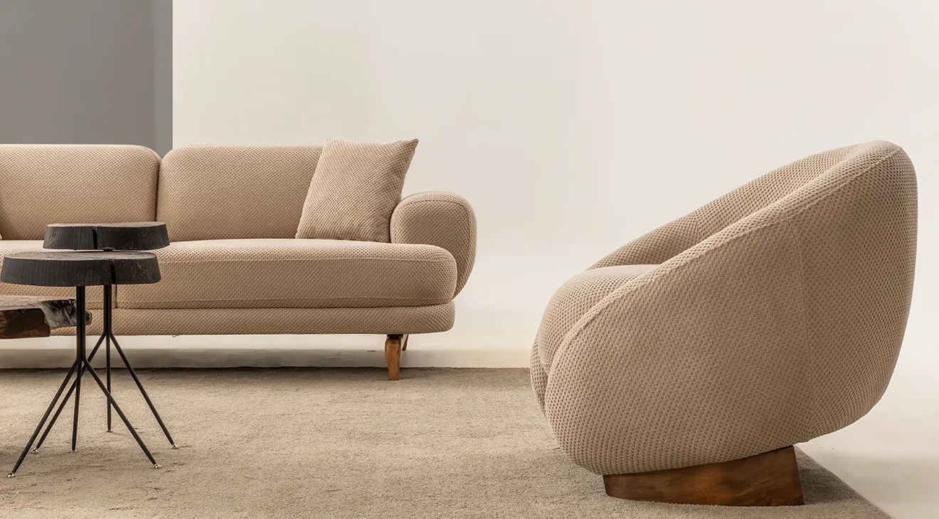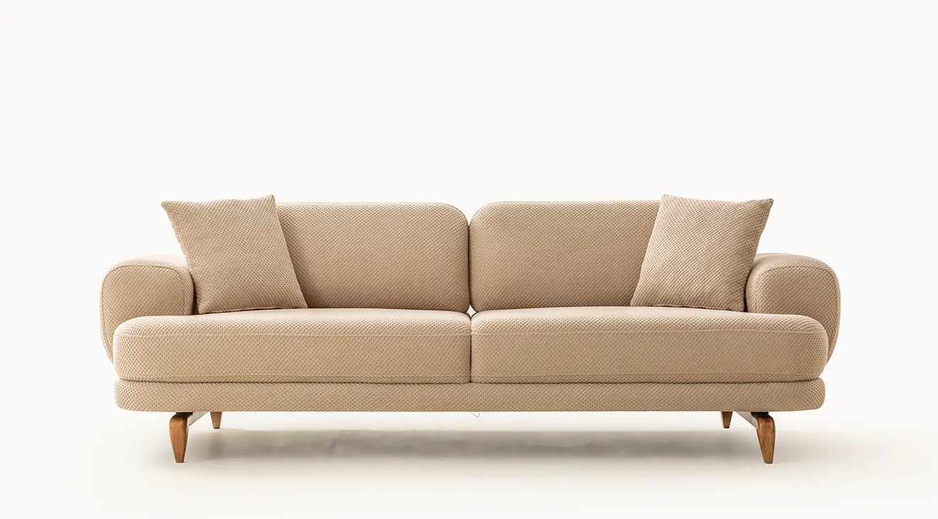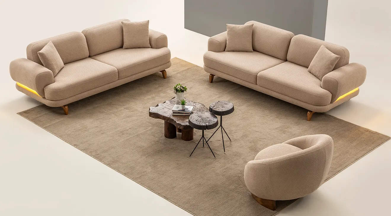 Milan Cappuccino Ahşap Ayaklı Koltuk Takımı, yumuşak dokulu cappuccino kumaşı ve zarif ahşap ayak detaylarıyla salonunuza sıcak ve modern bir atmosfer kazandırır.