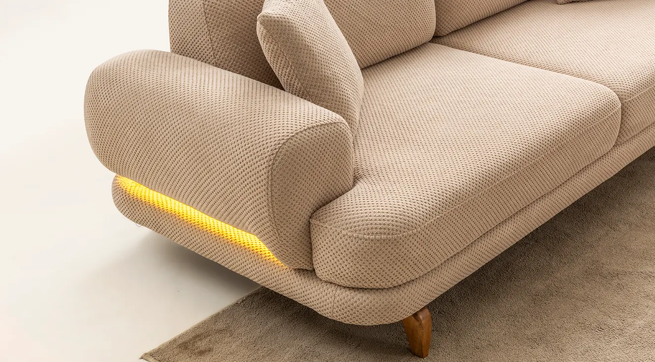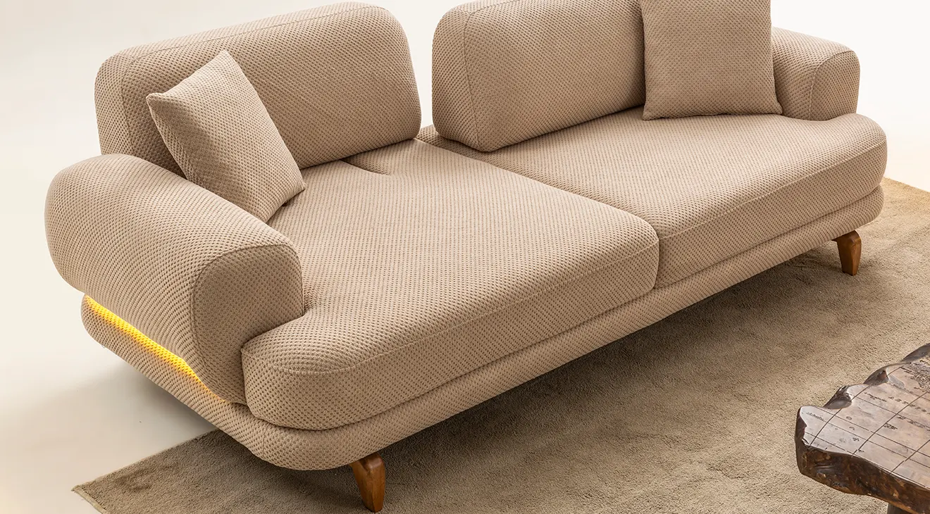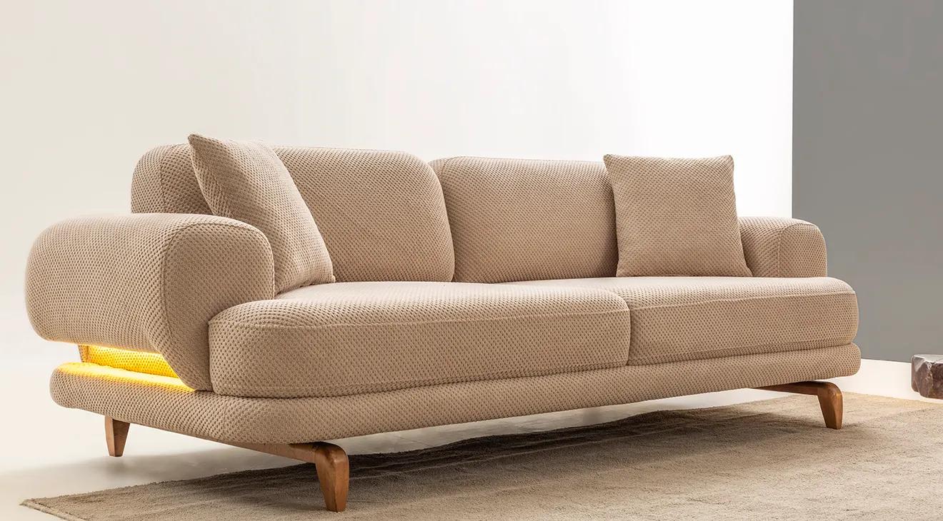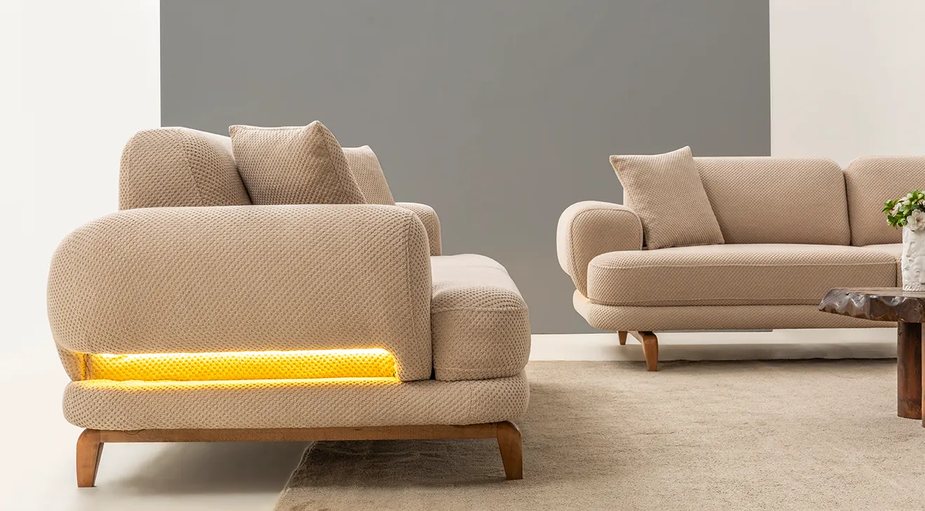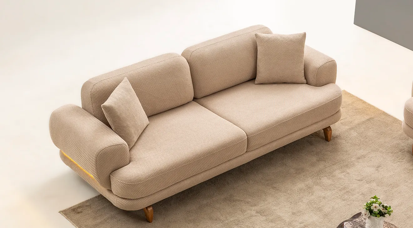 Milan Cappuccino Ahşap Ayaklı Koltuk Takımı, yumuşak dokulu cappuccino kumaşı ve zarif ahşap ayak detaylarıyla salonunuza sıcak ve modern bir atmosfer kazandırır.