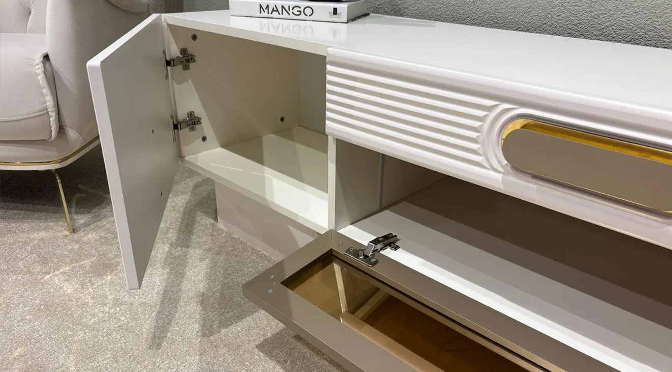 Milano Gold TV Ünitesi, süt beyazı yüzeyine eşlik eden altın şeritler ve oluklu (fluted) kapak detaylarıyla salonunuza modern-lüks bir ifade kazandırır. Geniş TV sehpasında iki yan dolap ve ortada bronz aynalı, aşağı açılır kapaklı bölme; üst modülde ise raflı, kapaklı dolap yer alır. Uzun oval kulplar, pürüzsüz açılır-kapanır menteşeler ve dayanıklı yüzey yapısı günlük kullanımı kolaylaştırır. Kablo geçişine uygun iç düzeni, yüksek depolama kapasitesi ve zarif hatlarıyla Milano Gold; İnegöl mobilya kalitesini estetik ve işlevle buluşturur.
