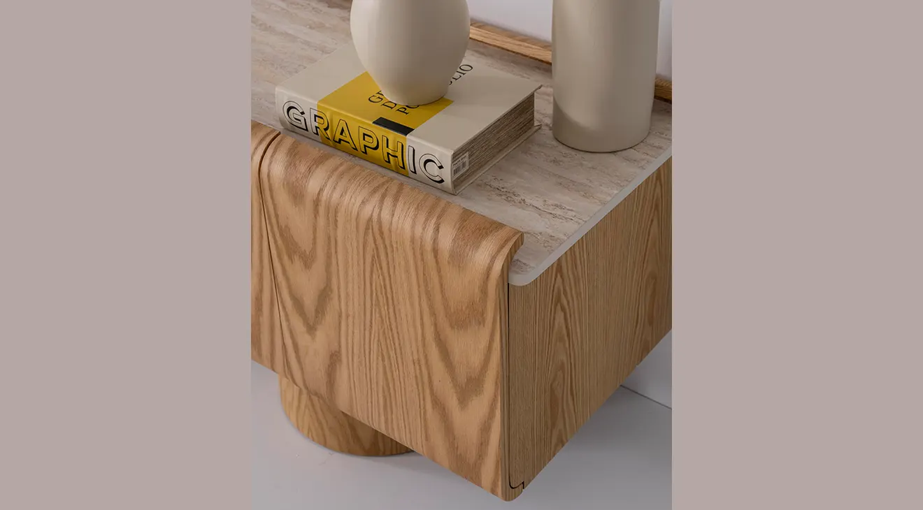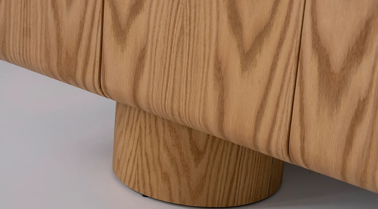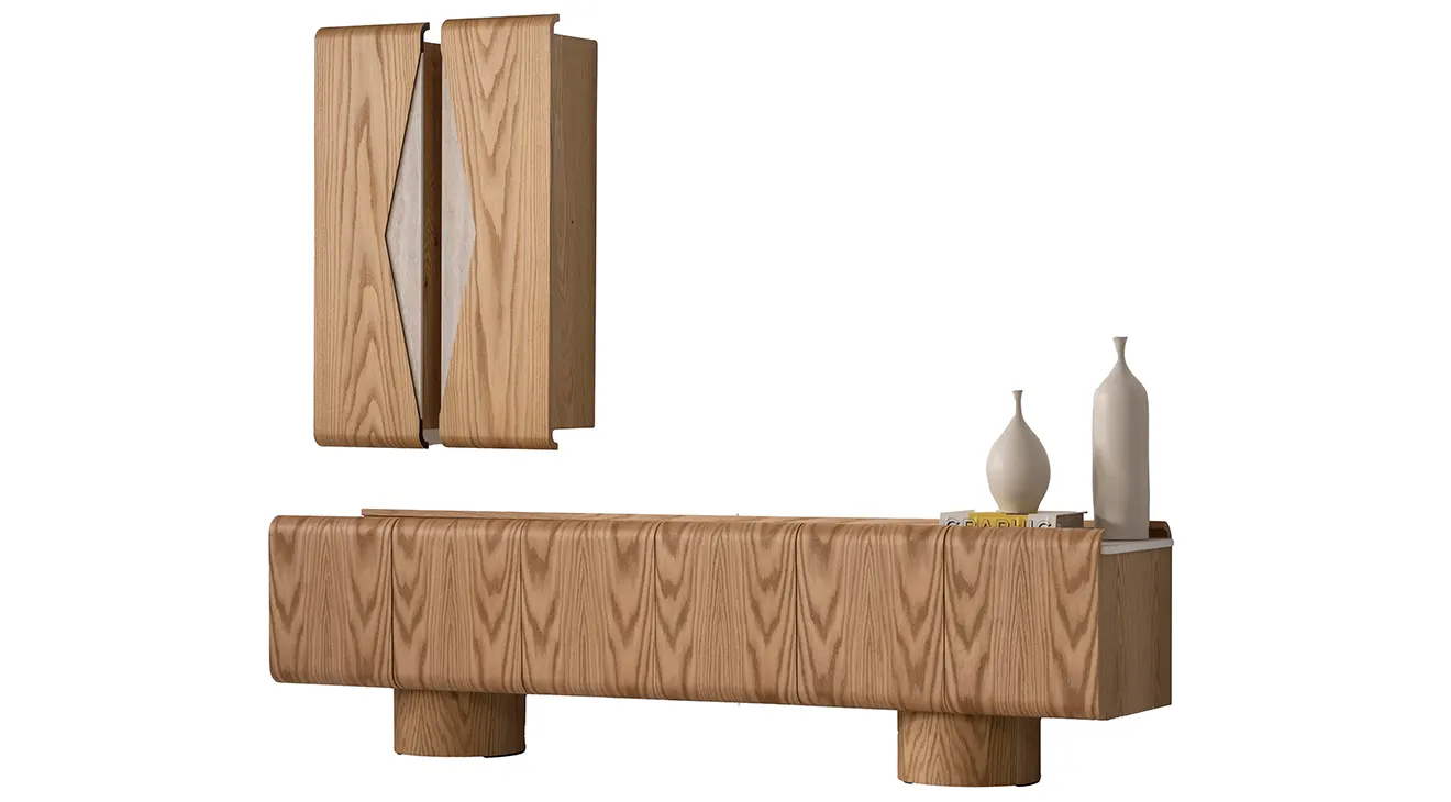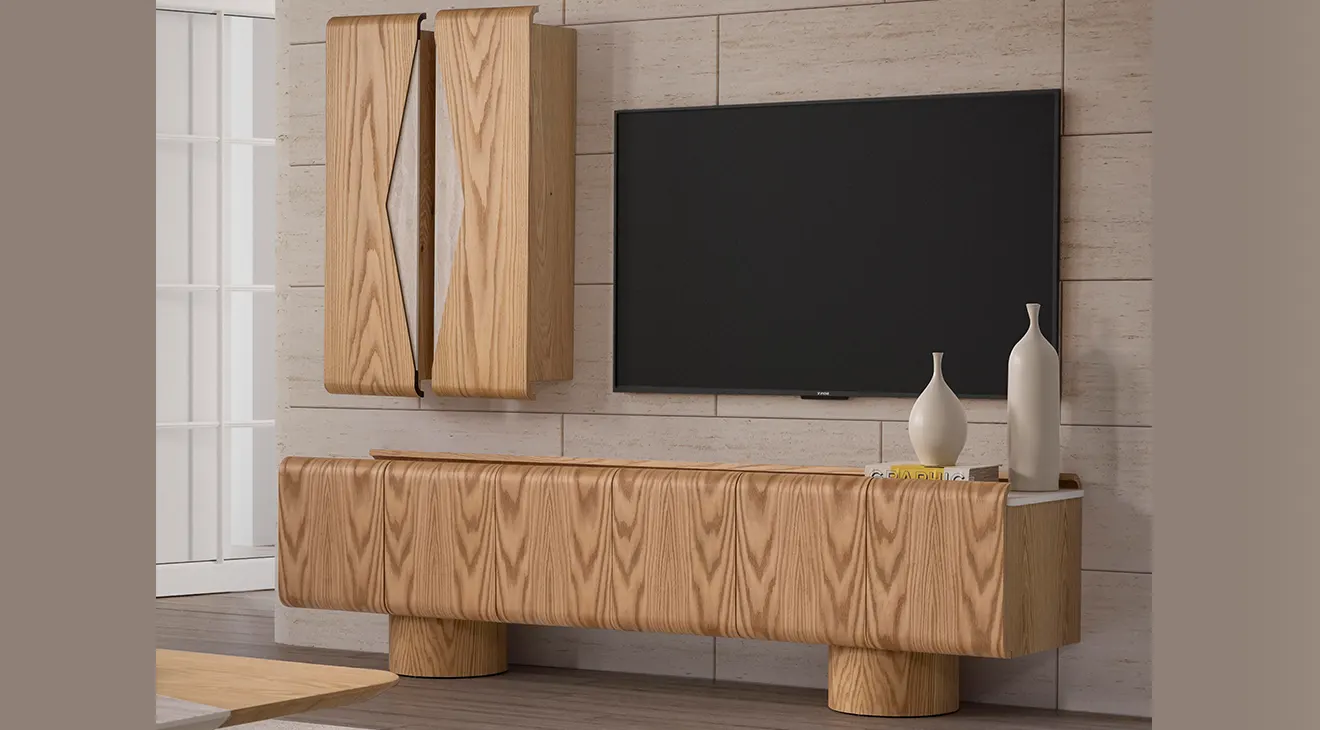 Milano Meşe Modern TV Ünitesi: doğal meşe doku, yuvarlak hatlar ve duvar modülleriyle geniş depolama. Şık, sıcak ve dayanıklı salon çözümü.