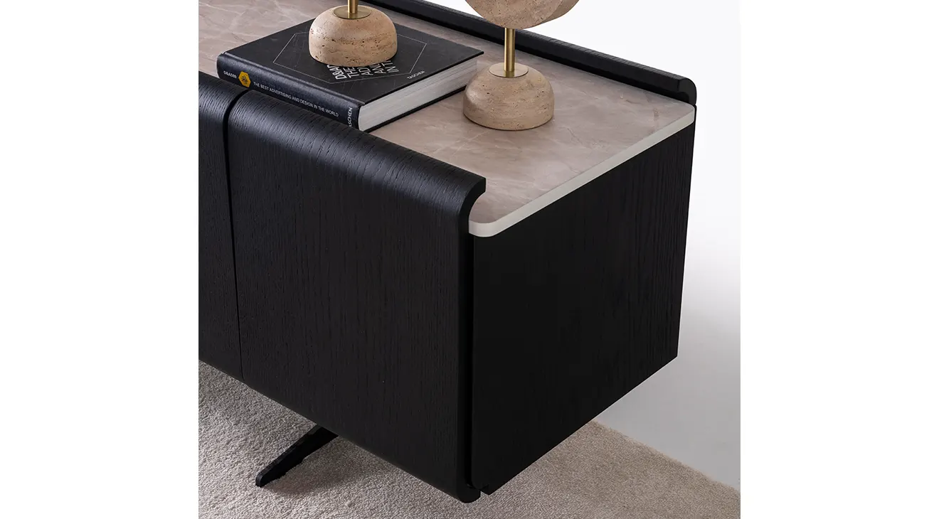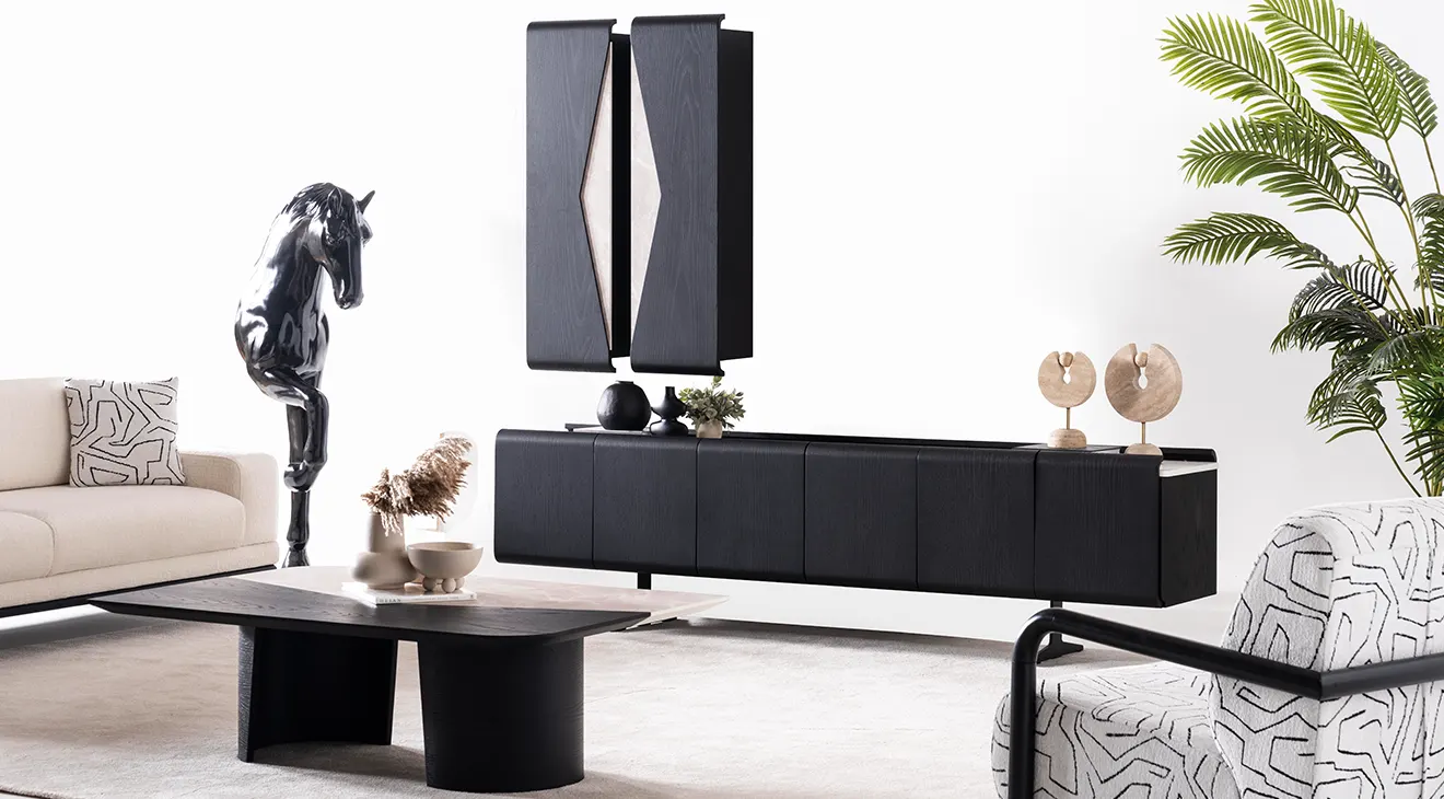 Milano Modern TV Ünitesi: siyah ahşap doku, metal ayaklar ve modüler üst dolaplarla şık depolama. Salonunuzda TV ve aksesuarlar için düzenli, modern bir çözüm.