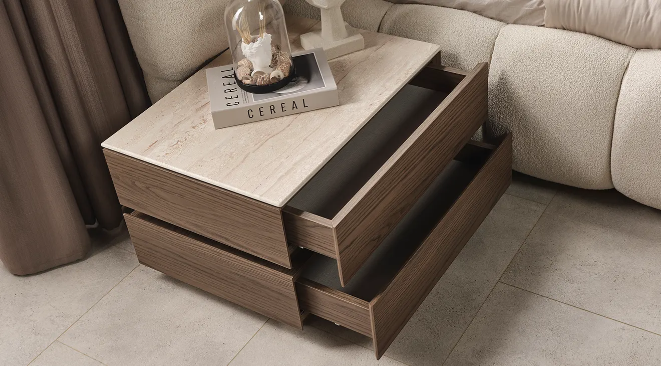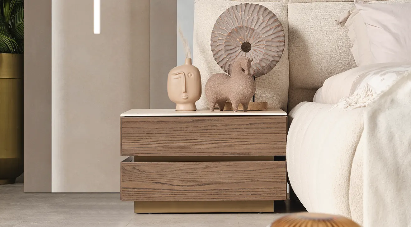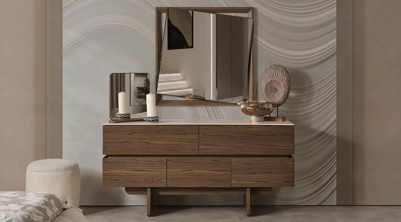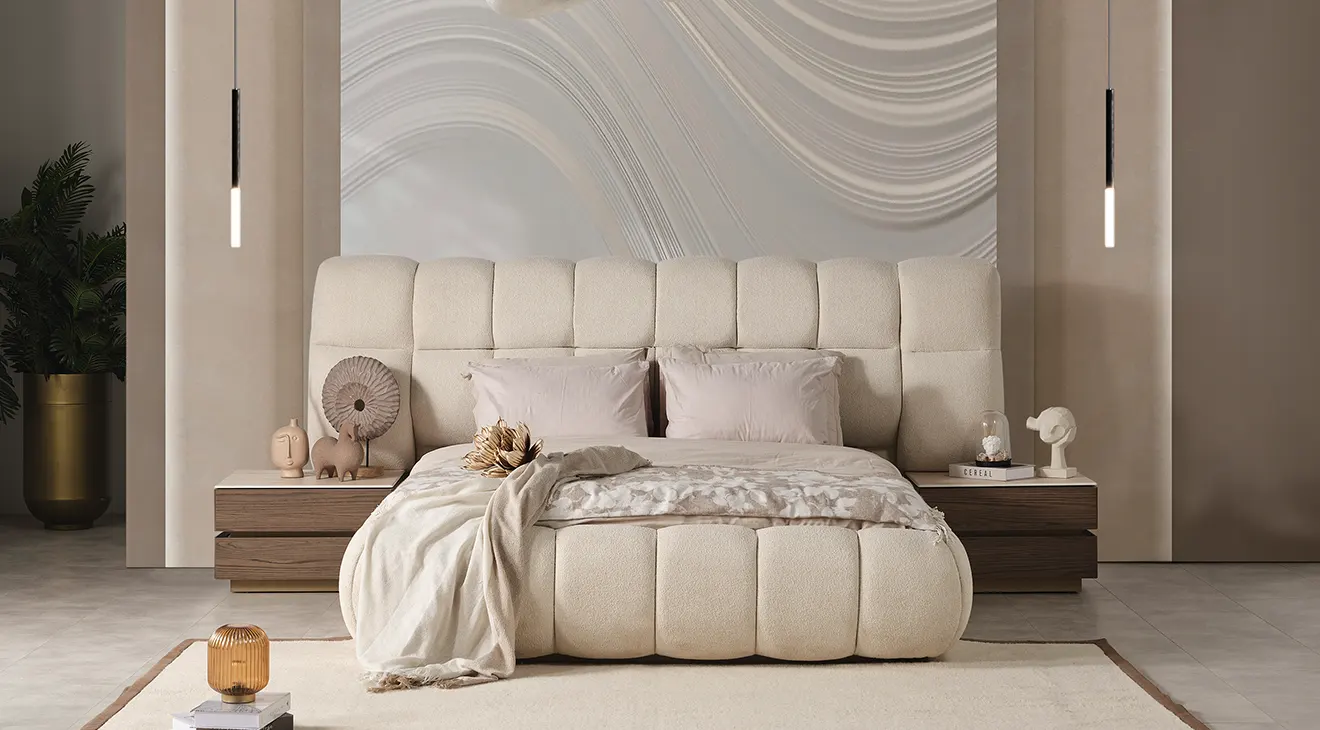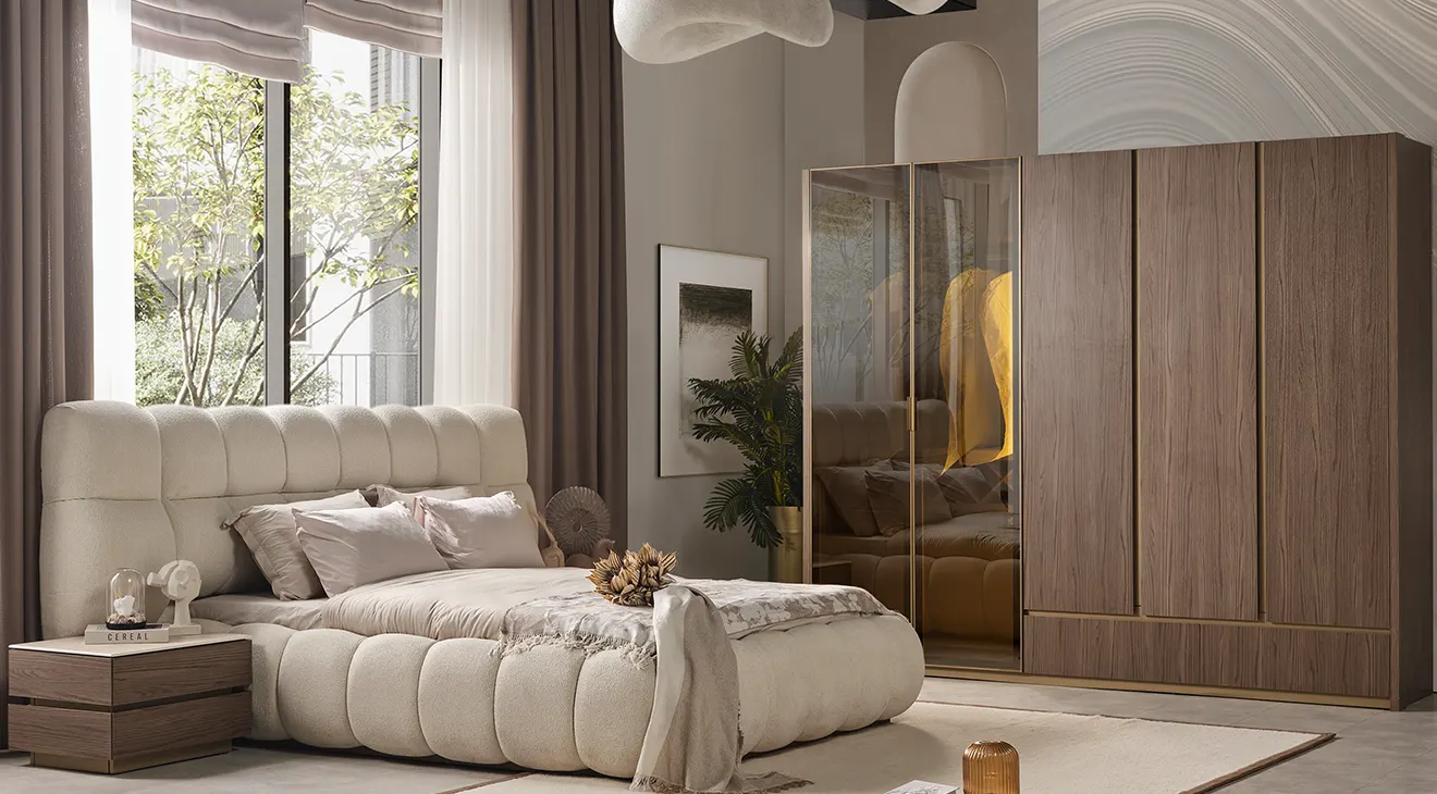 Monna 5 Kapaklı Yatak Odası Takımı, doğal ahşap dokulu yüzeyleri, cam kapaklı gardırobu ve zarif detaylarıyla modern yatak odalarına sofistike dokunuş katıyor. Yumuşak döşemeli karyola, fonksiyonel şifonyer ve uyumlu komodinlerle konfor ve estetik bir arada. Şık tasarım, geniş depolama ve dengeli renk paletiyle yaşam alanınıza değer katar.