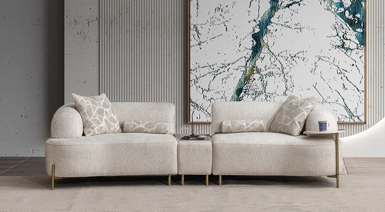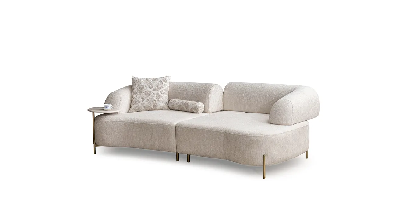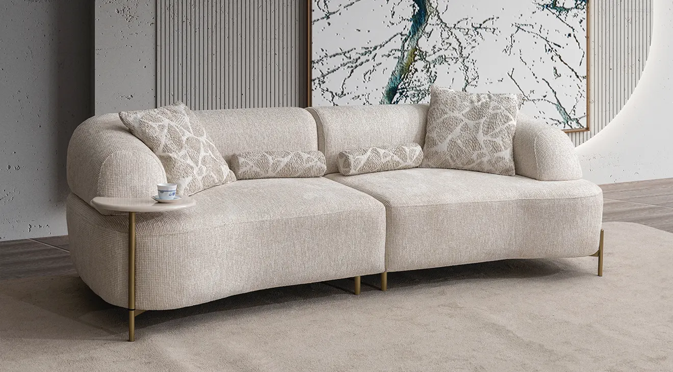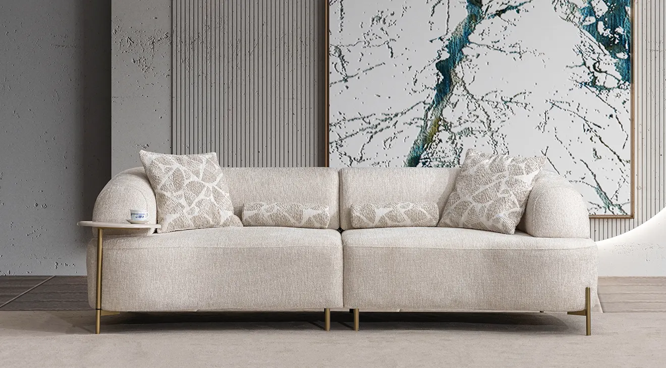 Kıvrımlı hatları, krem dokulu döşemesi ve gold ton ayaklarıyla modern ve yumuşak bir görünüm sunar. Geniş oturumlu kanepeler sırt mekanizmasıyla kolayca yataka dönüşür; entegre mini servis tablaları ve relax modülüyle konforu artırır. Yüksek ayak yapısı temizlikte avantaj sağlar; takım iki kanepe ve berjer seçeneğiyle tamamlanır.