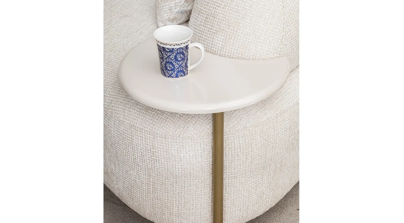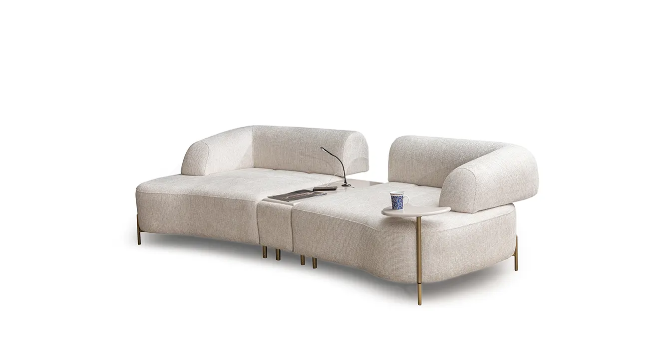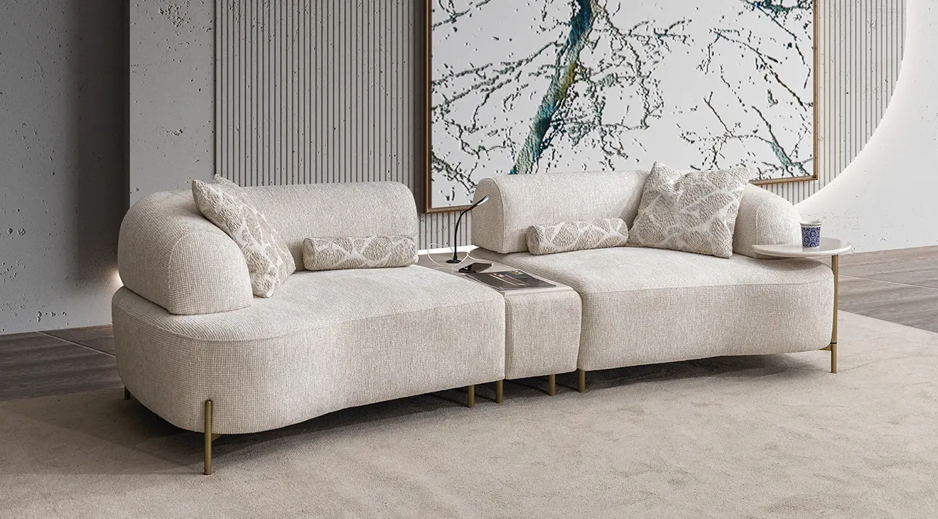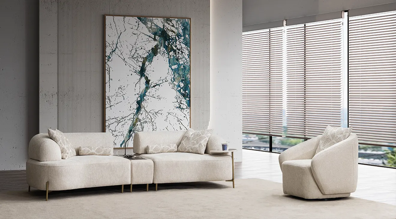 Kıvrımlı hatları, krem dokulu döşemesi ve gold ton ayaklarıyla modern ve yumuşak bir görünüm sunar. Geniş oturumlu kanepeler sırt mekanizmasıyla kolayca yataka dönüşür; entegre mini servis tablaları ve relax modülüyle konforu artırır. Yüksek ayak yapısı temizlikte avantaj sağlar; takım iki kanepe ve berjer seçeneğiyle tamamlanır.