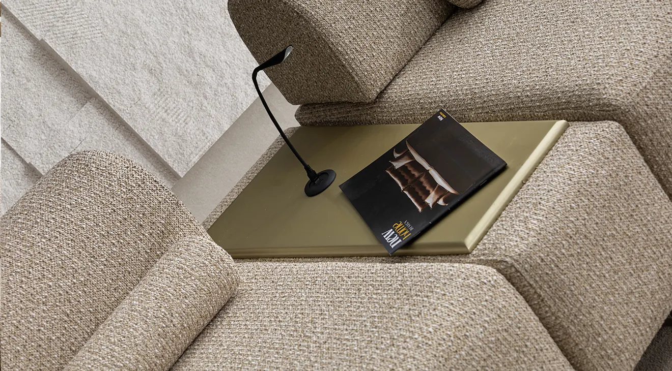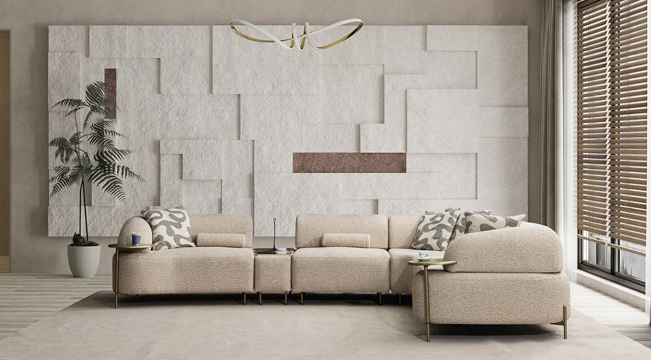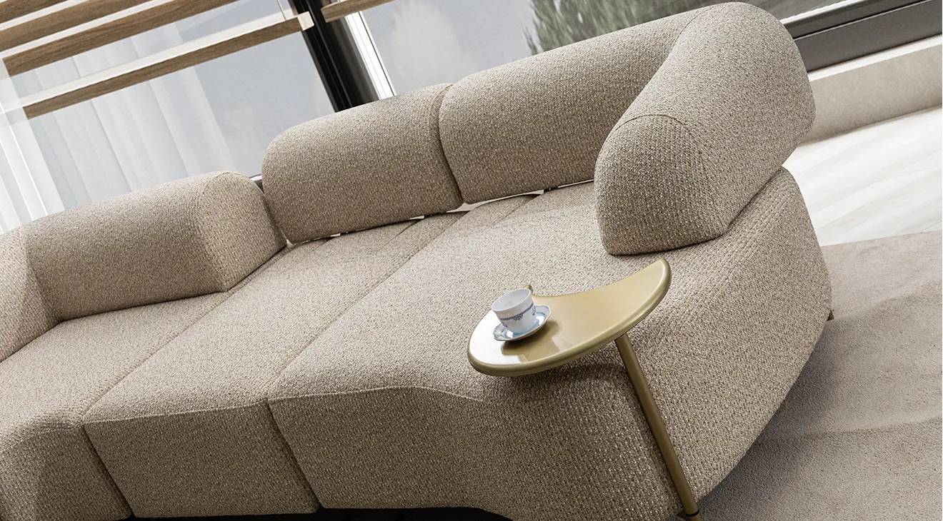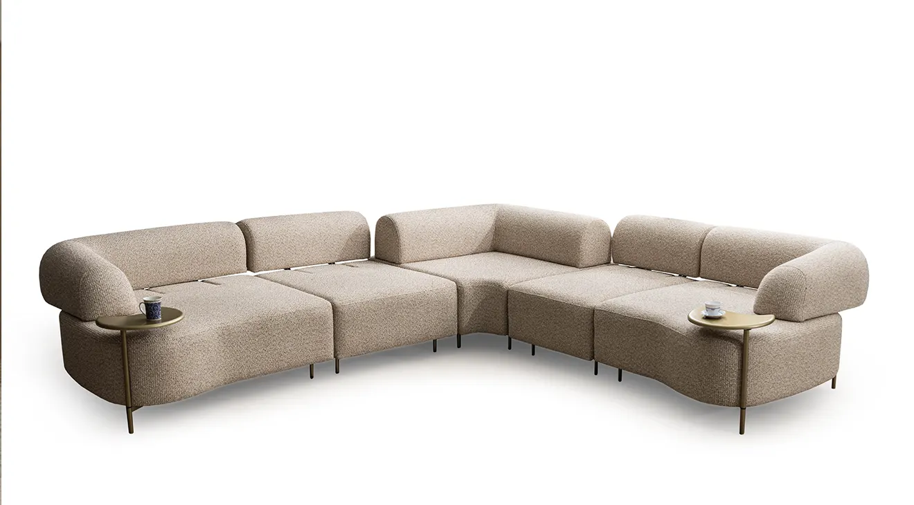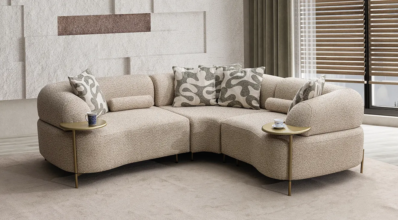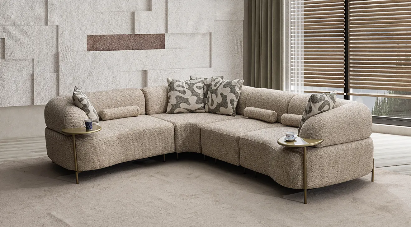 Kıvrımlı hatlar, krem dokulu döşeme ve gold ton ayaklarla modern-yumuşak bir estetik sunar. Modüler L köşe düzeni geniş oturum sağlar; sırt mekanizmasıyla kolayca yataka dönüşür. Entegre mini servis tablaları ve relax/uzanma modülü konforu artırır. Yüksek ayak yapısı temizlikte avantaj sağlar; sağ/sol yön seçenekleriyle farklı mekânlara uyum sağlar.