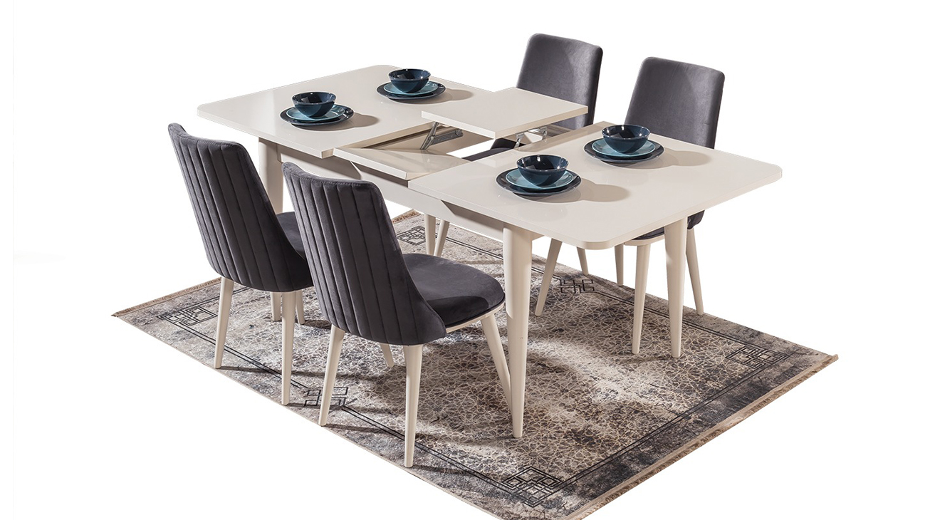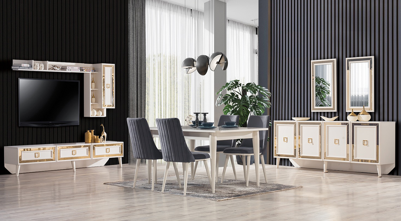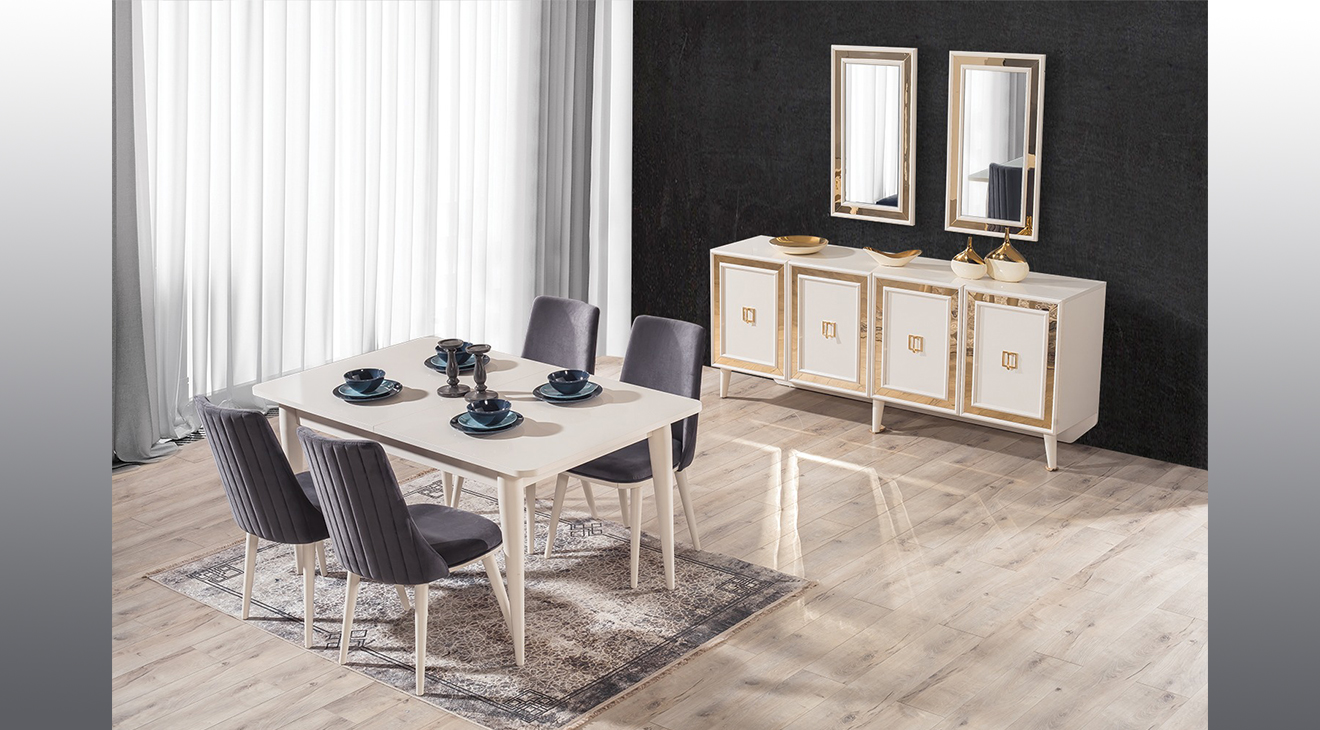 New Gold Yemek Odası Takımı; Ay taşı rengi, şık görünümü ve zarif duruşuyla dikkat çeken Yemek Odası Takımı Mobilyamevime de sizlere sunuyoruz.