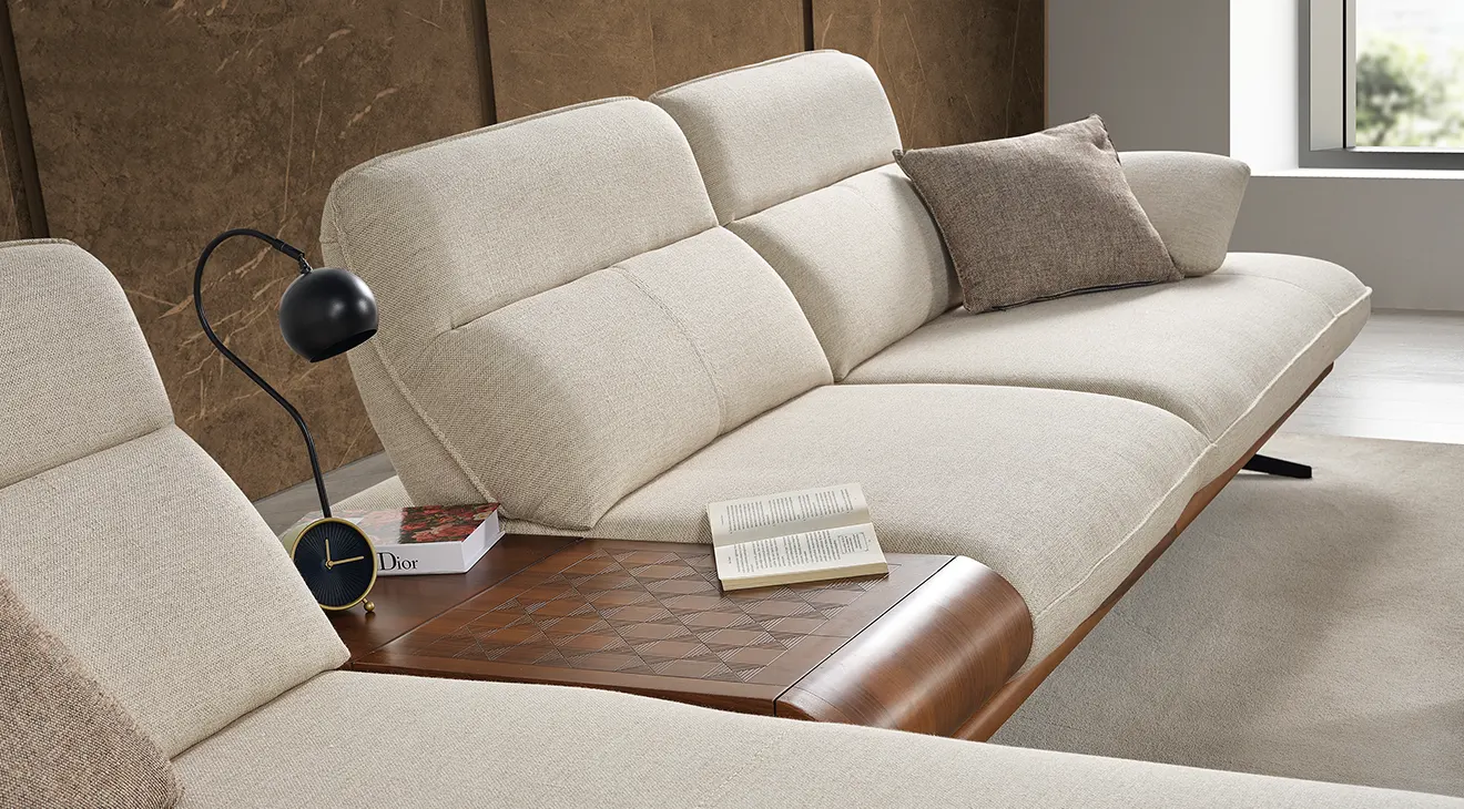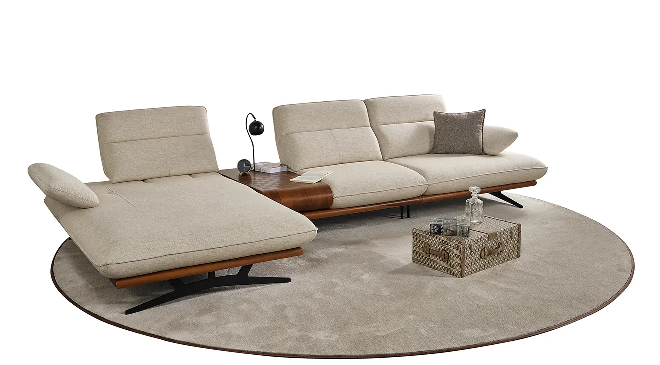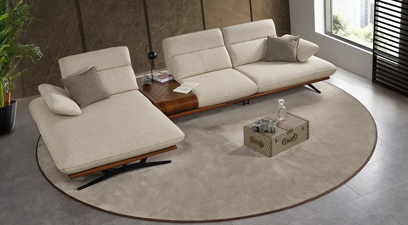 NewYork Relax, ince metal ayakları ve sıcak ahşap plakalı zeminiyle çağdaş bir köşe takımı sunuyor. Geniş oturma alanı, ayarlanabilir başlıklara ve entegre orta sehpasına sahip; uzanıp dinlenmeyi davet eden rahat bir şezlong kısmı içeriyor. Nötr bej kumaş döşemesi, her dekorasyona uyum sağlayacak yumuşak bir dokunuş katıyor.
