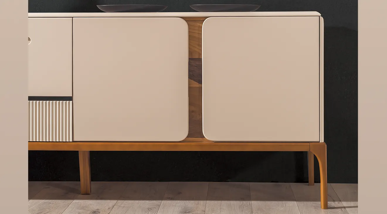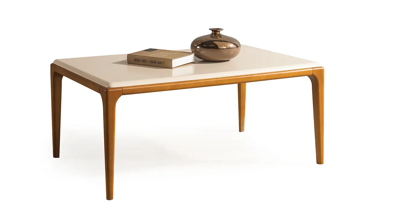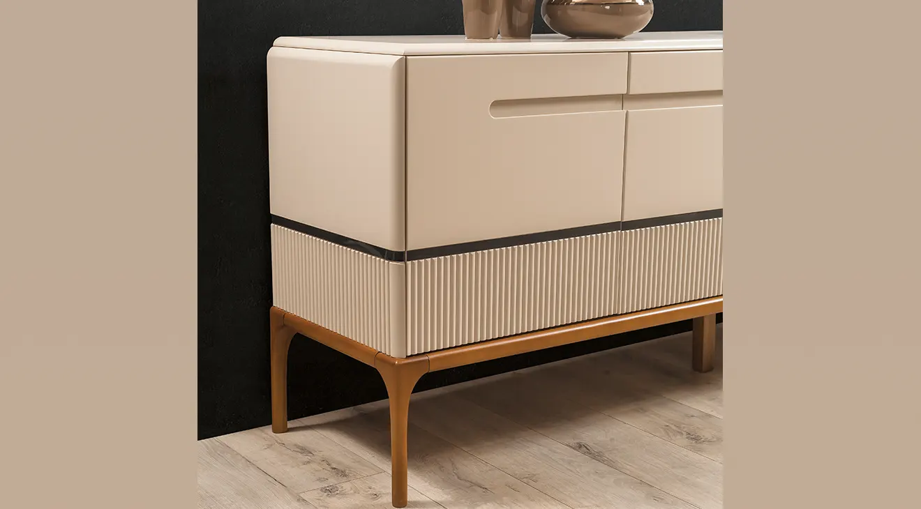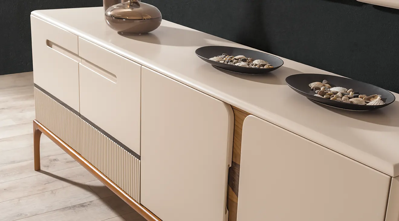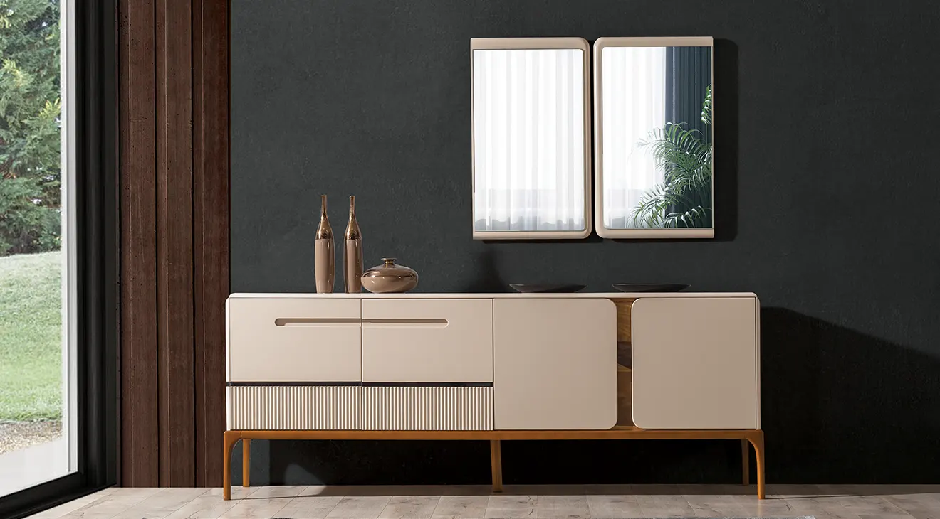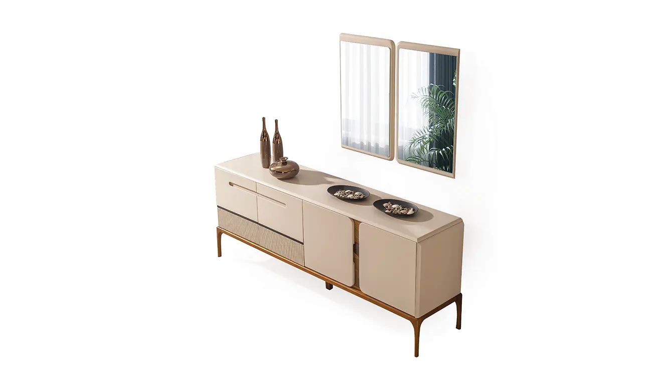 Nirvana Ahşap Ayaklı Yemek Odası Takımı, krem lake kaplamalı masası ve doğal meşe ayaklı sandalyeleriyle modern bir sıcaklık sunuyor. Masanın zarif profilli tabla kenarları, takımın çekmeceli konsolu ve dekoratif iki aynayla uyum içinde. Konsol altındaki freze desenli detaylar, mekâna ince dokunuşlar katarken, geniş masa üstü ailenizle uzun sohbetlere davet ediyor. Minimal çizgiler ve kaliteli malzeme birleşimi, Nirvana’yı her evin odak noktasına dönüştürüyor.