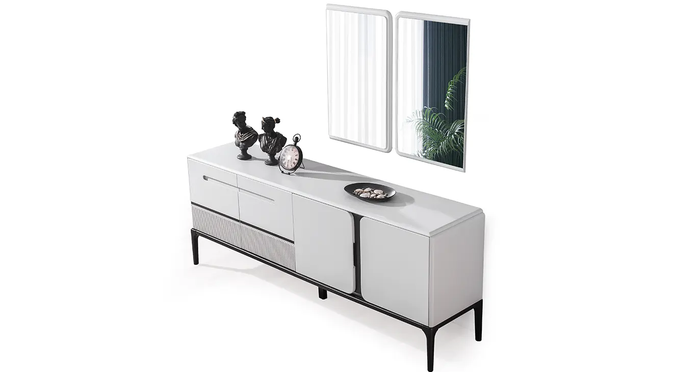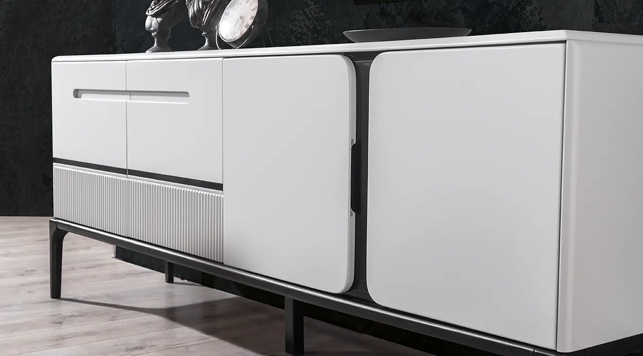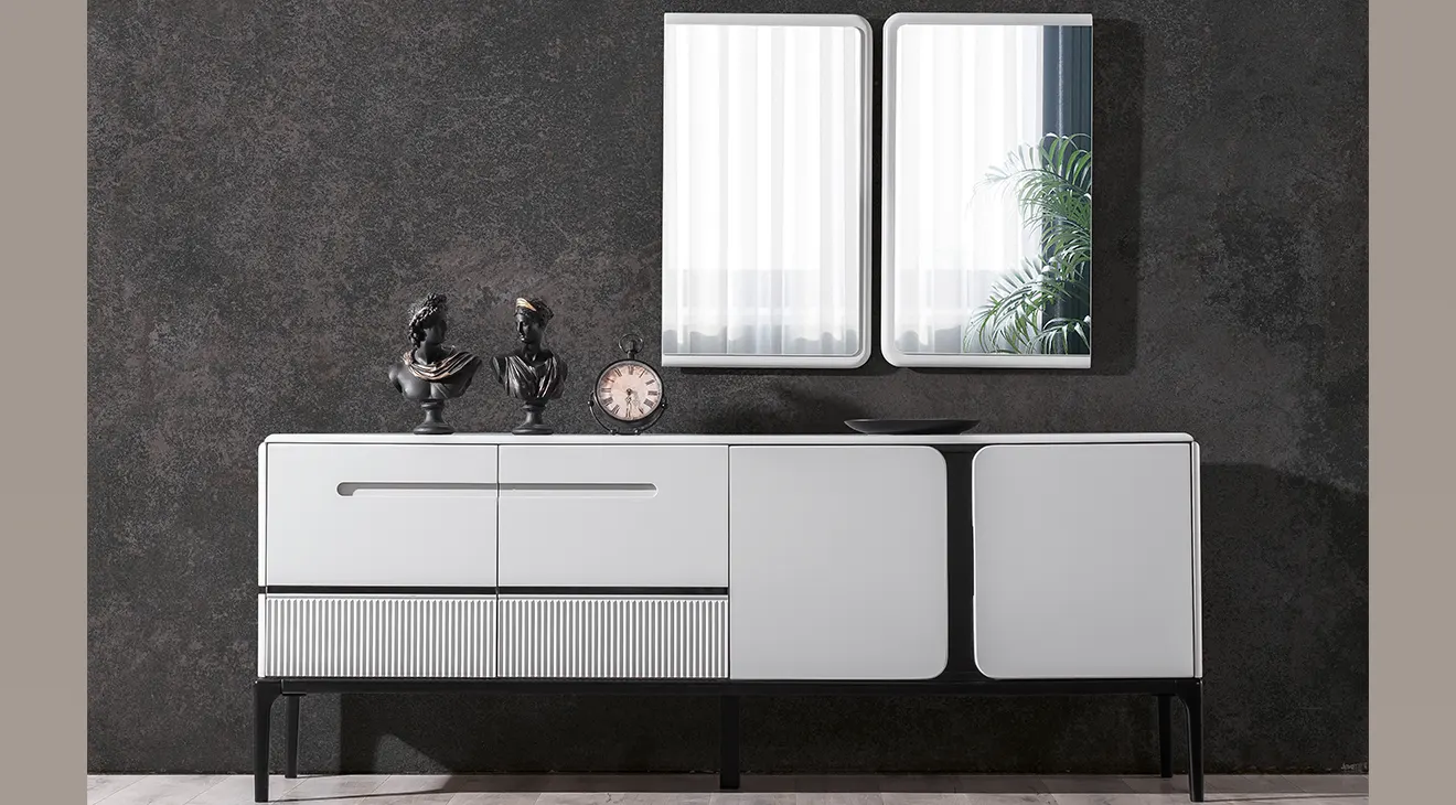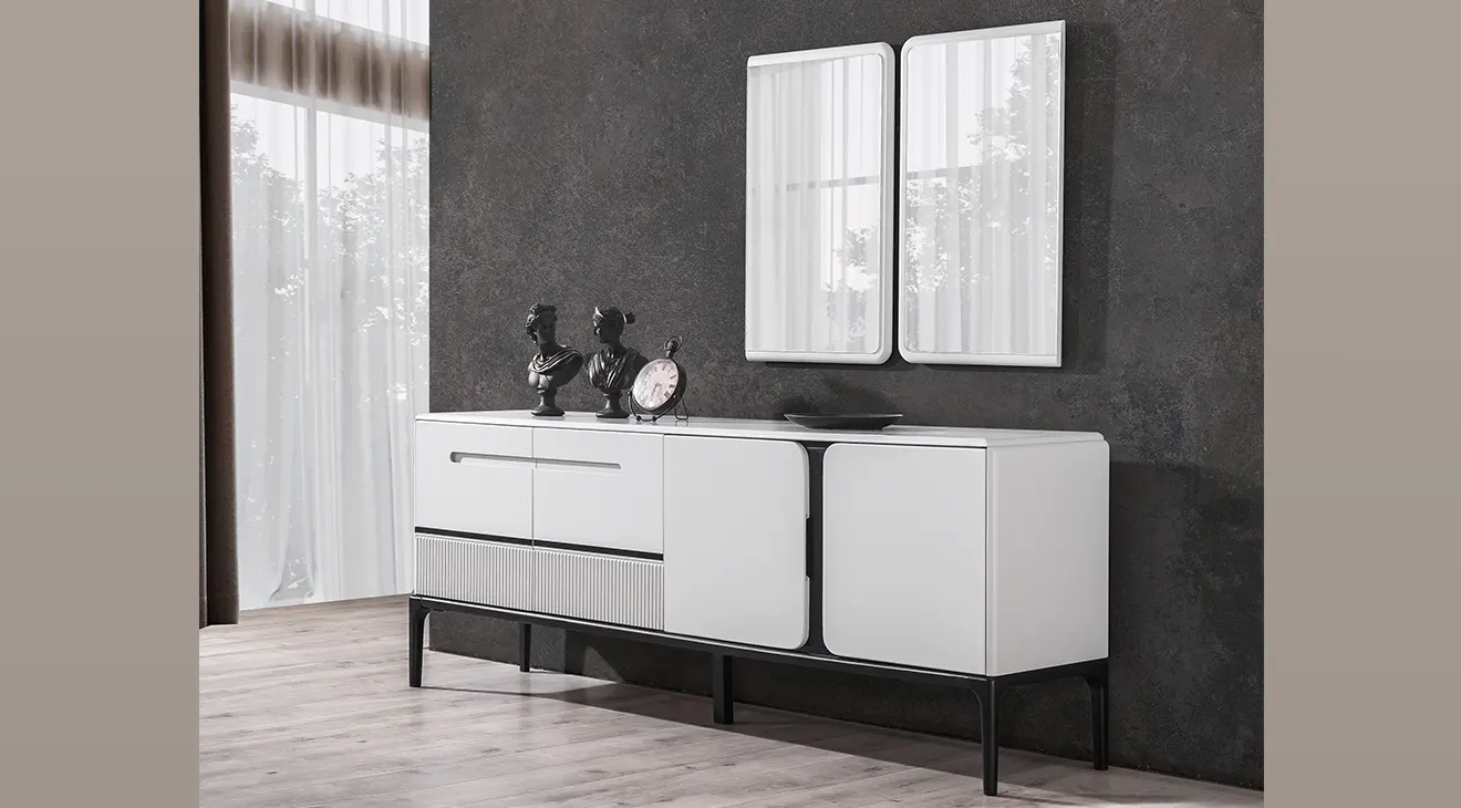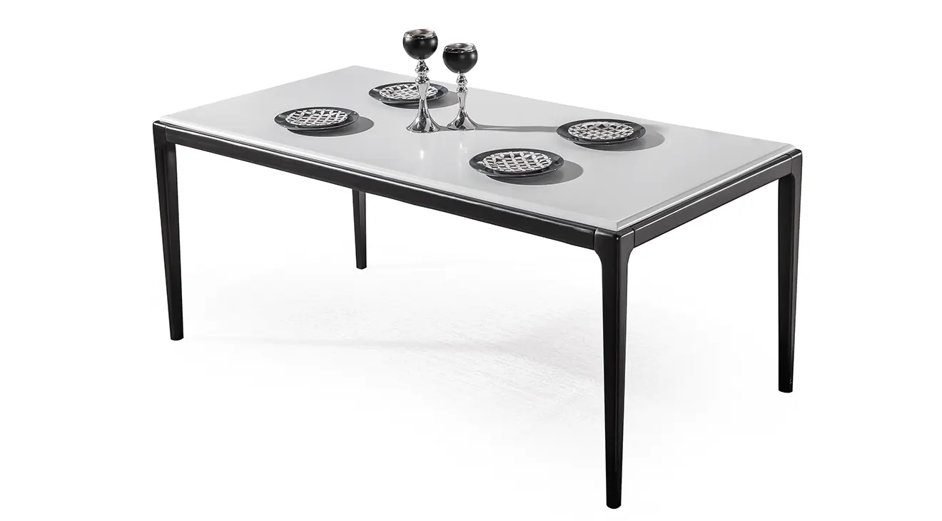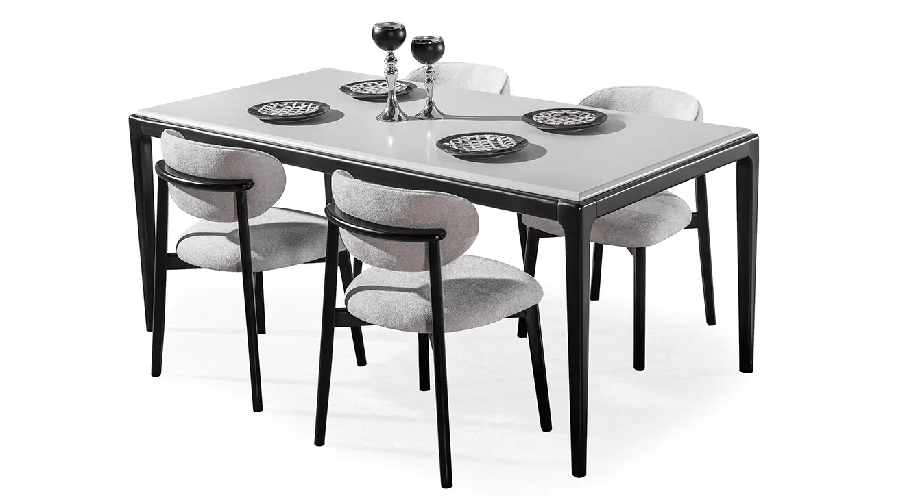 Nirvana Plus yemek odası takımı; siyah metal detaylar, doğal ahşap ayaklar ve minimal beyaz yüzeyiyle modern şıklığı sofranıza taşıyor.