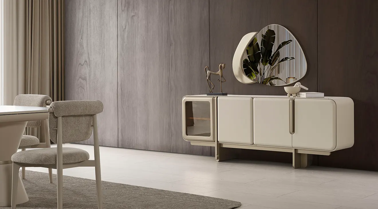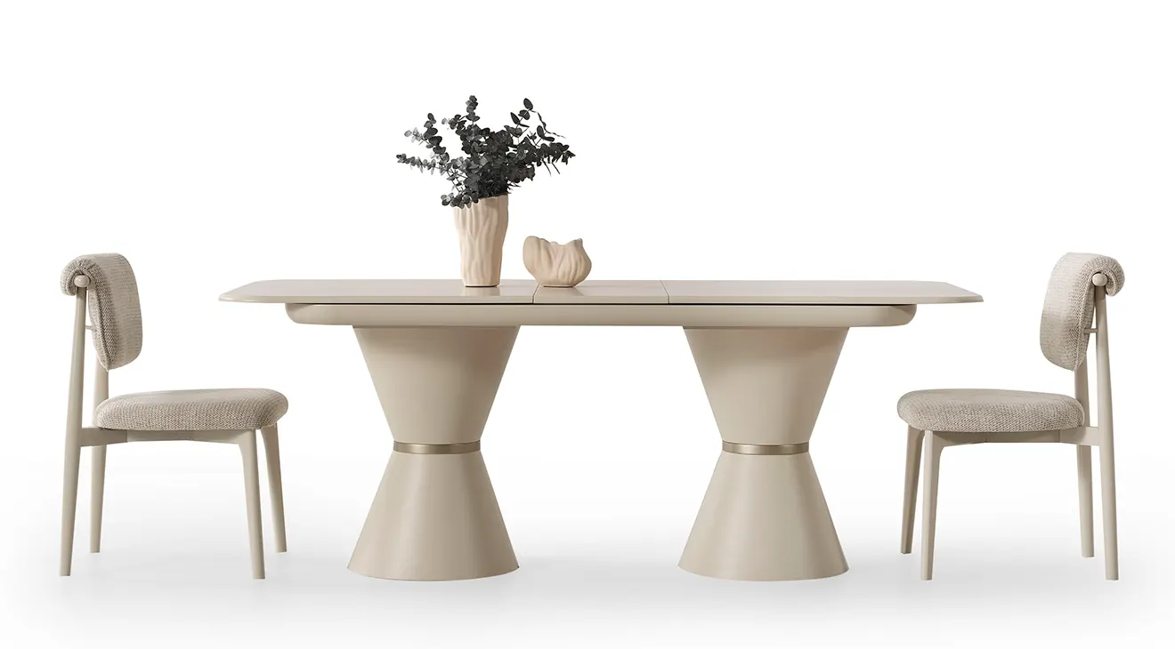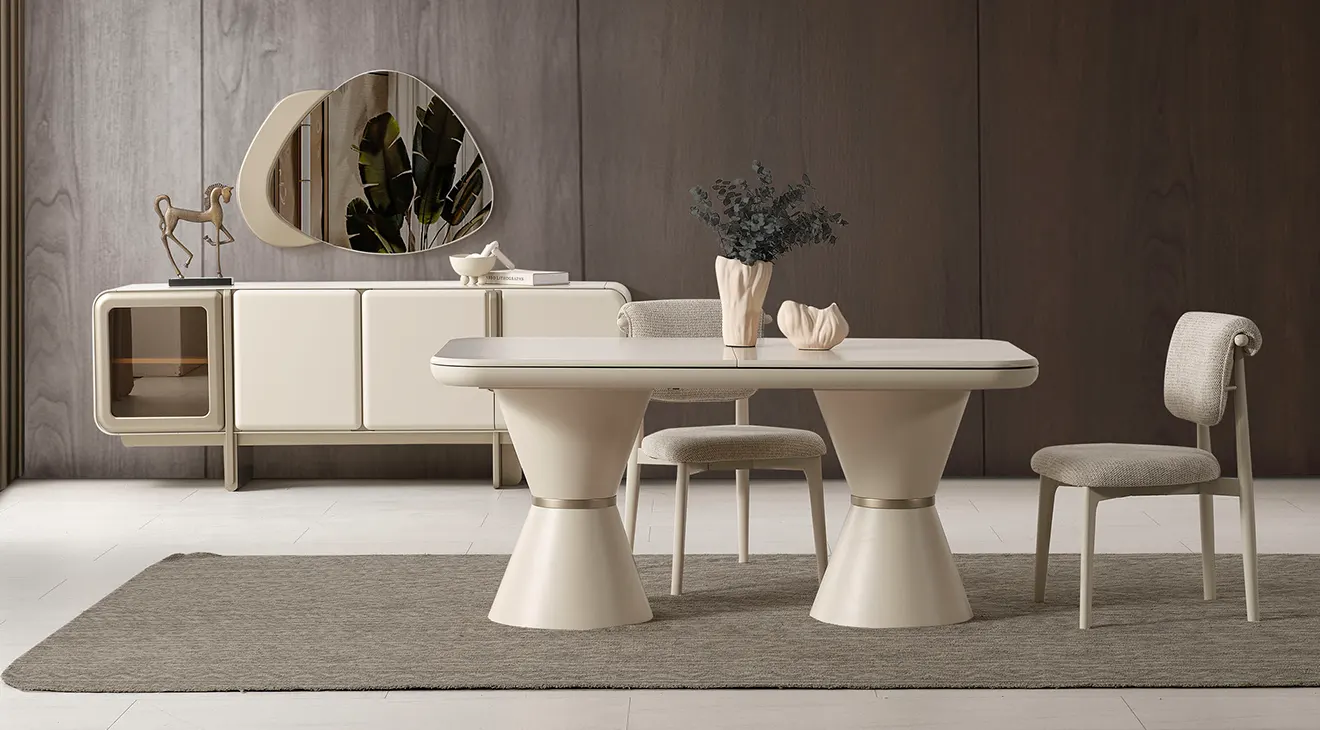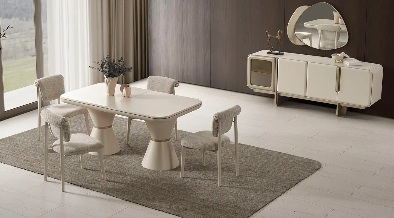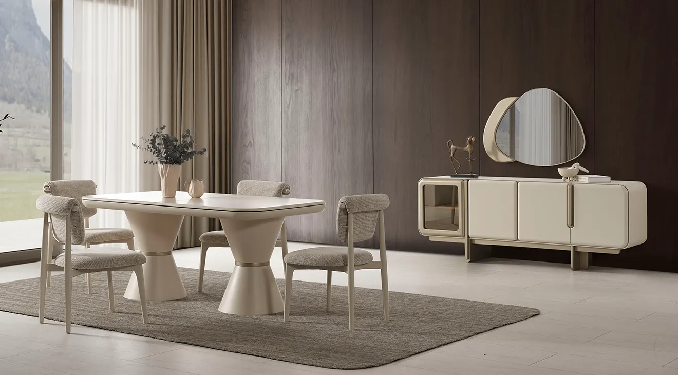 Nova Yemek Odası Takımı; aytaşı tonunda, çift kaideli açılır masa, boucle döşemeli sandalyeler ve cam kapaklı konsoluyla modern İnegöl mobilyası şıklığını ve dayanıklılığını sunar.