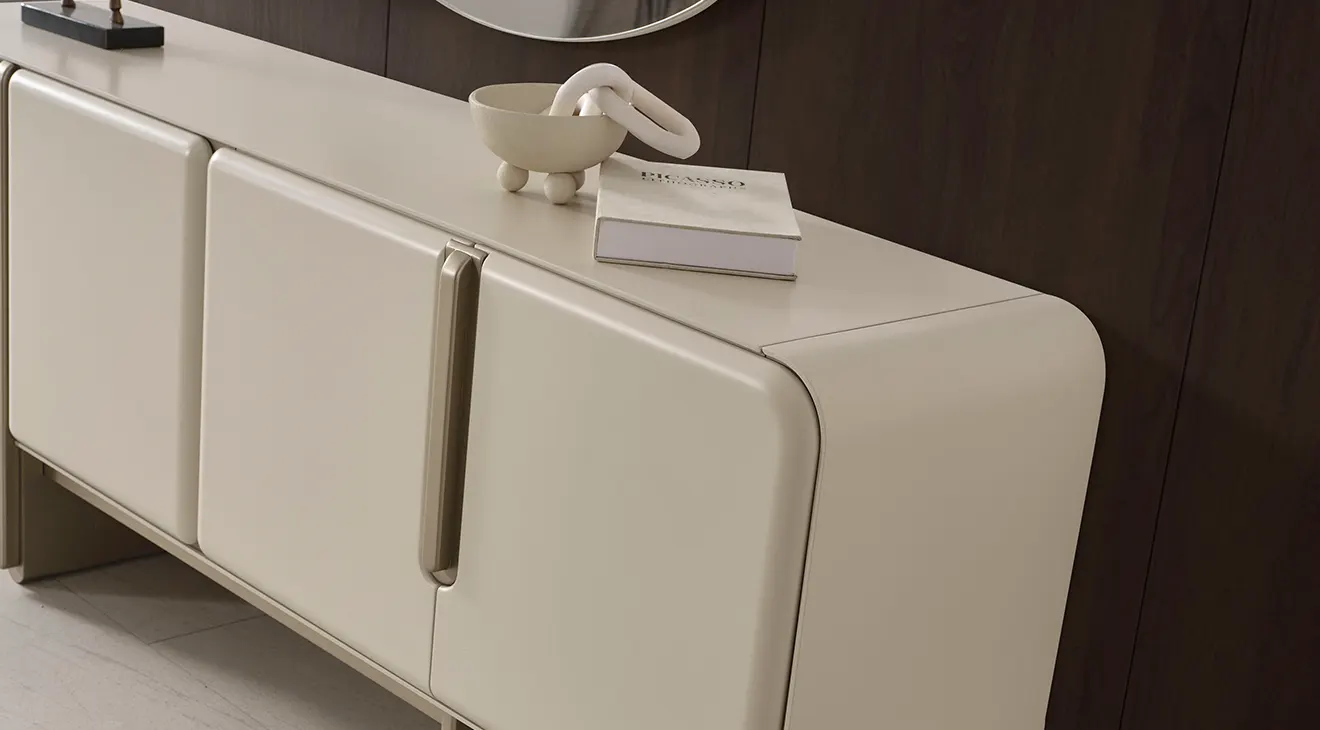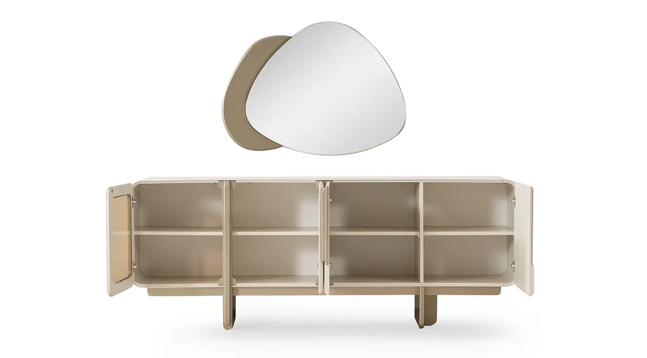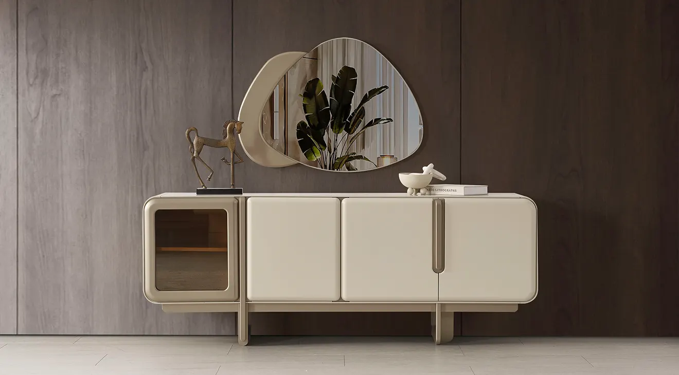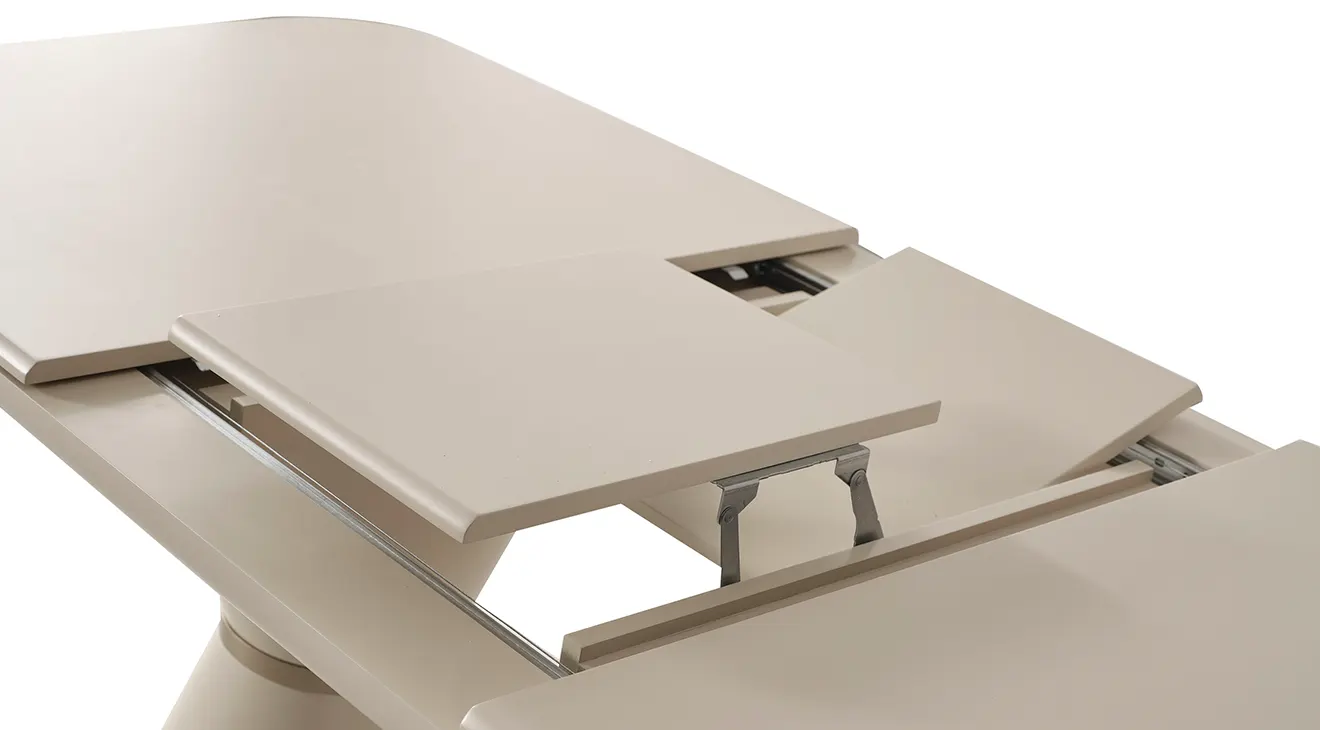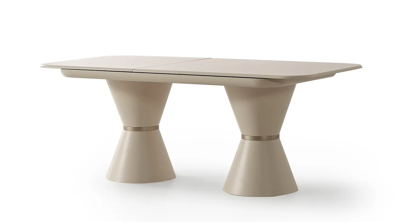 Nova Yemek Odası Takımı; aytaşı tonunda, çift kaideli açılır masa, boucle döşemeli sandalyeler ve cam kapaklı konsoluyla modern İnegöl mobilyası şıklığını ve dayanıklılığını sunar.