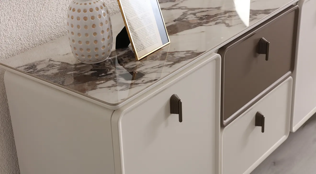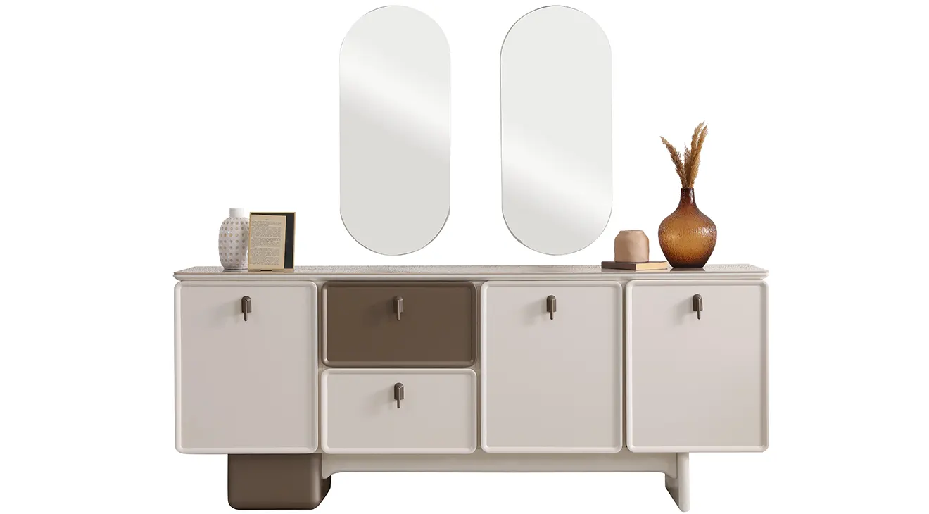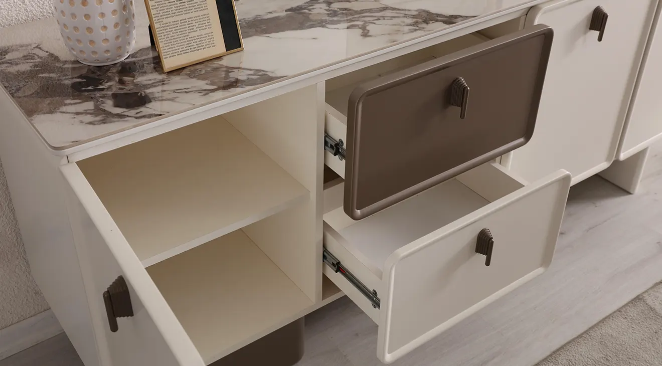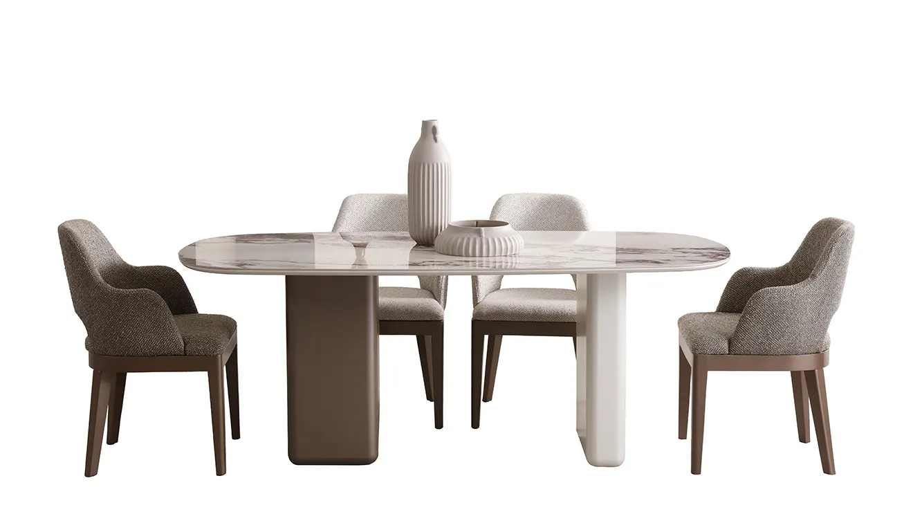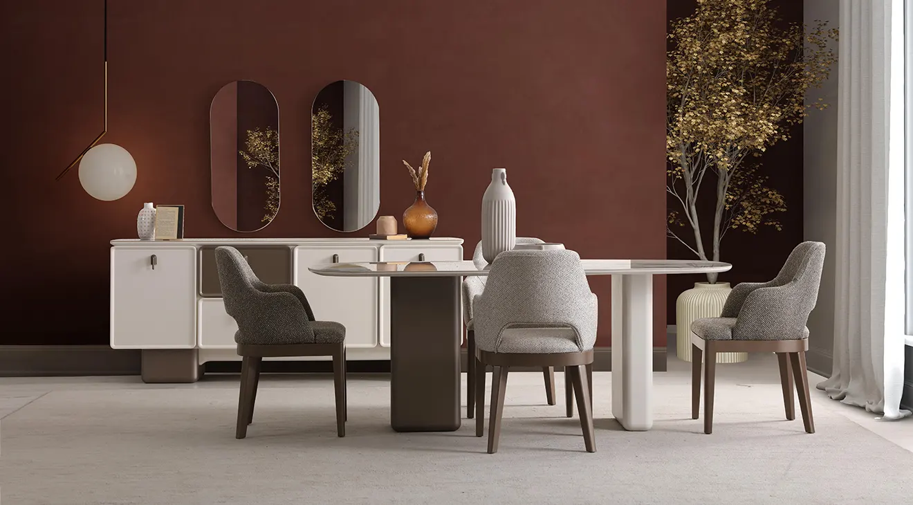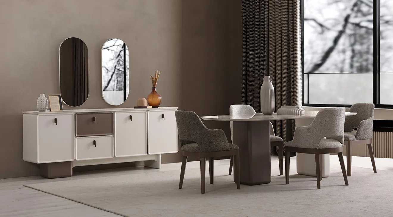Olimpos Modern Yemek Odası Takımı, mermer desenli masa tablası ve iki renkli ayak tasarımıyla mekâna modern bir karakter kazandırır. Ergonomik formlu, kumaş kaplı sandalyeler uzun oturumlarda rahatlık sunarken; konsol ünitesi kapaklı alanları ve çekmeceleriyle servis takımı, masa örtüsü ve günlük eşyalar için düzenli depolama sağlar. Üst tablaya eşlik eden ayna modülleri alanı daha geniş ve aydınlık gösterir; yumuşak köşeler ve sade kulp detaylarıyla takım, hem şık hem de kullanışlı bir yemek alanı oluşturur.