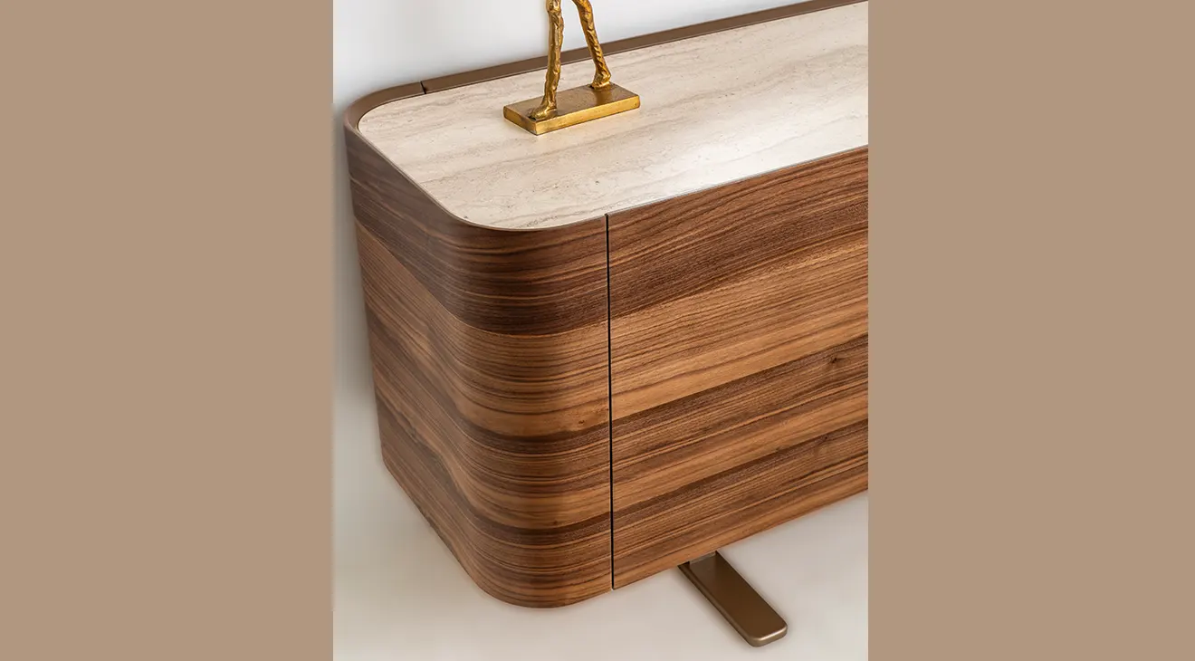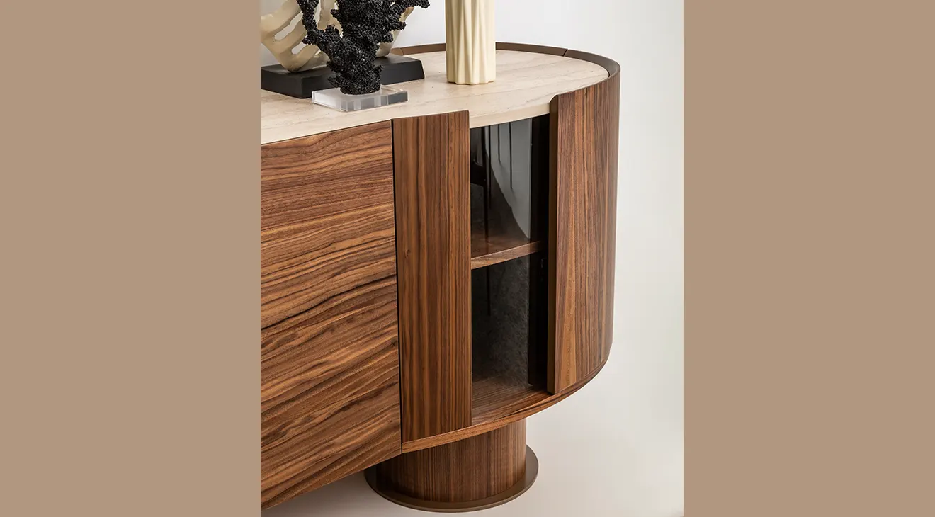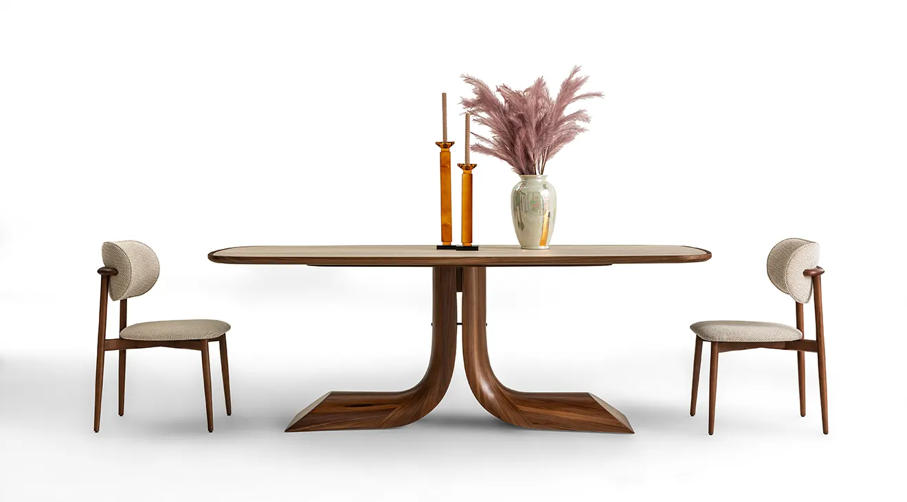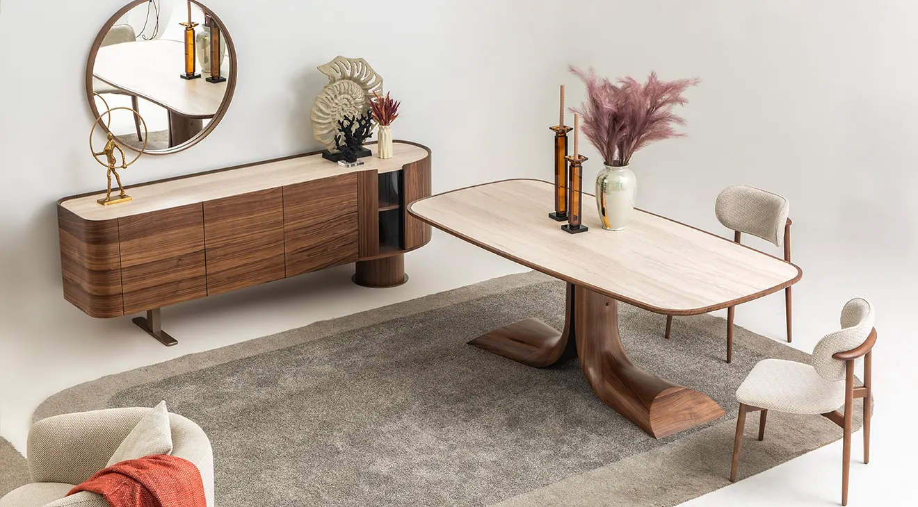 Otto Plus Yemek Odası Takımı, doğal ceviz dokusu modern çizgiyi sıcak bir şıklıkla buluşturuasa kaidesir. Heykelsi m mekâna karakter katar. Geniş depolamalı konsolun cam vitrin bölümü ve yavaşlatıcı donanımları işlevi artırır; ergonomik döşemeli sandalyeler seti tamamlar. Kaliteli malzemeleri ve zarif detaylarıyla uzun ömürlü, zamansız bir yemek alanı yaratır.