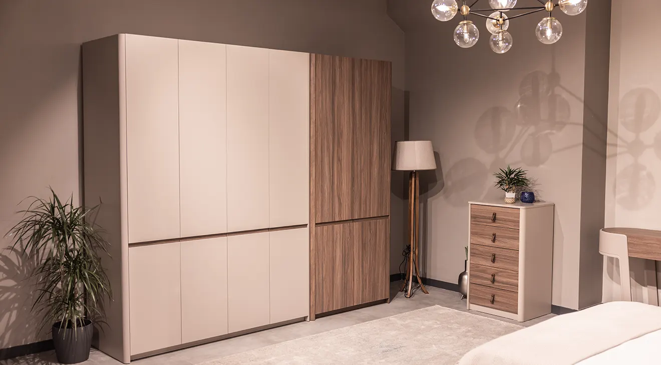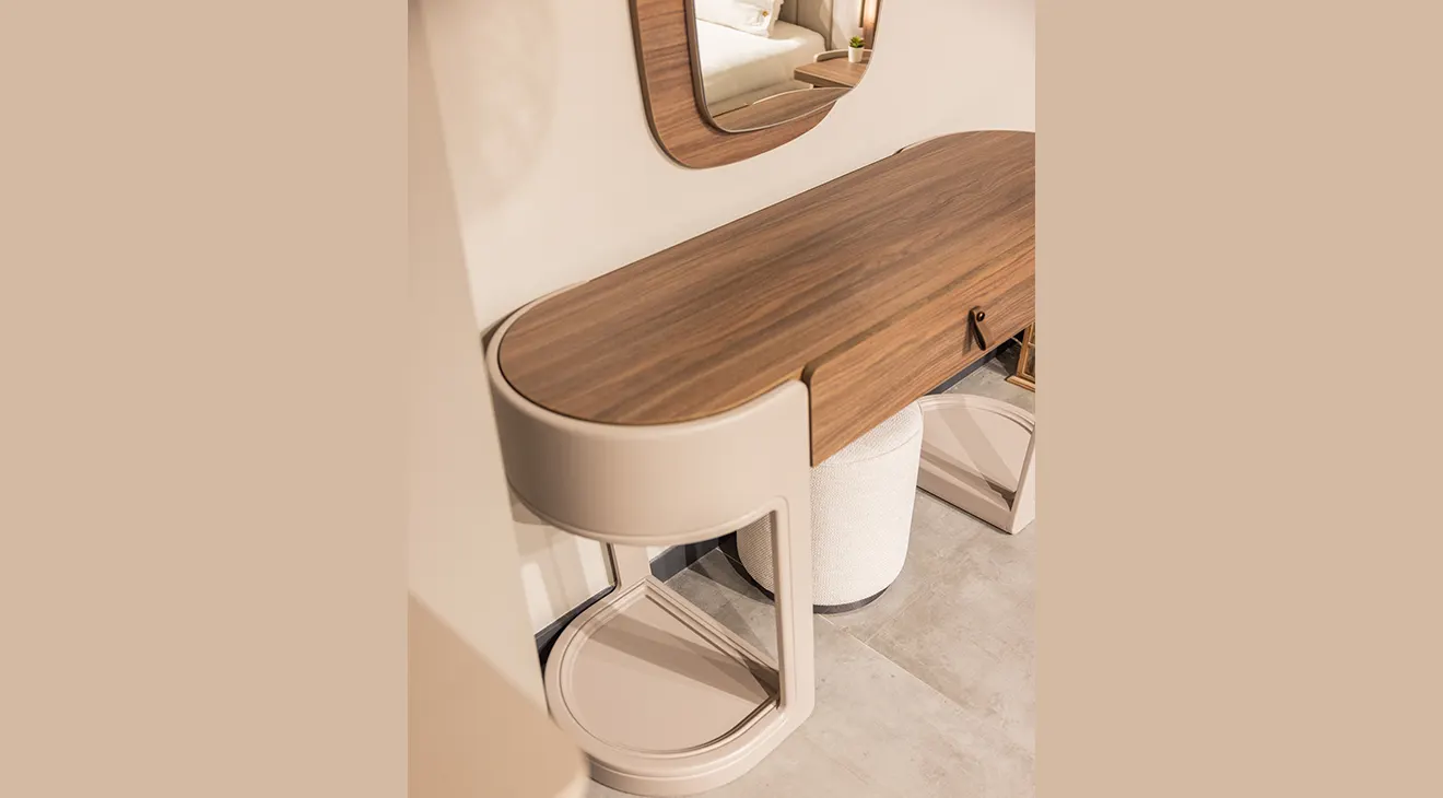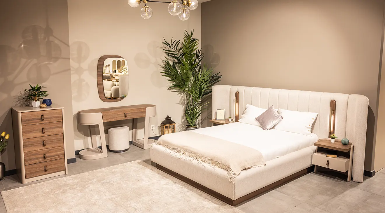 Pablo 6 Kapaklı Modern Yatak Odası Takımı, sıcak bej döşeme ile doğal ceviz dokusunu bir araya getirerek sıcak ve davetkâr bir atmosfer yaratır. Yumuşak pofidik başlık üzerindeki entegre okuma lambaları, gardırobun soft‑close kapakları ve ahşap çekmeceli komodin–şifonyer kombinasyonu, estetiği fonksiyonellikle buluşturur. Oval hatlı makyaj masası ve zarif tabureyle yatak odanızı hem şık hem de huzurlu bir dinlenme alanına dönüştürün.